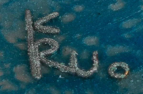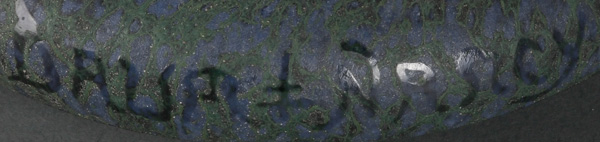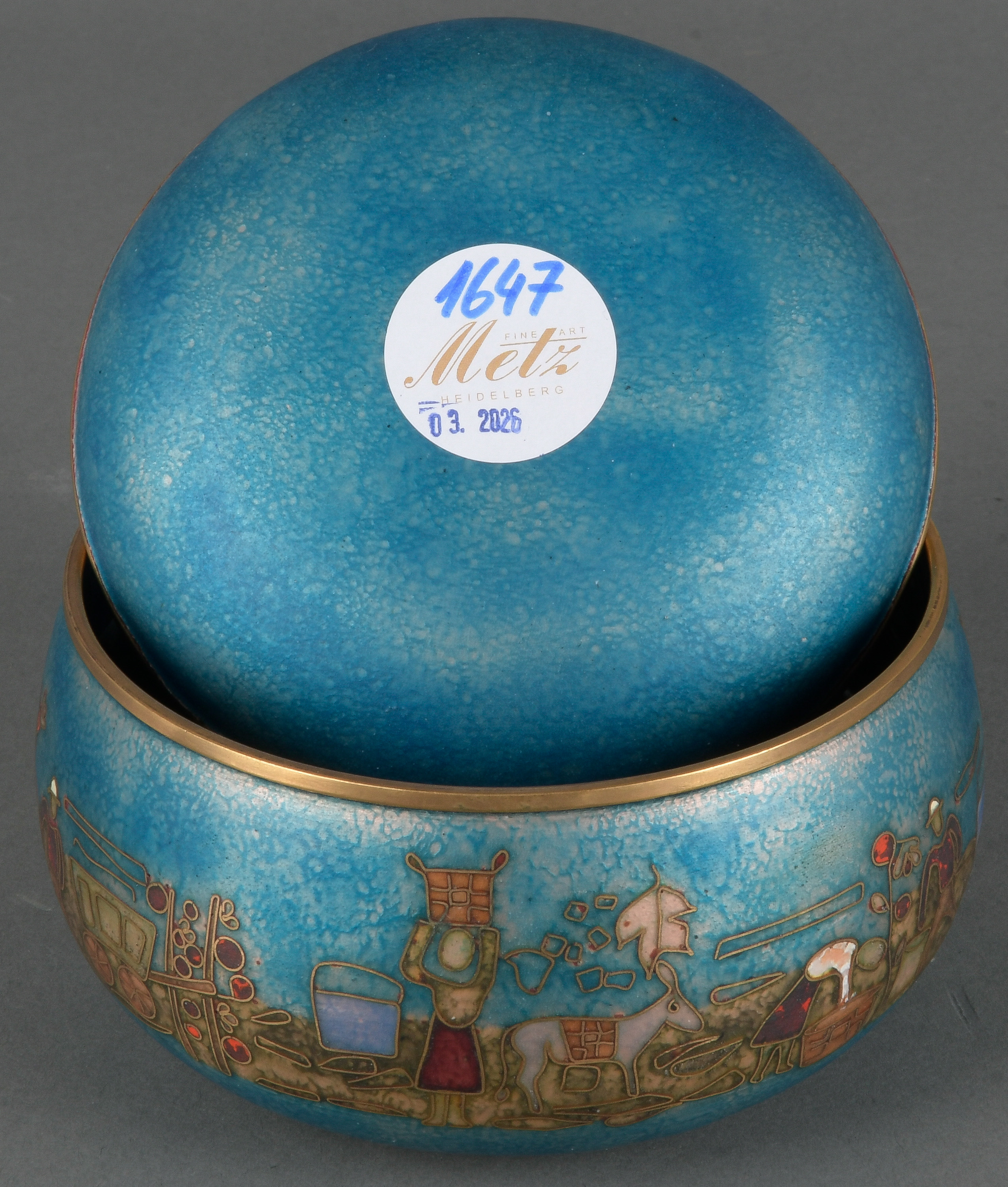 - Katalog-Nr: 1647Käthe Rückenbrod (1905-1989). Runde Deckeldose. Kupferkern, blau emailliert, umlaufend mit Weinleseszenerie; am Boden Künstlermonogramm, H=9,2 cm, D=12,8 cm. (min. best.)o.L.