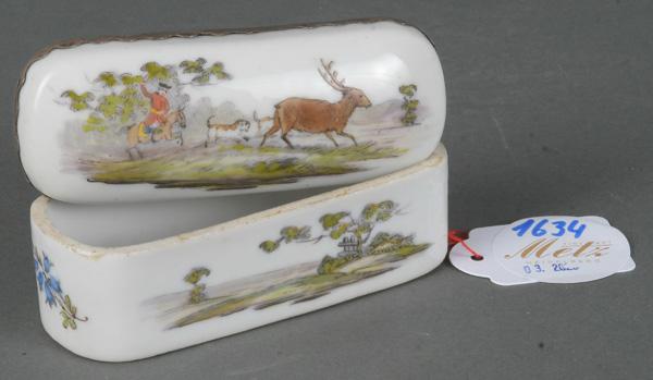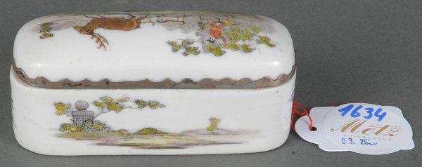 - Katalog-Nr: 1634Deckeldose. Deutsch um 1900. Porzellan, bunt bemalt mit Jagdszenerie, H=4,1 cm, B=9,2 cm, T=3,5 cmo.L.