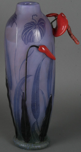 - Katalog-Nr: 1635Hohe Vase. Nancy, Daum. Farbloses Glas, farbig überfangen mit Aufschmelzungen; am Rand bezeichnet, H=41 cm.o.L.