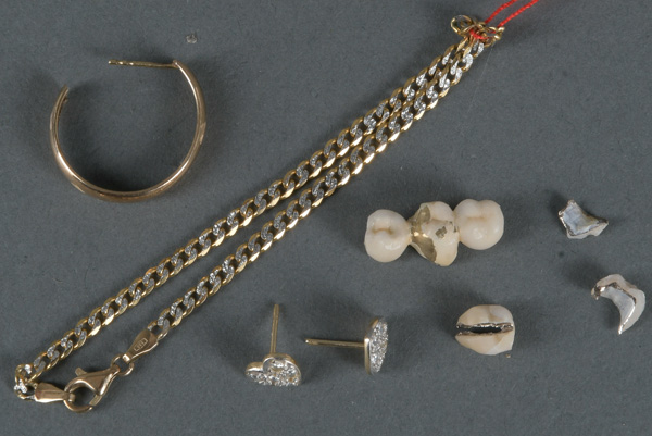 - Katalog-Nr: 1642Konvolut 8 kt Goldschmuck, u.a. Armband und Ohrstecker, sowie Zahngold, ca. 4,6 g.o.L.