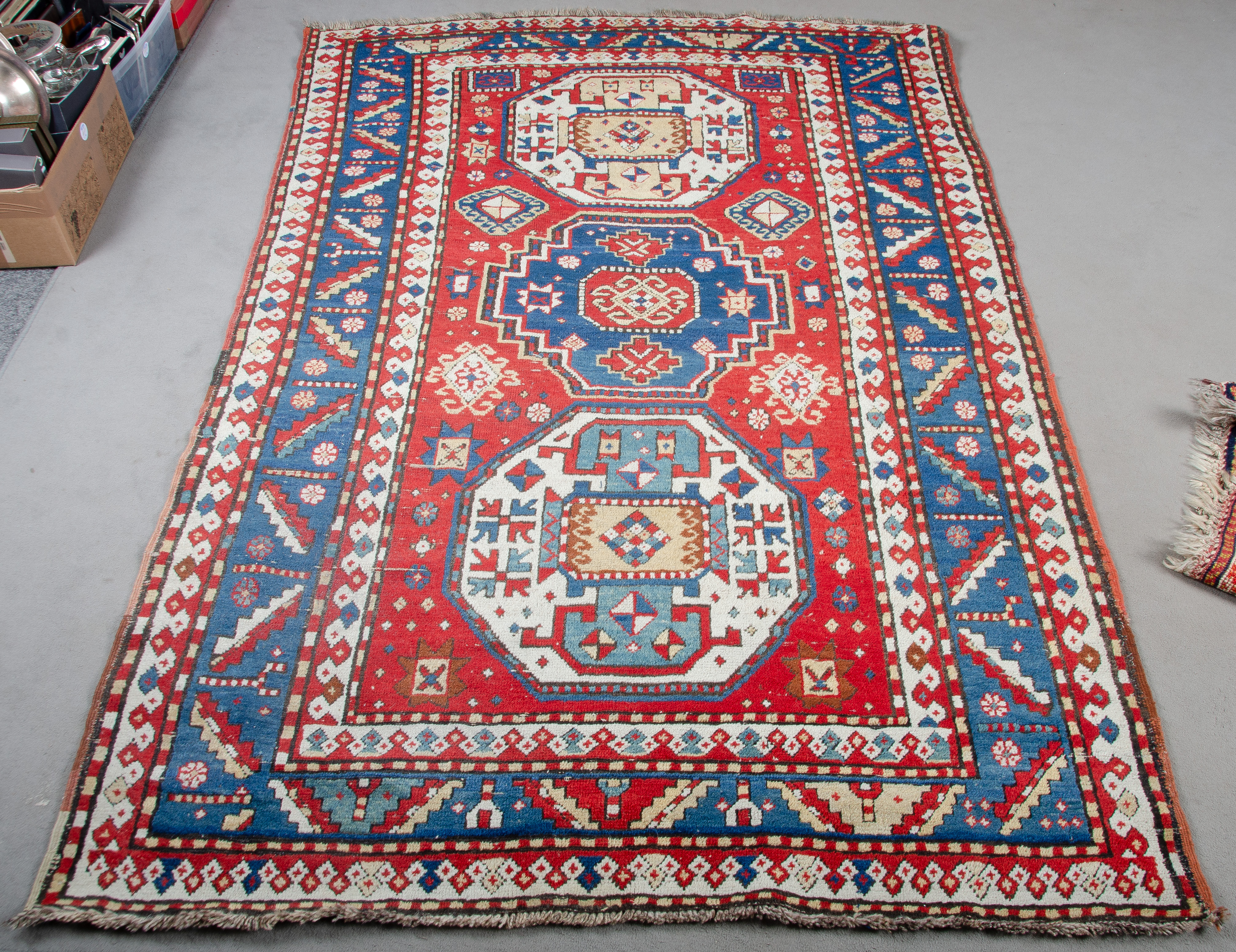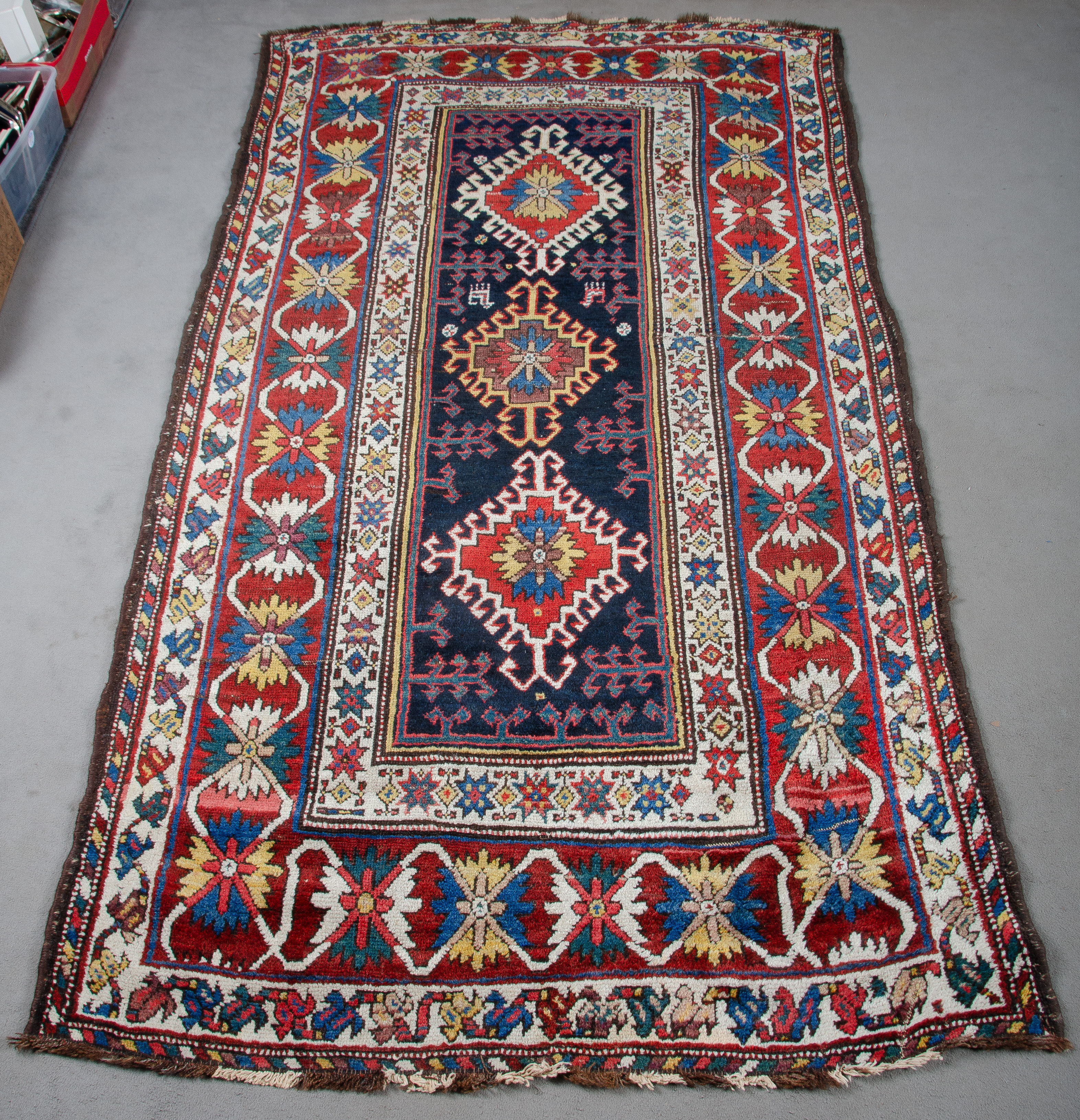 - Katalog-Nr: 1691Zwei kaukasische Brücken und eine Kaschkai-Tasche, 130 x 82 / 68 x 68 / 70 x 53 cm. Zertifikat zu einem Stück der GALERIE OSTLER, München, liegt vor.o.L.