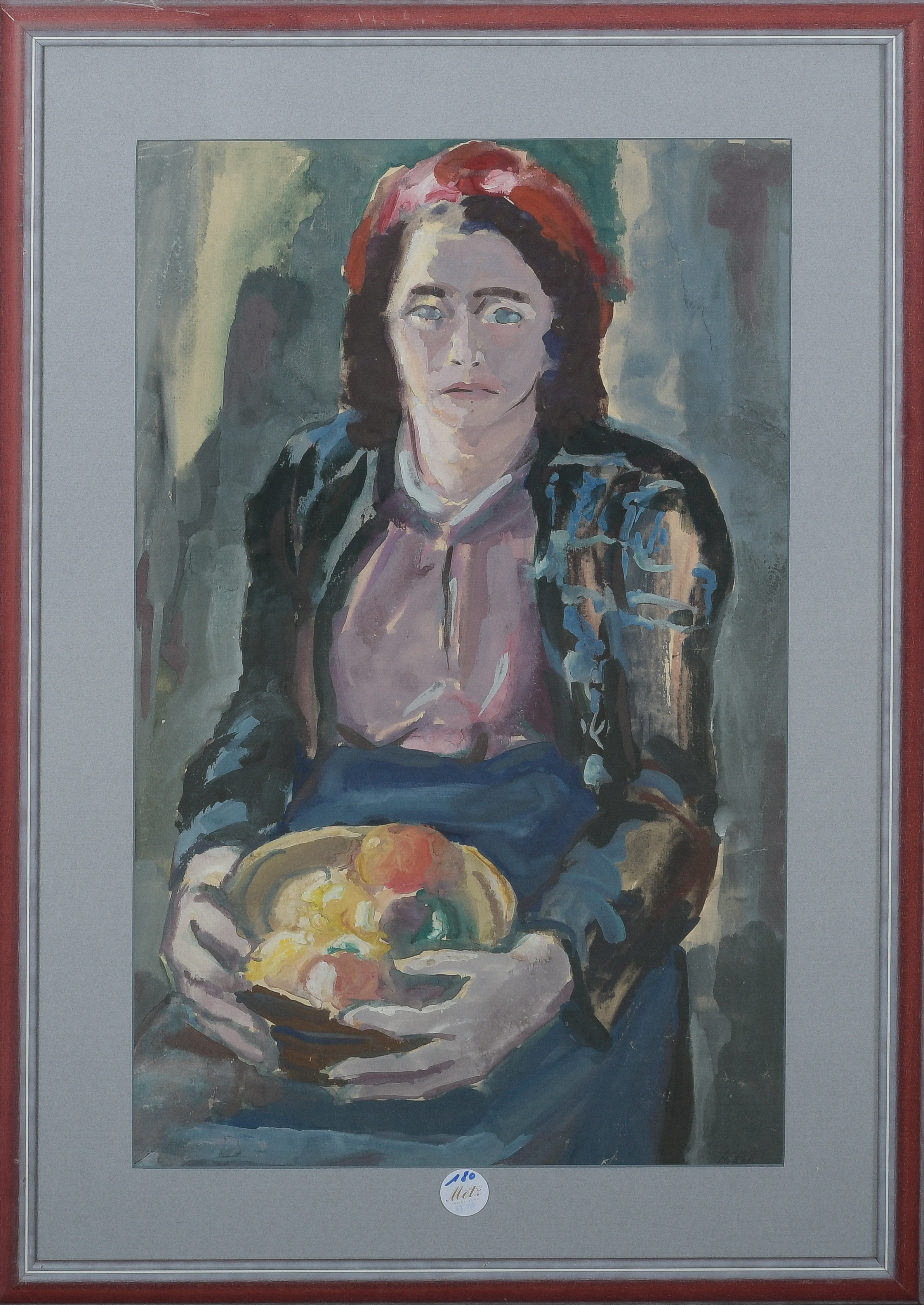 - Katalog-Nr: 180Maler des 20. Jhs. Porträt einer Dame mit Obstkorb. Mischtechnik, re./u. unleserlich monogr., mit Passepartout hi./Gl. gerahmt, 65 x 40 cm.o.L.