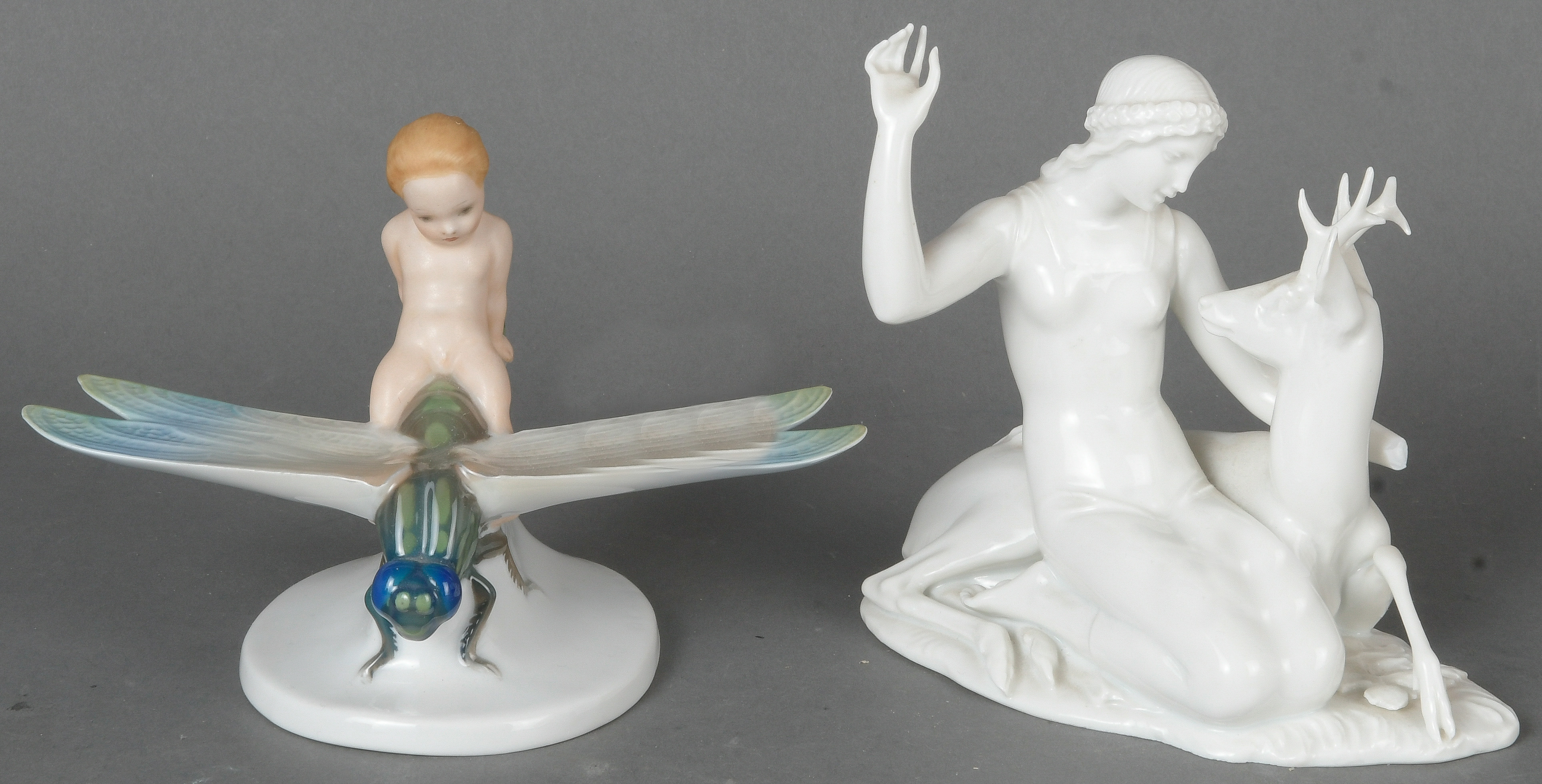 - Katalog-Nr: 189Libellenreiter und Jagdgöttin Diana. Rosenthal 20. Jh. Porzellan, bunt bemalt / weiß glasiert, Entwurf und sign. T.(heodor) Kärner / Karl Himmelstoss, H=9,9 / 11,5 cm. (besch.)o.L.