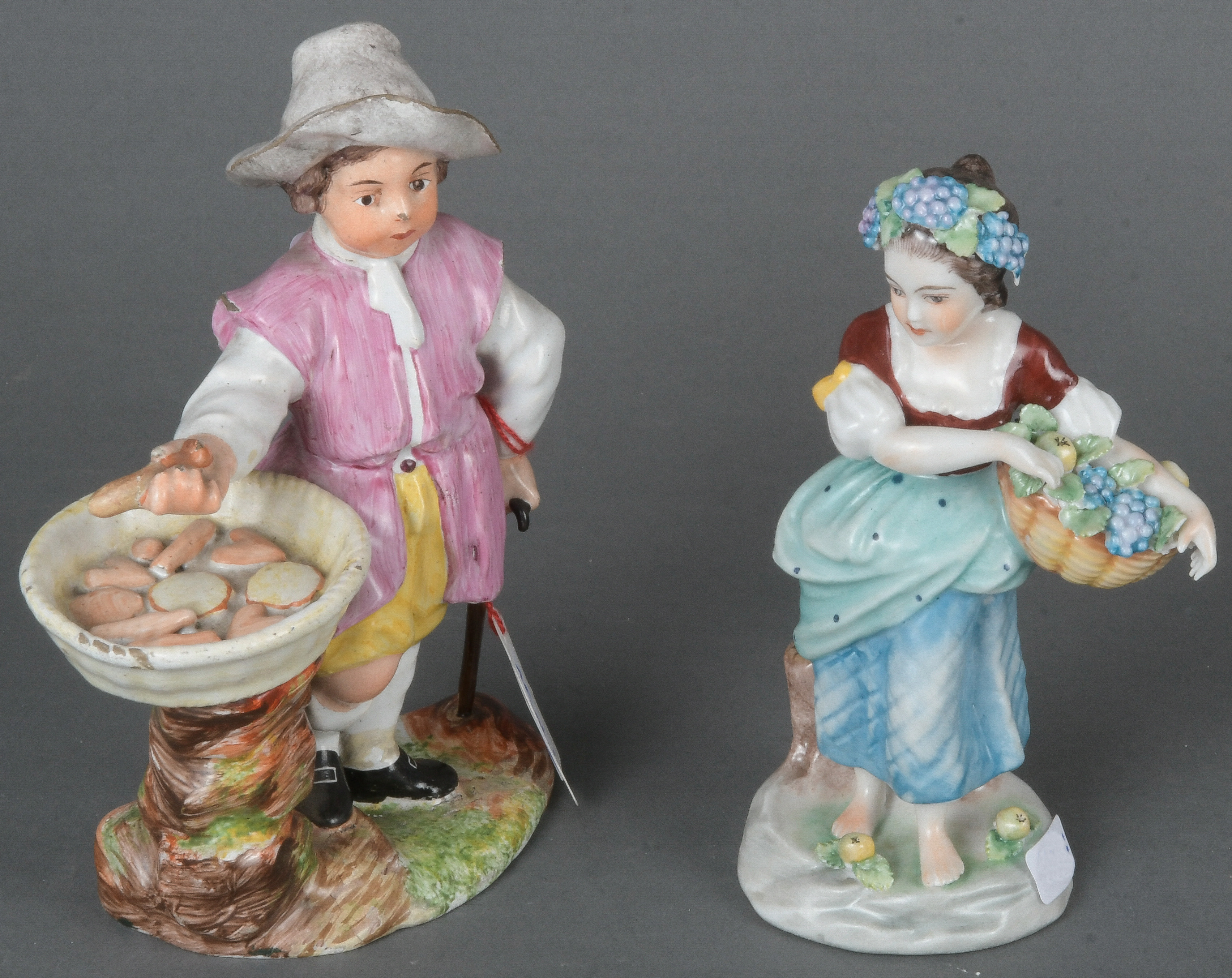 - Katalog-Nr: 191Der „Herbst“ und Gebäckverkäufer. Thüringen 20. Jh. Fayence / Porzellan, bunt bemalt, H=13,7 / 15,5 cm. (best.)o.L.