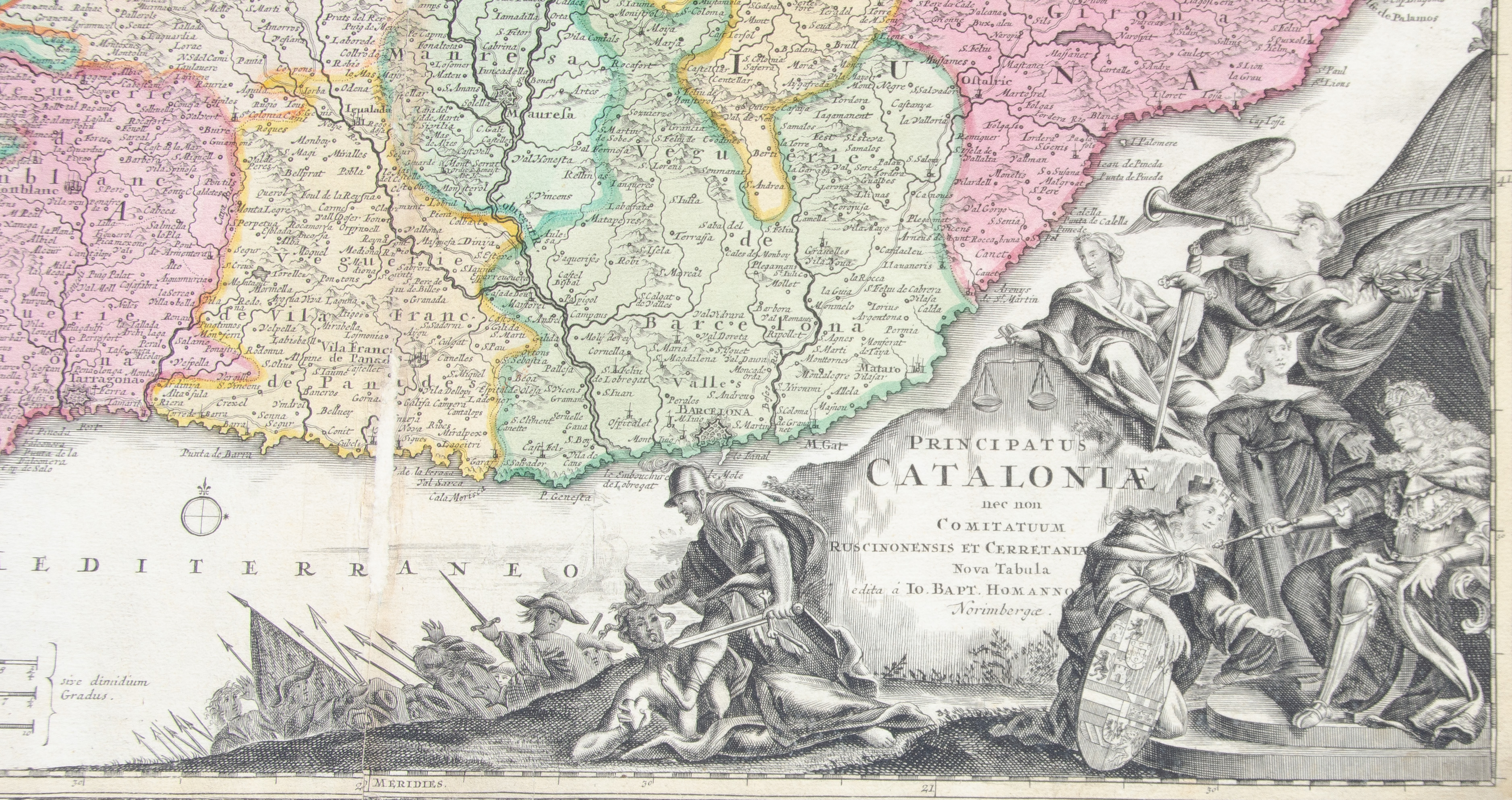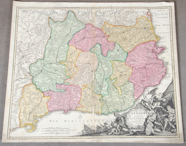 - Katalog-Nr: 193Johann Baptista Homann (1664-1724). Karte von Katalonien. Colorierter Kupferstich mit Wappenkartusche, re./u./sign., 47 x 55 cm. (mittig mit leichten Abreibungen)o.L.
