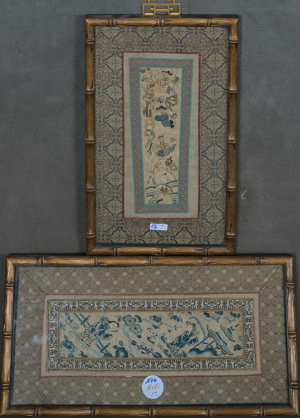 - Katalog-Nr: 176Bildsticker des 20. Jhs. Zwei bunte Seidenstickereien mit Personen in Landschaft und Gebäuden, 9,5 x 29 / 24,5 x 8,5 cm.o.L.