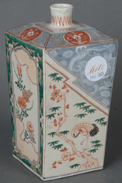 - Katalog-Nr: 187Sakeflasche. Japan, Edo-Zeit. Porzellan, bunt bemalt mit den Symbolen für ein langes Leben Kranich, Chrysantheme und Bambus; ohne Marke, H=21 cm.o.L.