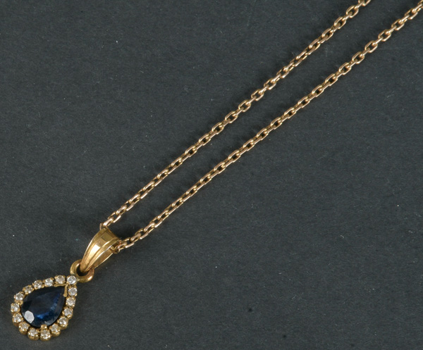- Katalog-Nr: 198Halskette mit Anhänger. 14 kt Gold, besetzt mit Saphir und Brillanten, ca. 0,15 ct, Gesamtgewicht ca. 7,36 g, L=46 cm. Die Begutachtungen der verarbeiteten Edelsteine und Diamanten wurden im gefassten Zustand vorgenommen, d.h. unter Vorbehalt einer sachgerechten Graduierung, die nur an ungefassten Steinen erfolgen kann. Dies hat zur Folge, dass die Gewichte (sog. "berechnete Gewichte", d.h. ca.+/- 10 % Abweichung) und Qualitäten (Farbe, Reinheit und Schliff) der Steine nur annähernd angegeben werden können.o.L.