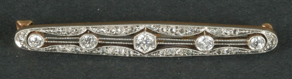- Katalog-Nr: 200Brosche. 14 kt Gold, besetzt mit Brillanten und Diamanten, ca. 0,60 ct, Gesamtgewicht, ca. 4,6 g. Die Begutachtungen der verarbeiteten Edelsteine und Diamanten wurden im gefassten Zustand vorgenommen, d.h. unter Vorbehalt einer sachgerechten Graduierung, die nur an ungefassten Steinen erfolgen kann. Dies hat zur Folge, dass die Gewichte (sog. "berechnete Gewichte", d.h. ca.+/- 10 % Abweichung) und Qualitäten (Farbe, Reinheit und Schliff) der Steine nur annähernd angegeben werden können.o.L.