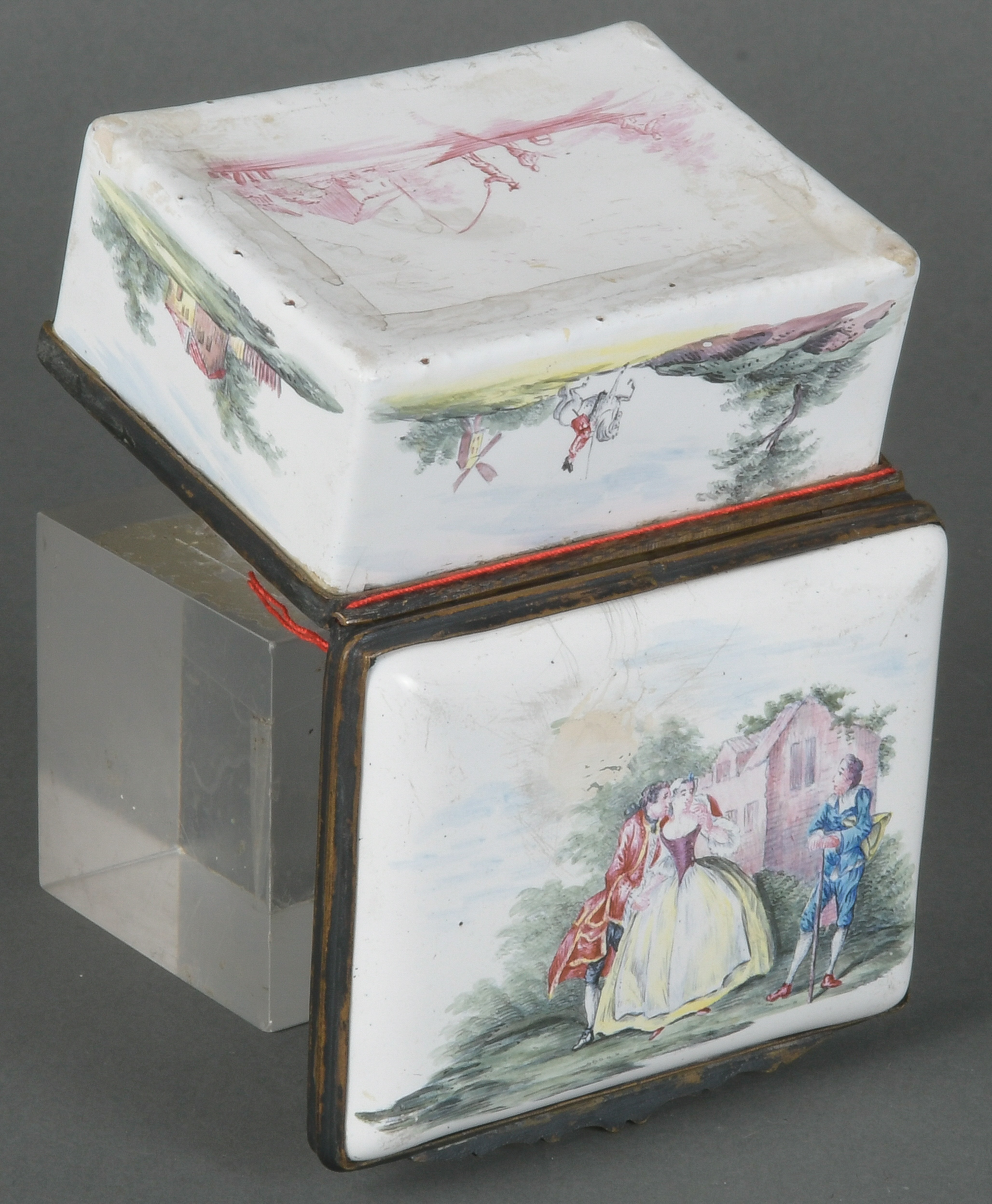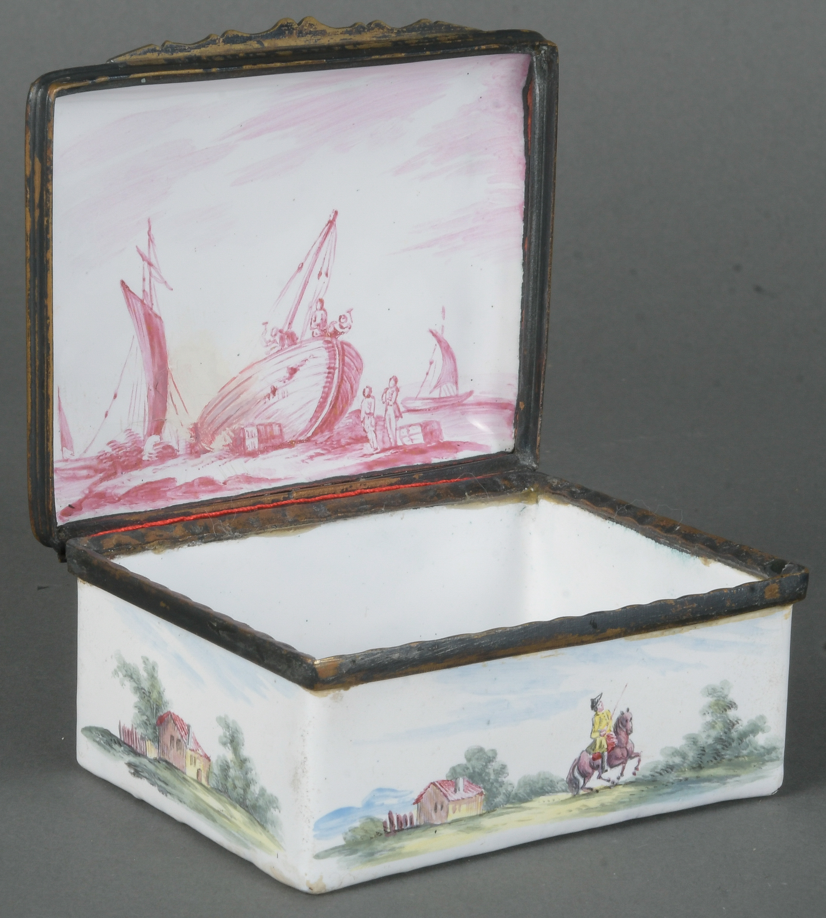 - Katalog-Nr: 201Tabatière. England 18. Jh. Kupfer, emailliert, purpur und bunt bemalt, H=4,2 cm, B=8,5 cm, T=7,1 cm.o.L.
