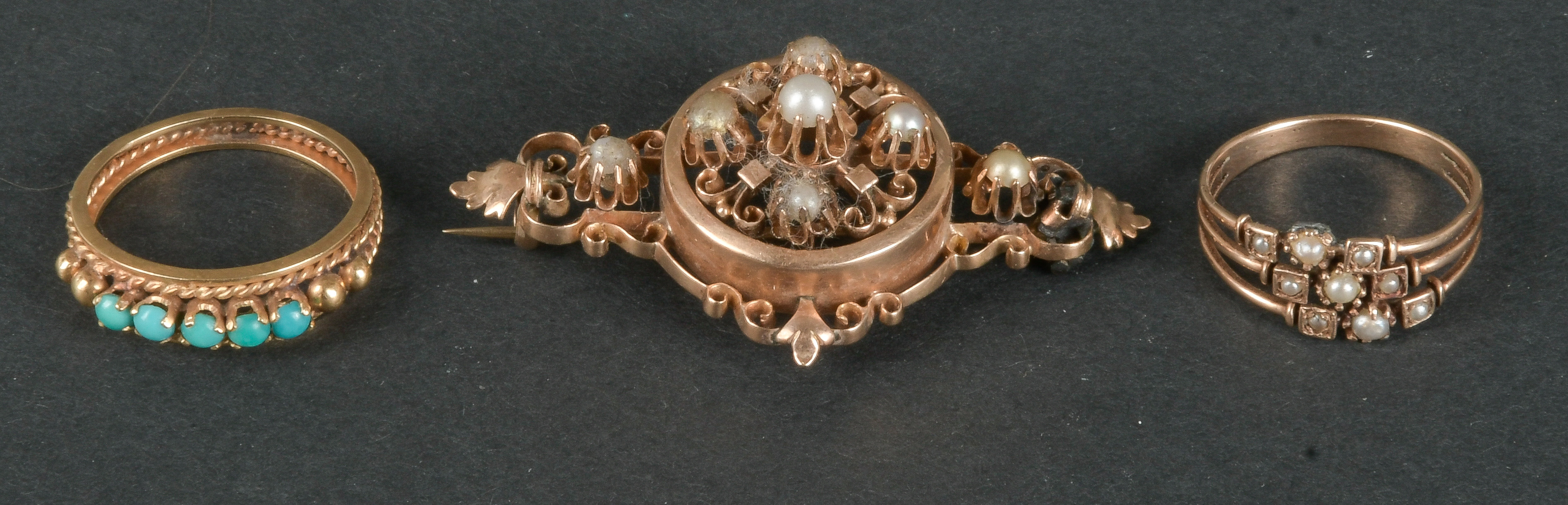 - Katalog-Nr: 202Eine Brosche und zwei Damenringe. 14 kt Gold, besetzt mit Perlen bzw. Türkisen, Gesamtgewicht ca. 10,4 g, Ringgröße 51 / 53.o.L.