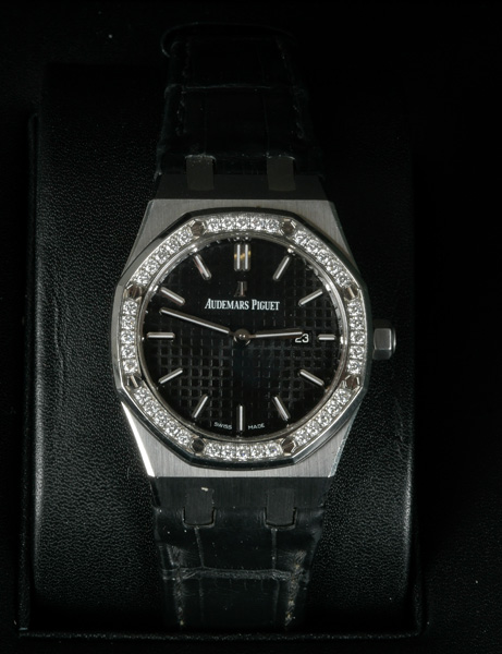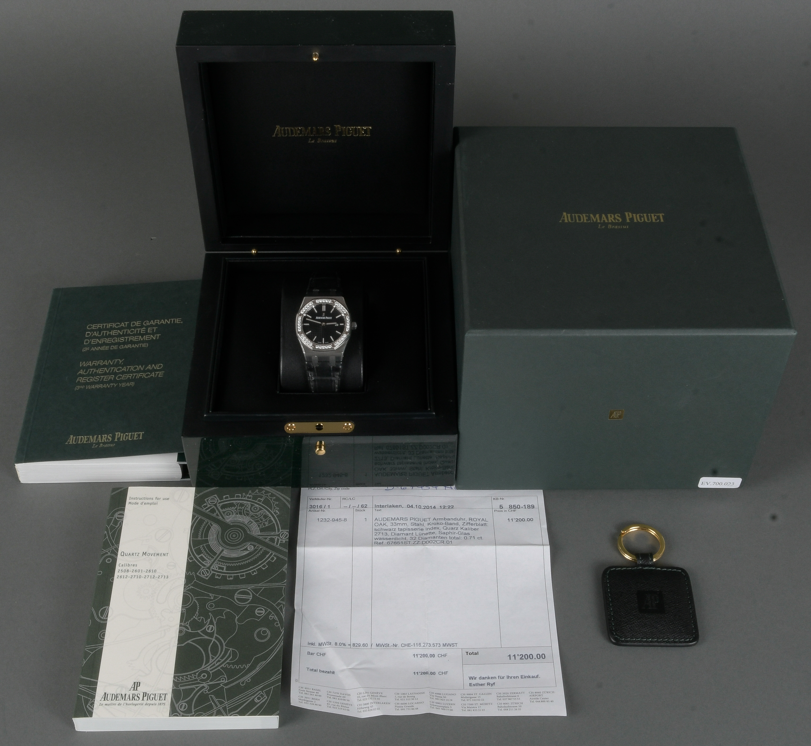 - Katalog-Nr: 205Damenarmbanduhr „Audemars Piguet“, besetzt mit Diamanten, ca. 0,71 ct, mit Quartzwerk. In Originalkasten mit Papieren und Rechnung über SFR 11.200,00. (Funktion ungeprüft) Die Begutachtungen der verarbeiteten Edelsteine und Diamanten wurden im gefassten Zustand vorgenommen, d.h. unter Vorbehalt einer sachgerechten Graduierung, die nur an ungefassten Steinen erfolgen kann. Dies hat zur Folge, dass die Gewichte (sog. "berechnete Gewichte", d.h. ca.+/- 10 % Abweichung) und Qualitäten (Farbe, Reinheit und Schliff) der Steine nur annähernd angegeben werden können.o.L.