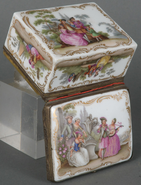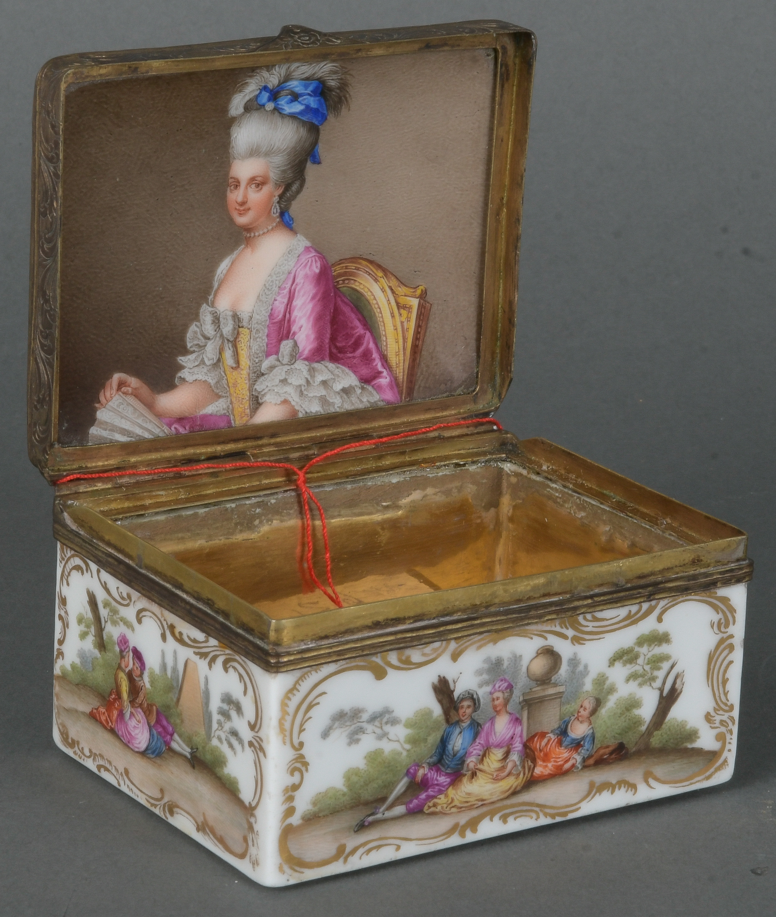 - Katalog-Nr: 208Tabatière. Deutsch 19. Jh. Porzellan, bunt bemalt mit Watteauszene in Parklandschaft, auf der Innenseite des Deckels mit Damenporträt, H=4,7 cm, B=7,9 cm, T=6,3 cm.o.L.