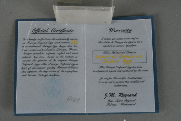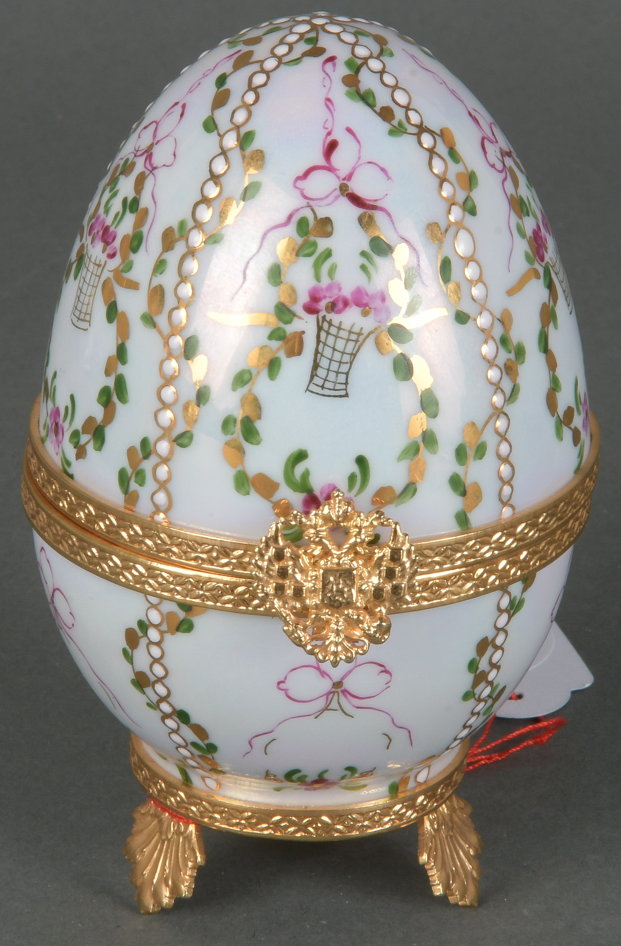 - Katalog-Nr: 209Zierei im Stil von Fabergé. Porzellan, mit vergoldeter Montur (H=10,7 cm, D=8 cm), mit Zertifikat von Jean-Marie Reynaud, Werkmeister von Fabergé.o.L.