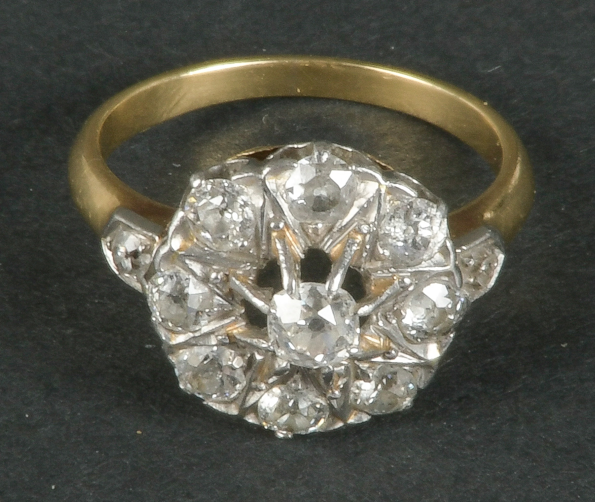 - Katalog-Nr: 212Damenring. 18 kt Gold, besetzt mit Altschliff-Brillant, ca. 1,10 ct, Gesamtgewicht ca. 4,5 g, Ringgröße 53. Die Begutachtungen der verarbeiteten Edelsteine und Diamanten wurden im gefassten Zustand vorgenommen, d.h. unter Vorbehalt einer sachgerechten Graduierung, die nur an ungefassten Steinen erfolgen kann. Dies hat zur Folge, dass die Gewichte (sog. "berechnete Gewichte", d.h. ca.+/- 10 % Abweichung) und Qualitäten (Farbe, Reinheit und Schliff) der Steine nur annähernd angegeben werden können.o.L.