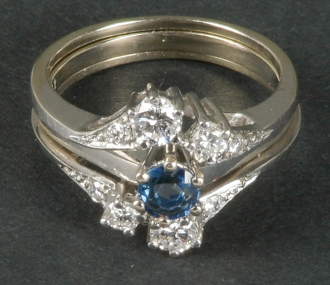 - Katalog-Nr: 216Damenring. 14 kt Gold, besetzt mit Saphir und Brillanten, ca. 0,42 ct, Gesamtgewicht ca. 5,9 g, Ringgröße 53. Die Begutachtungen der verarbeiteten Edelsteine und Diamanten wurden im gefassten Zustand vorgenommen, d.h. unter Vorbehalt einer sachgerechten Graduierung, die nur an ungefassten Steinen erfolgen kann. Dies hat zur Folge, dass die Gewichte (sog. "berechnete Gewichte", d.h. ca.+/- 10 % Abweichung) und Qualitäten (Farbe, Reinheit und Schliff) der Steine nur annähernd angegeben werden können.o.L.