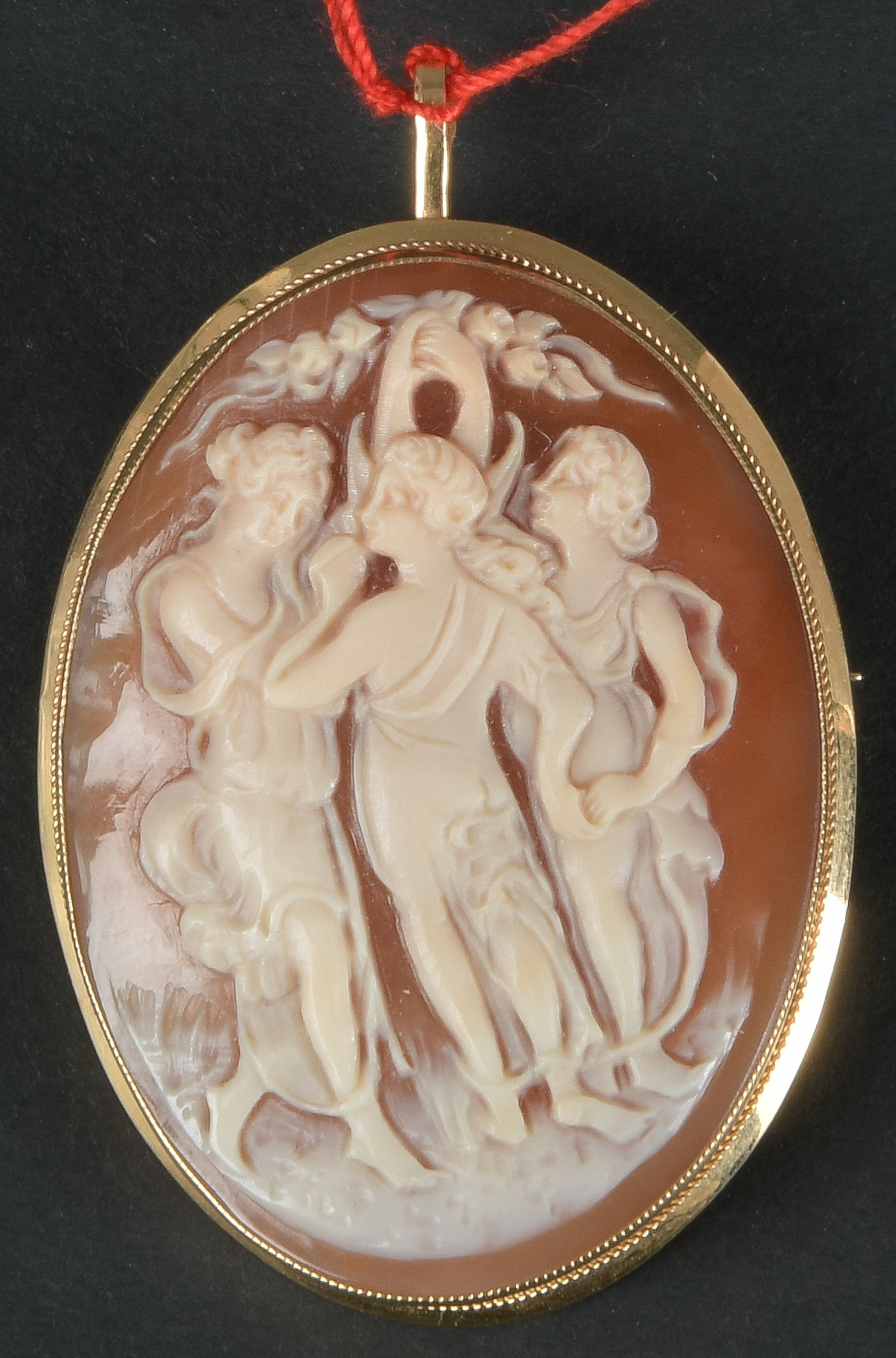- Katalog-Nr: 223Anhänger-Brosche und Damenring. 18 kt Gold, besetzt mit Muschelcamée, Gesamtgewicht ca. 14,5 g, Ringgröße 53.o.L.
