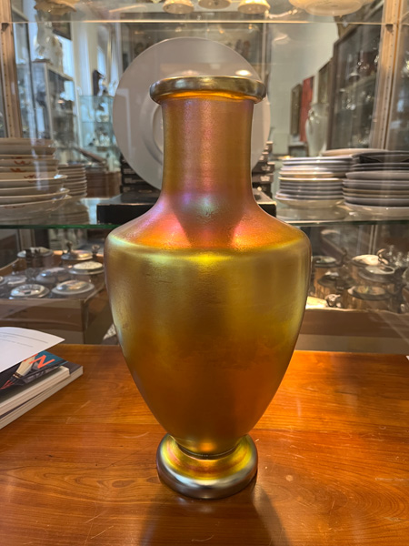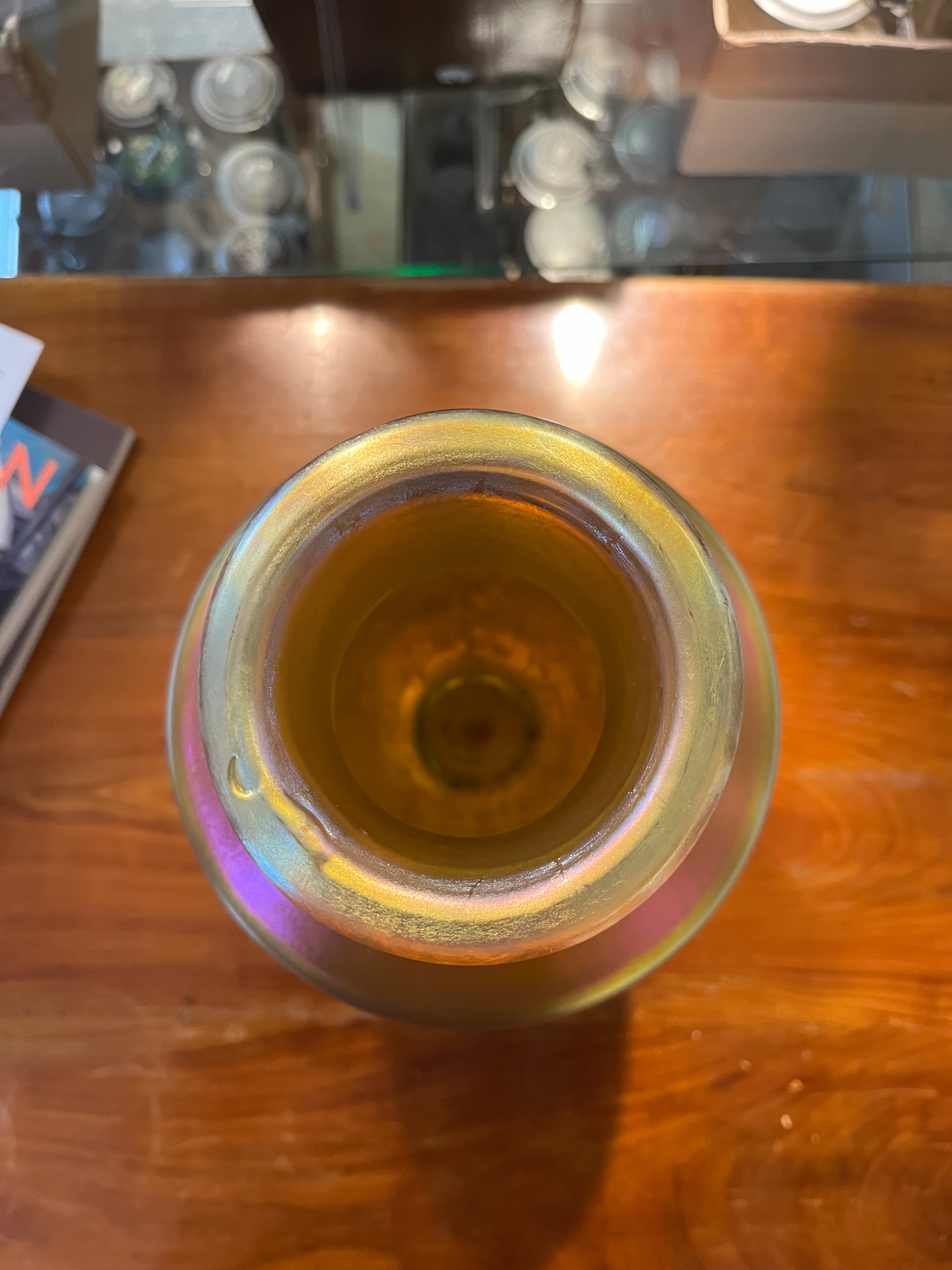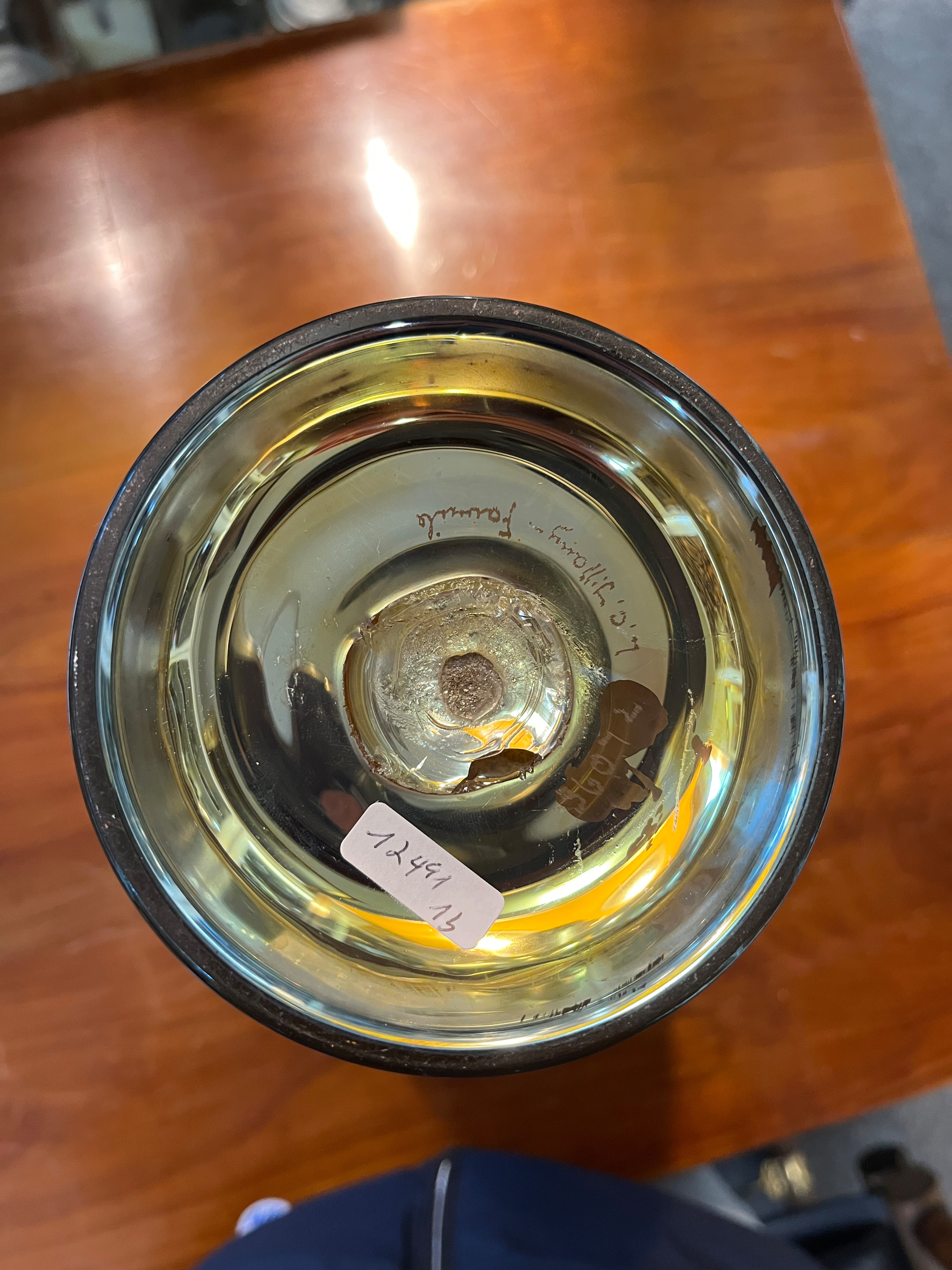- Katalog-Nr: 48Hohe Jugendstil-Vase. New York, Louis Comfort Tiffany um 1900. Farbloses Glas, lachsfarben lüstrierend überfangen; am Boden Ätzsignatur und Nr. „36042“, H=39 cm.o.L.