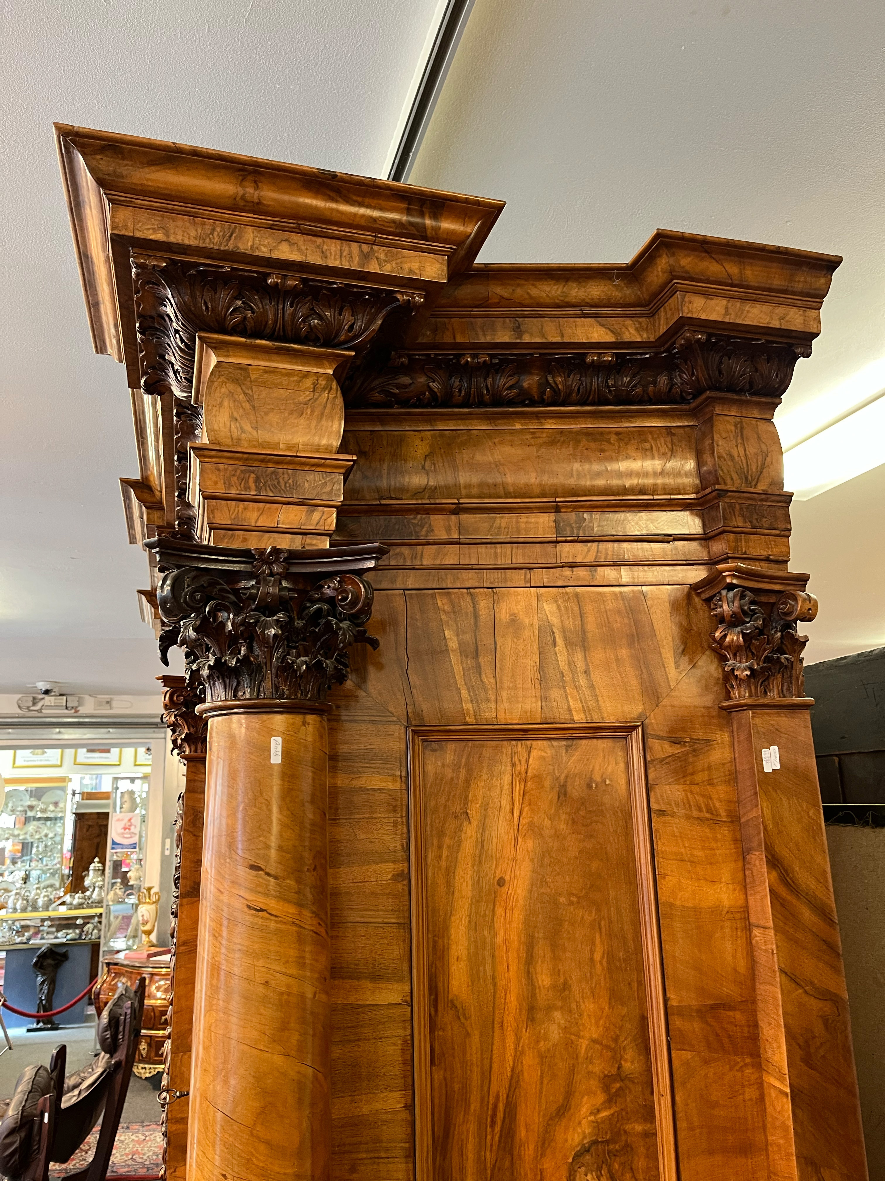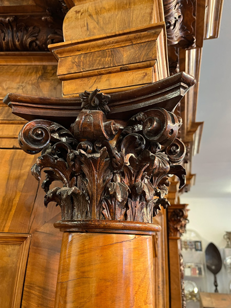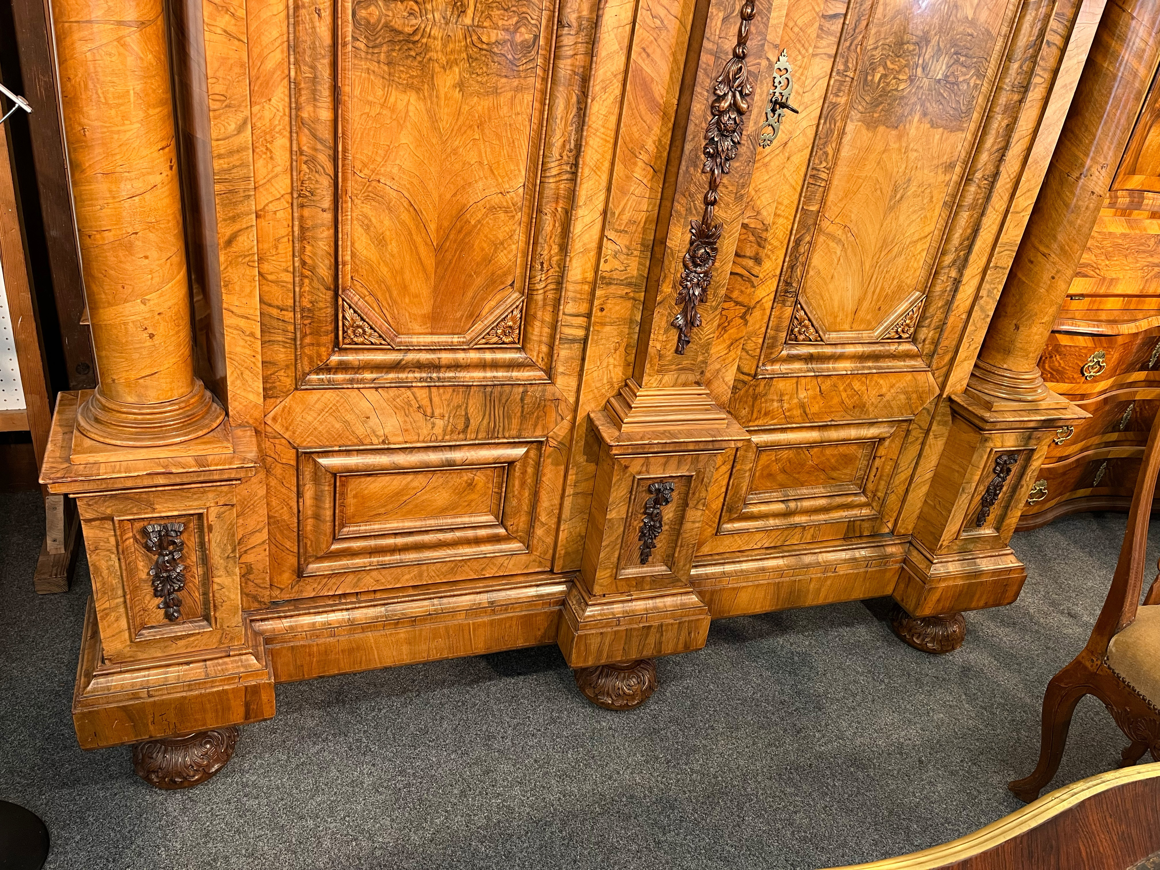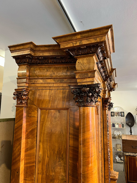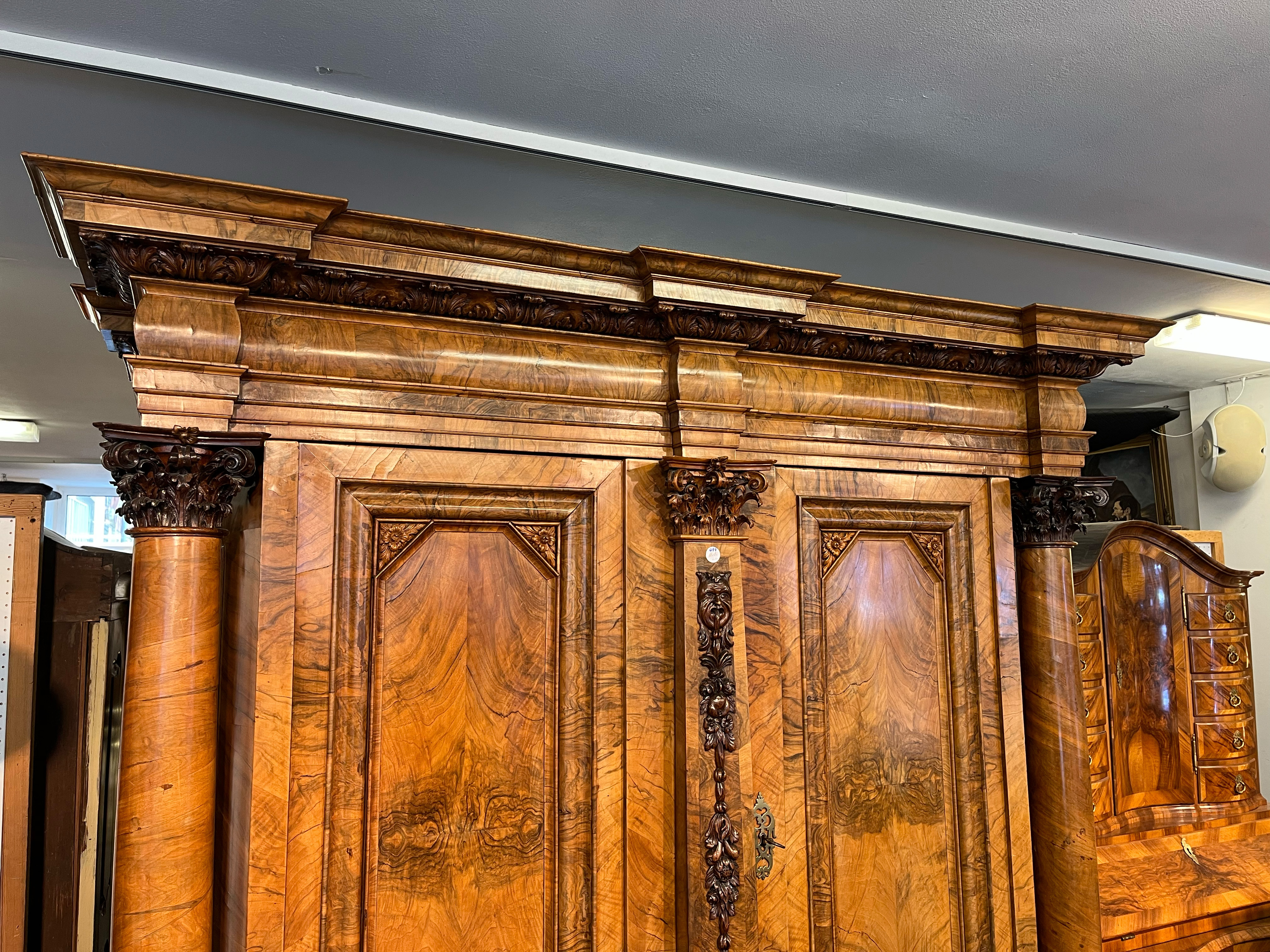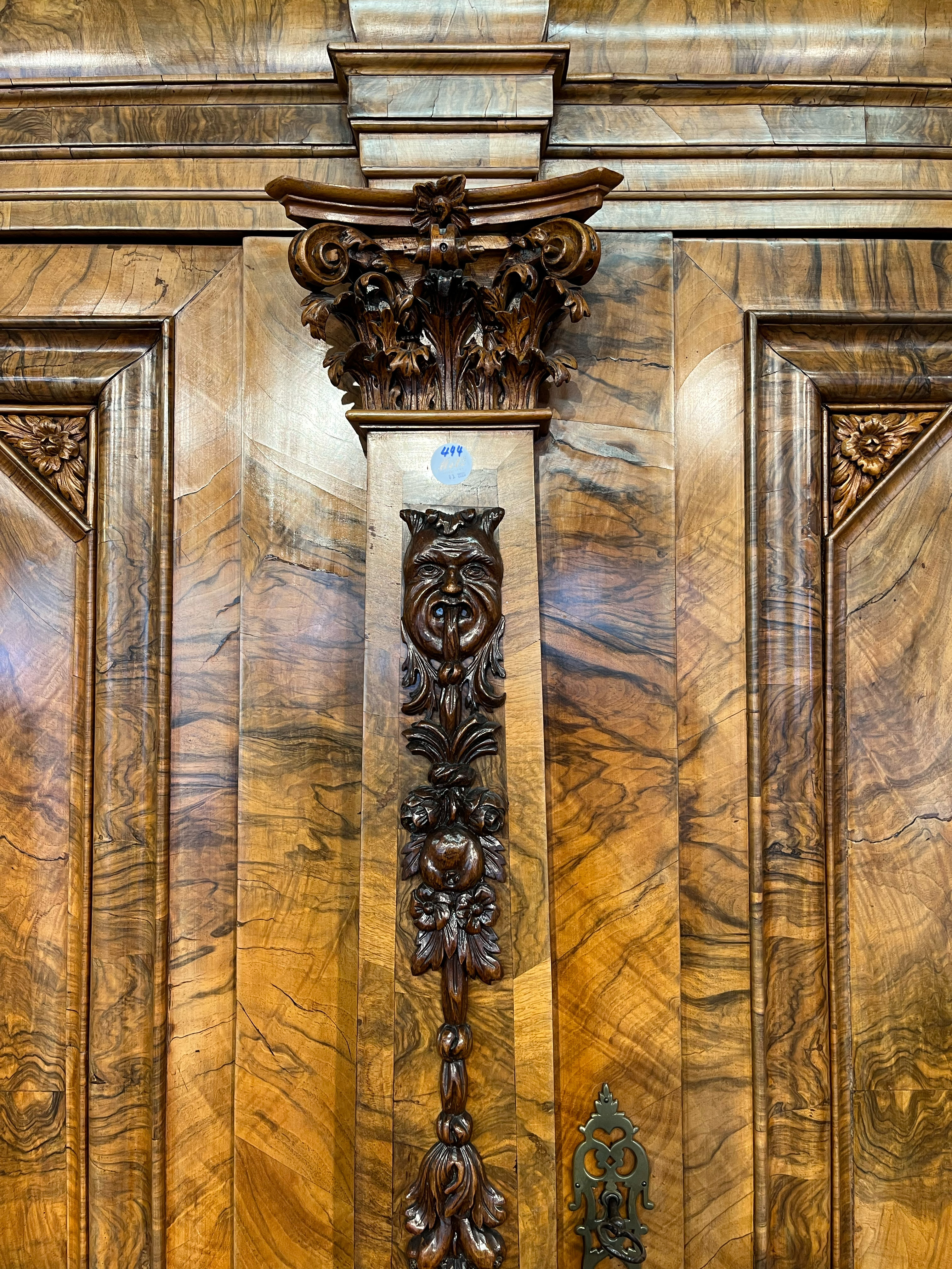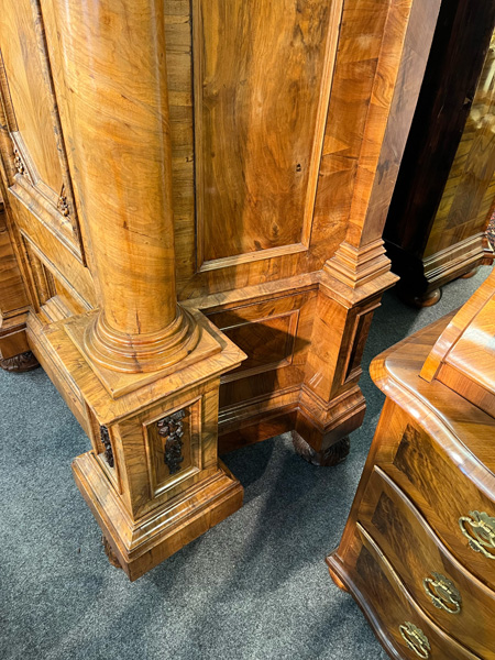 - Katalog-Nr: 444Prunkfassadenschrank. Mainz 1712, Meister Johann Matthias Staudinger (gest. 1742). Nussbaumwurzel querfurniert, teilw. massiv Nussbaum geschnitzt; auf fünf gequetschten, floral geschnitzten Kugelfüßen, zweitürig in Füllung gearbeitet mit breiter Schlagleiste, flankiert von je einer vollrunden Säule mit Kompositkapitell, abgeschrägte Seiten, stark ausladender Sockel und Gesims mit Zahnschnitt mehrfach profiliert und verkröpft, fein geschnitzt mit Maske, Rosetten und Bouquets, H=238,5 cm, B=228 cm, T=78,5 cm. J.M. Staudingers dazugehöriger Meisterriss ist überliefert in: Fritz Arens, „Beiträge zur Geschichte der Stadt Mainz“, Bd. 14, Taf. 21, Mainz 1955. Provenienz: Kunst- und Auktionshaus Döbritz, Frankfurt 08.03.2008, EUR 25.500,00.o.L.