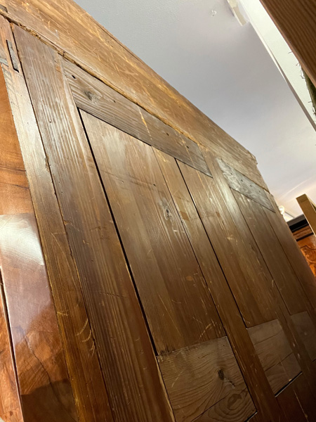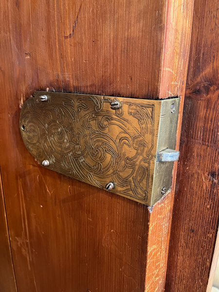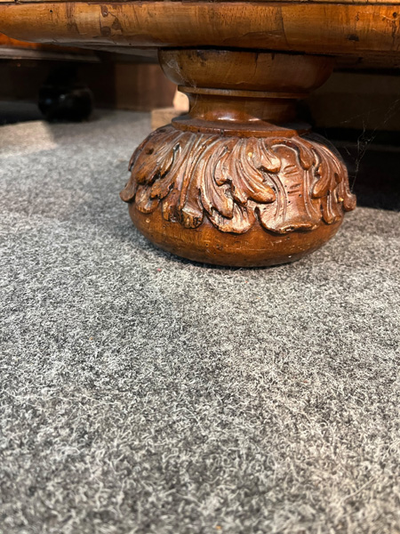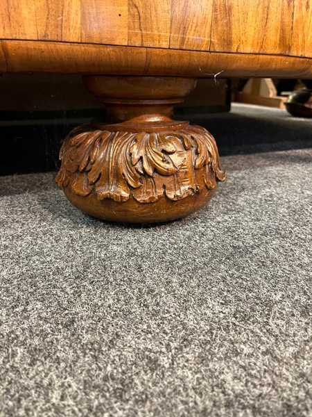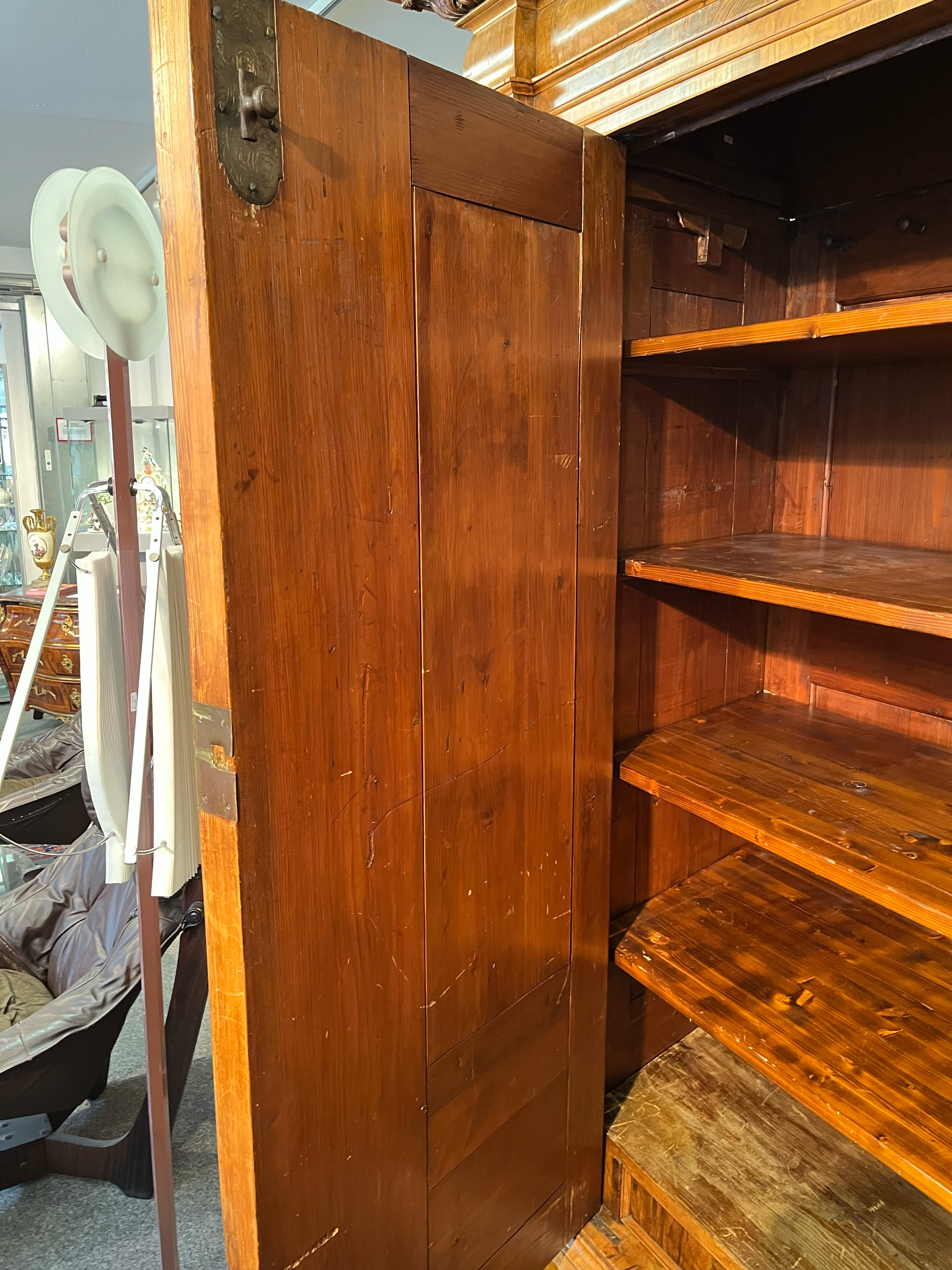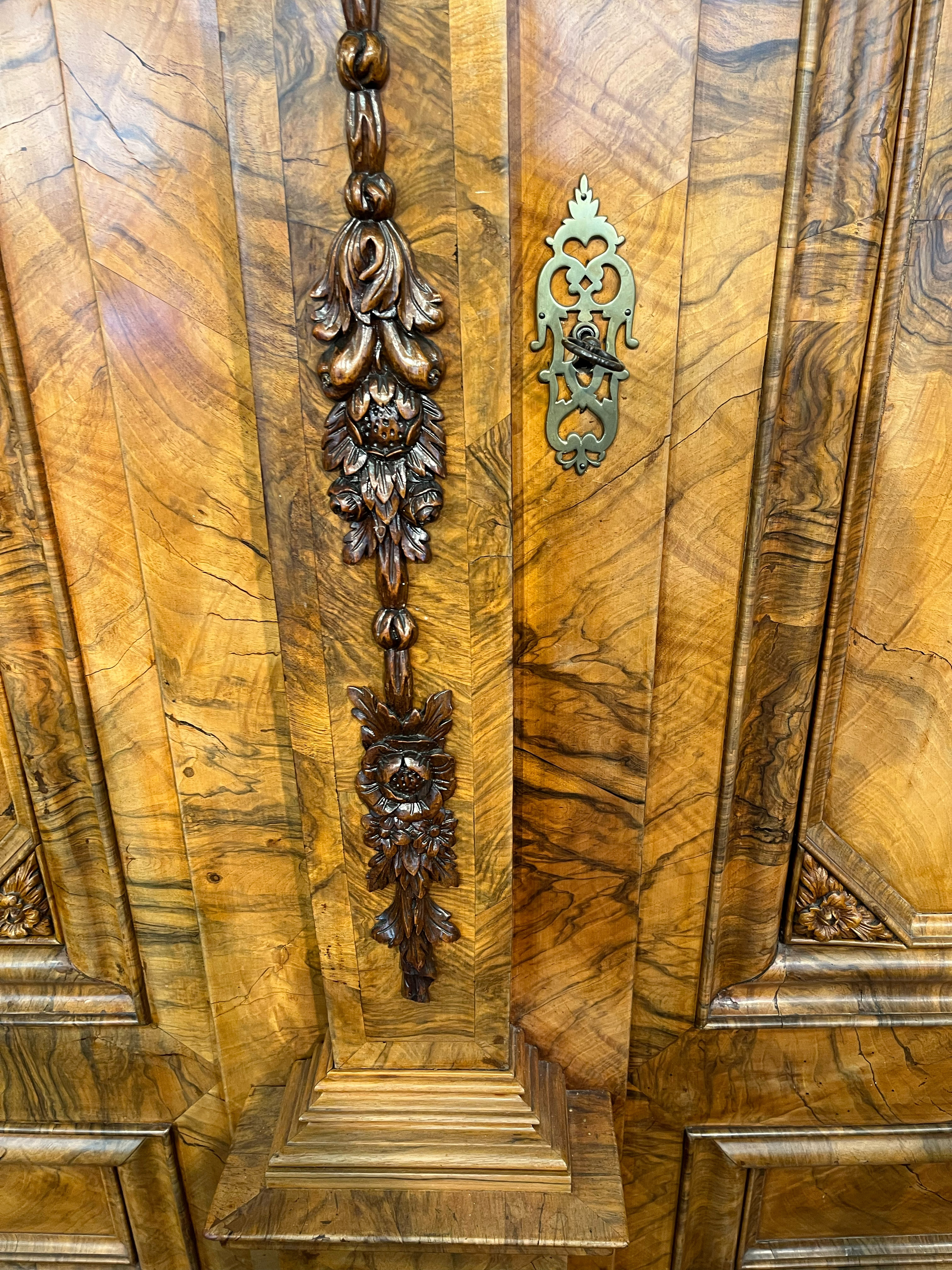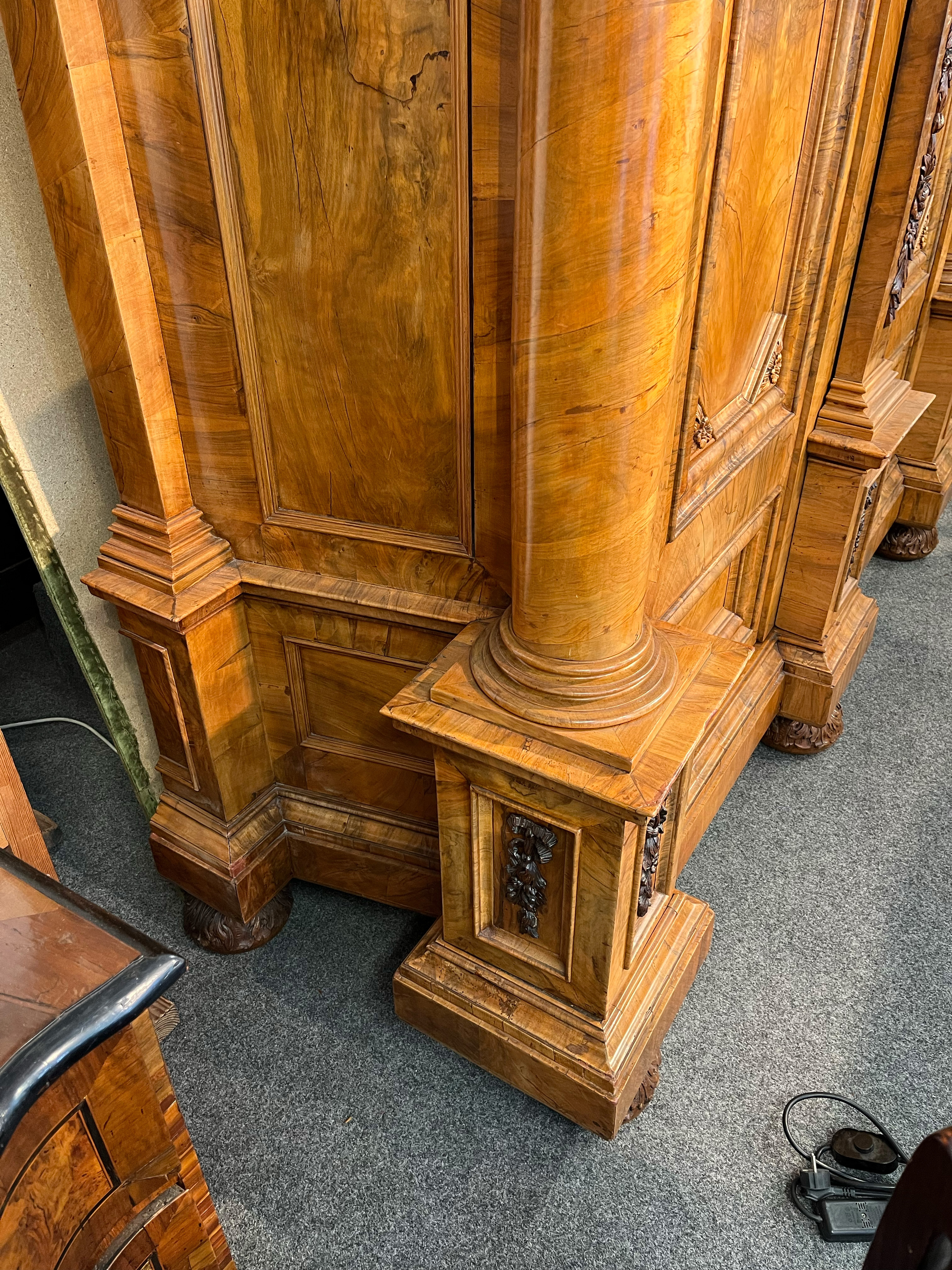 - Katalog-Nr: 444Prunkfassadenschrank. Mainz 1712, Meister Johann Matthias Staudinger (gest. 1742). Nussbaumwurzel querfurniert, teilw. massiv Nussbaum geschnitzt; auf fünf gequetschten, floral geschnitzten Kugelfüßen, zweitürig in Füllung gearbeitet mit breiter Schlagleiste, flankiert von je einer vollrunden Säule mit Kompositkapitell, abgeschrägte Seiten, stark ausladender Sockel und Gesims mit Zahnschnitt mehrfach profiliert und verkröpft, fein geschnitzt mit Maske, Rosetten und Bouquets, H=238,5 cm, B=228 cm, T=78,5 cm. J.M. Staudingers dazugehöriger Meisterriss ist überliefert in: Fritz Arens, „Beiträge zur Geschichte der Stadt Mainz“, Bd. 14, Taf. 21, Mainz 1955. Provenienz: Kunst- und Auktionshaus Döbritz, Frankfurt 08.03.2008, EUR 25.500,00.o.L.
