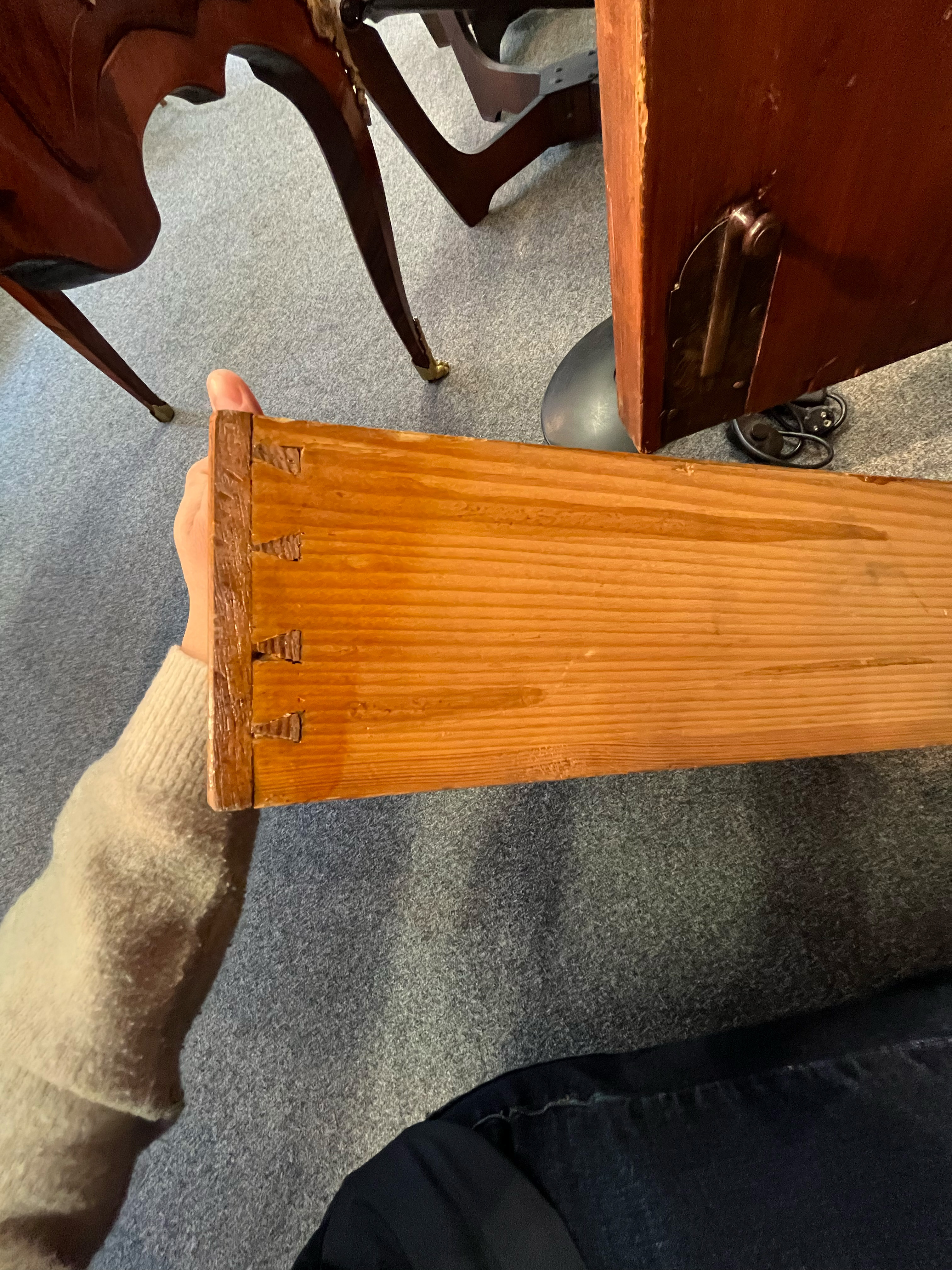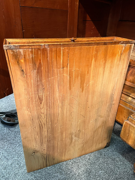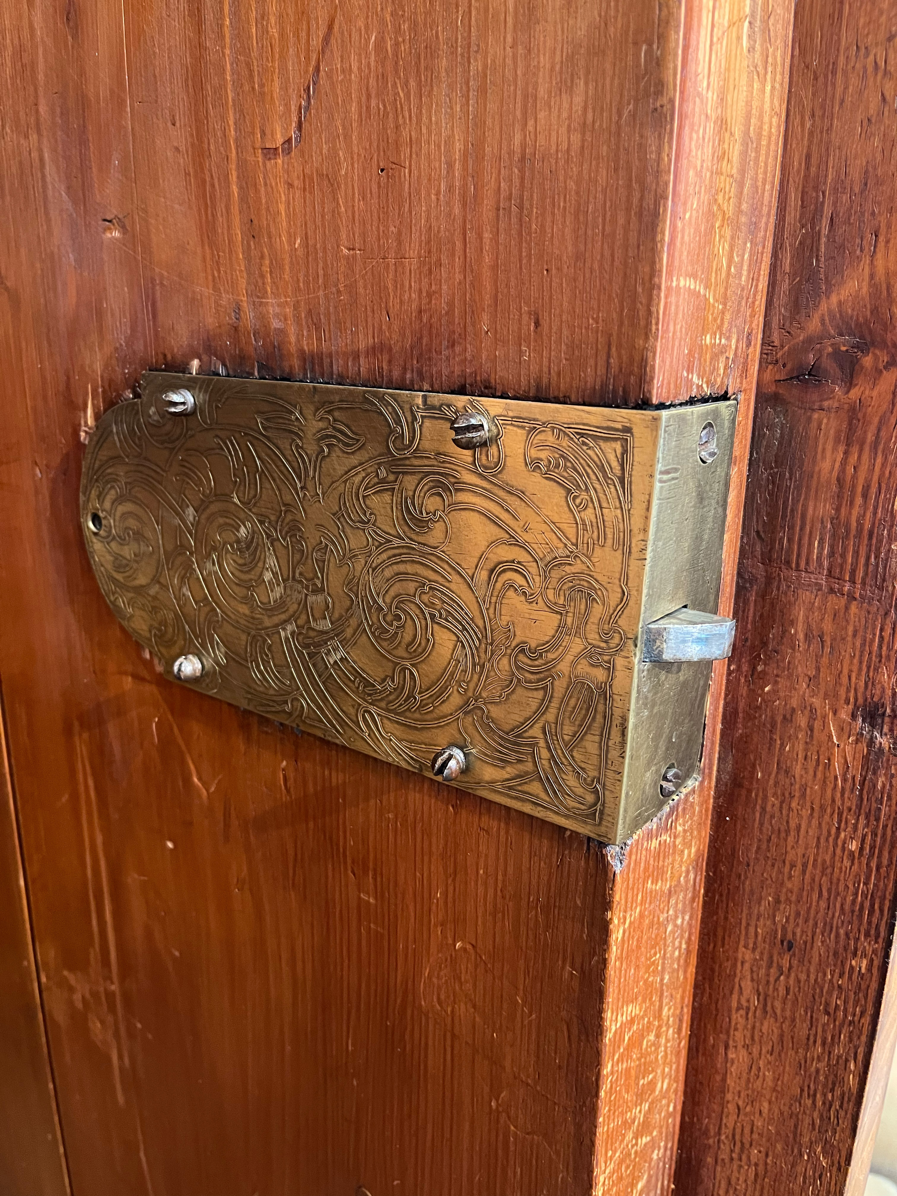 - Katalog-Nr: 443Schreibkommode. Italien 20. Jh. Verschiedene Hölzer furniert und marketiert mit Blumen und Fadeneinlagen, Messingbeschläge; leicht geschweifte Füße, dreischübige Front, abgeschrägte Kanten, gerade Seiten, gewellte Schreibklappe mit Inneneinteilung, profilierte Plattenkante, H=102 cm, B=90,5 cm, T=43,5 cm.o.L.