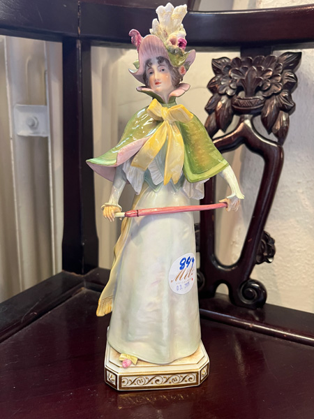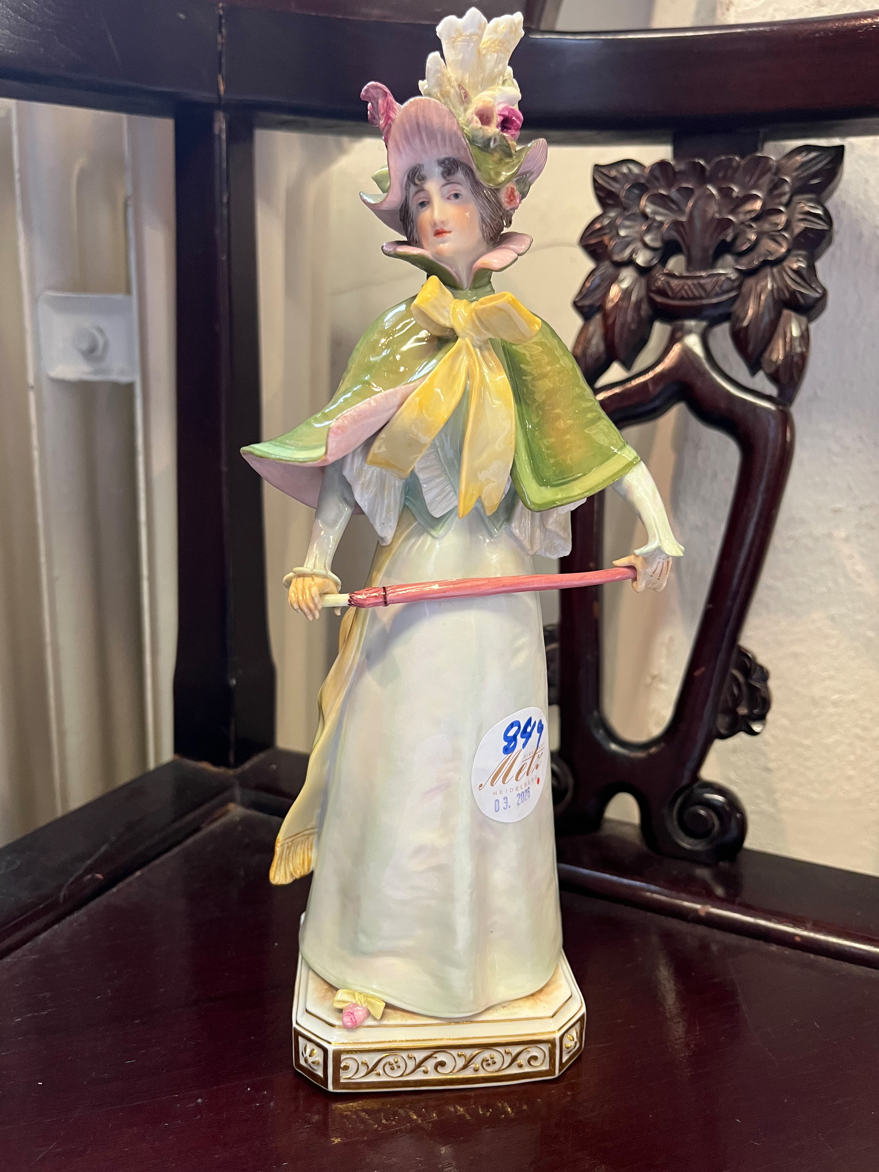 - Katalog-Nr: 849Dame mit Schirm. Meissen 1896. Stehend auf oktogonalem Reliefsockel, gold gesäumt. Porzellan, bunt bemalt, am Boden unterglasurblaue Schwertermarke, Formnummer „Q 128“, Staffiererziffer „33.“, Entwurf von Robert Schirmer, H=25,5 cm.o.L.