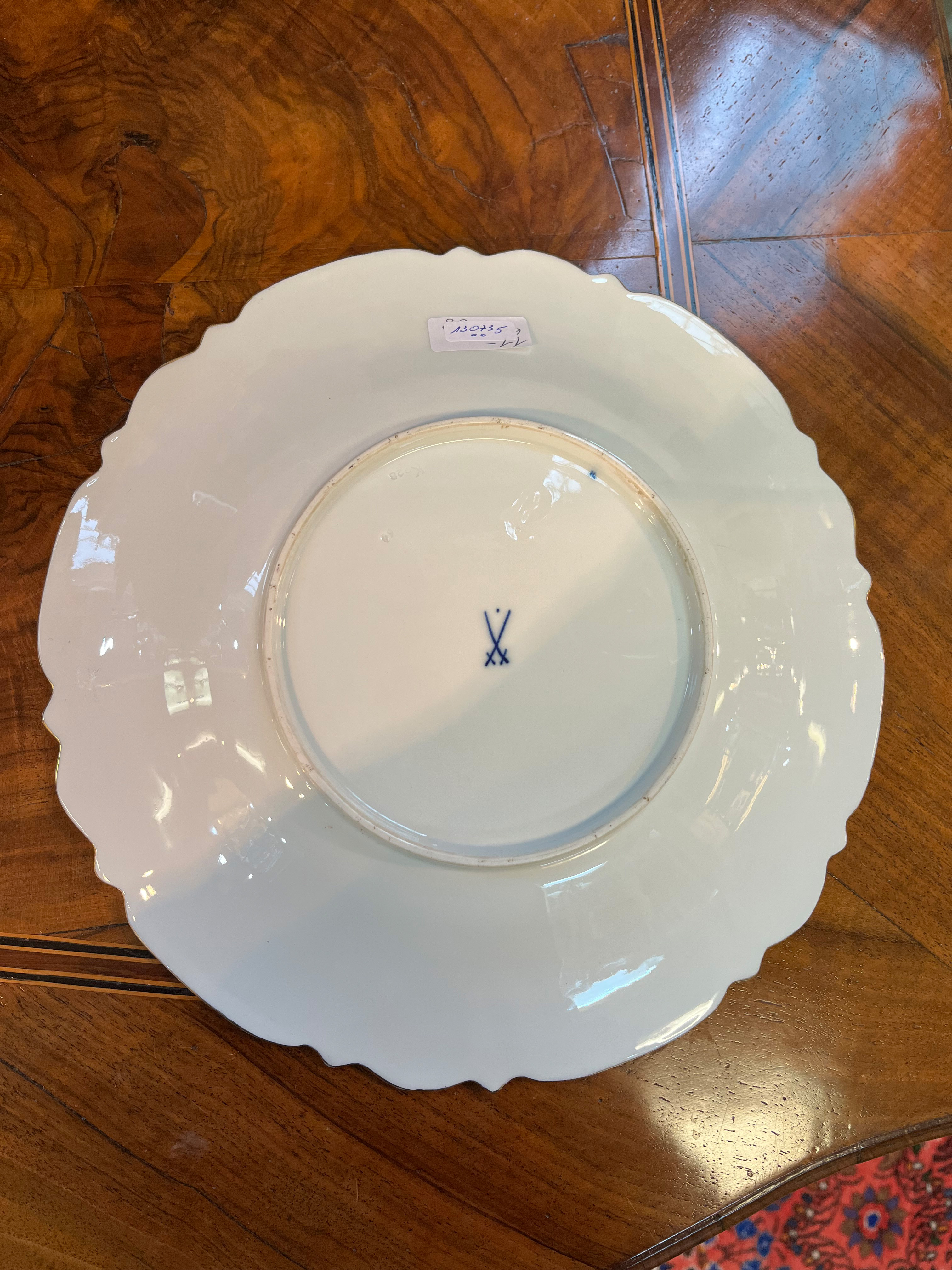 - Katalog-Nr: 123921-tlgs. Prunkservice. Meissen Pfeifferzeit 1924–34. Porzellan, exzellent bunt bemalt mit heimischen Vögeln auf Ästen, umgeben von Insekten, Ränder gold gesäumt; am Boden unterglasurblaue Schwertermarke. Bestehend aus: Sechs Speiseteller (D=je 24,5 cm), sechs Suppenteller (D=je 24 cm), eine Saucière (H=9,5 cm, B=24 cm, T=19 cm), eine große ovale Terrine (H=26 cm, B=35 cm, T=22 cm), eine ovale Platte (35 x 25 cm), eine runde Gemüseschüssel mit Deckel (H=18 cm, D=27 cm), eine quadratische Schüssel (H=10 cm, B=23 cm), ein Paar ovale Schalen (je 25 x 17 cm) und ein Paar runde Schalen (D=je 25 cm).o.L.