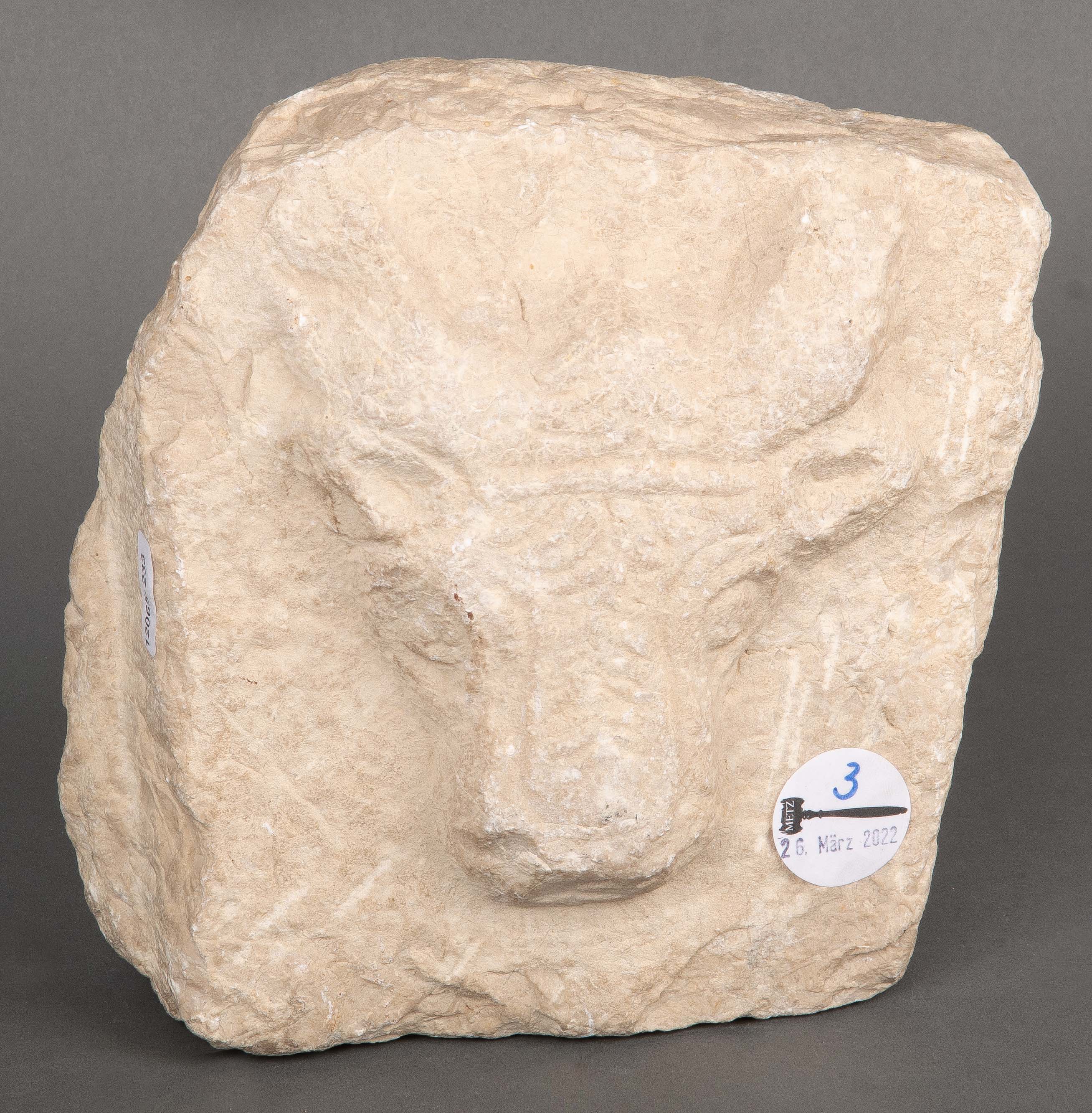 - Katalog-Nr: 3Relieffragment mit Stierkopf. Lt. Rechnung Römisch 3./4. Jh. n. Chr. Kalkstein, gehauen. H=20 cm, B=18 cm, T=9,5 cm. Provenienz: Athena, München, 1991o.L.Bitte melden sie sich an, um ein elektronisches Vorgebot abzugeben
