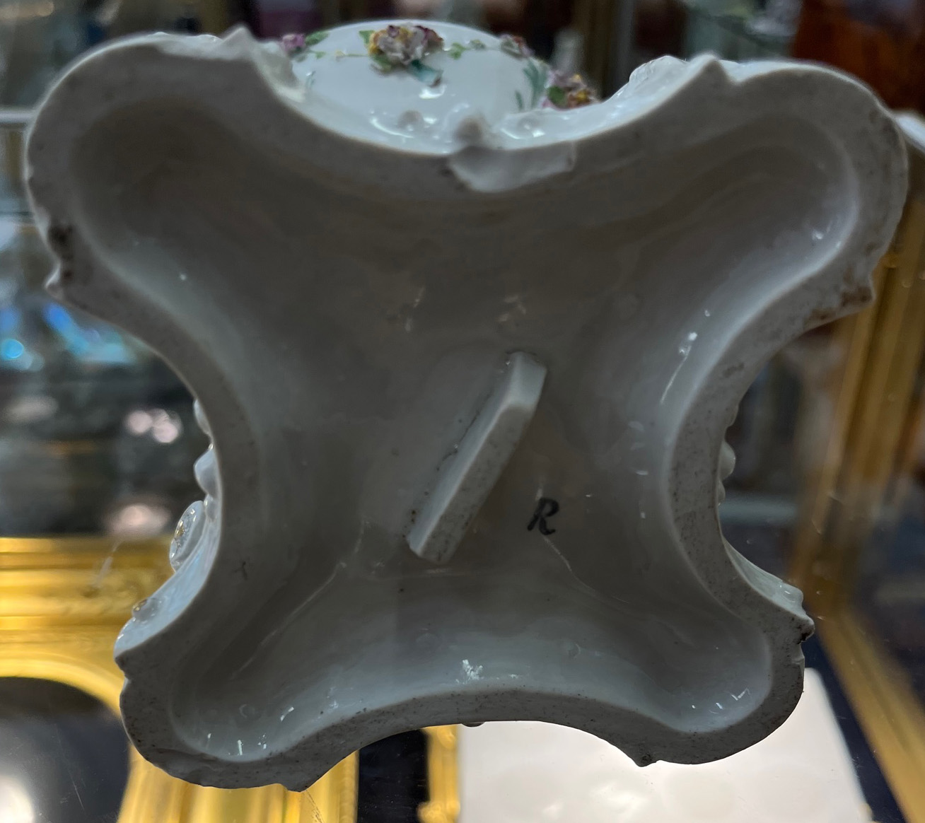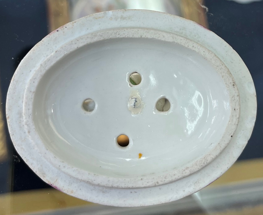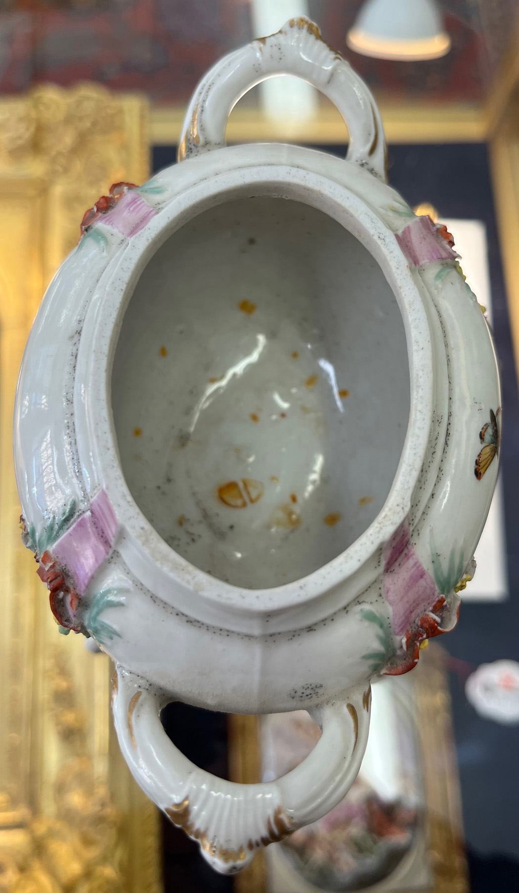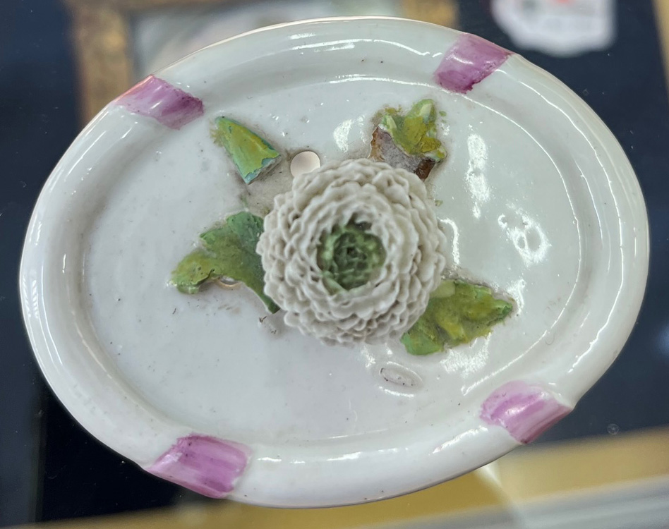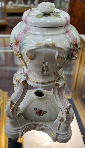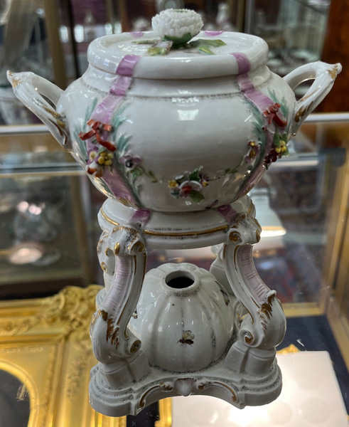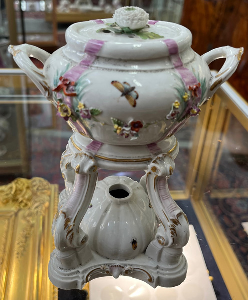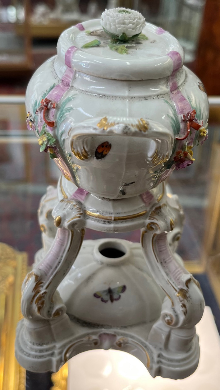 Gotha 1772-75 Vierpassiger, rocaillemodellierter Sockel mit oval gewölbtem Spiritusbrenner. Gebogte Beine mit Volutenabschluß. Darauf ruhend ovaler, gedeckter Henkelbehälter mit aufgelegter Blüte und vier kleinen Öffnungen. Wandung mit aufbossierten Blütenranken, bunt bemalt. Freiräume bunt bemalt mit Insekten. Porzellan, am Boden graue R-Marke. Vgl. Ausstellungskatalog Gothaer Porzellan des 18. Jhs., Schloßmuseum Friedenstein 1995, S. 38 ff, Nr. I. 13 ff. (Gold ber.) H=18 cm € 1.000,-Bitte melden sie sich an, um ein elektronisches Vorgebot abzugeben