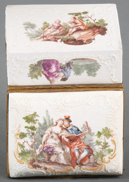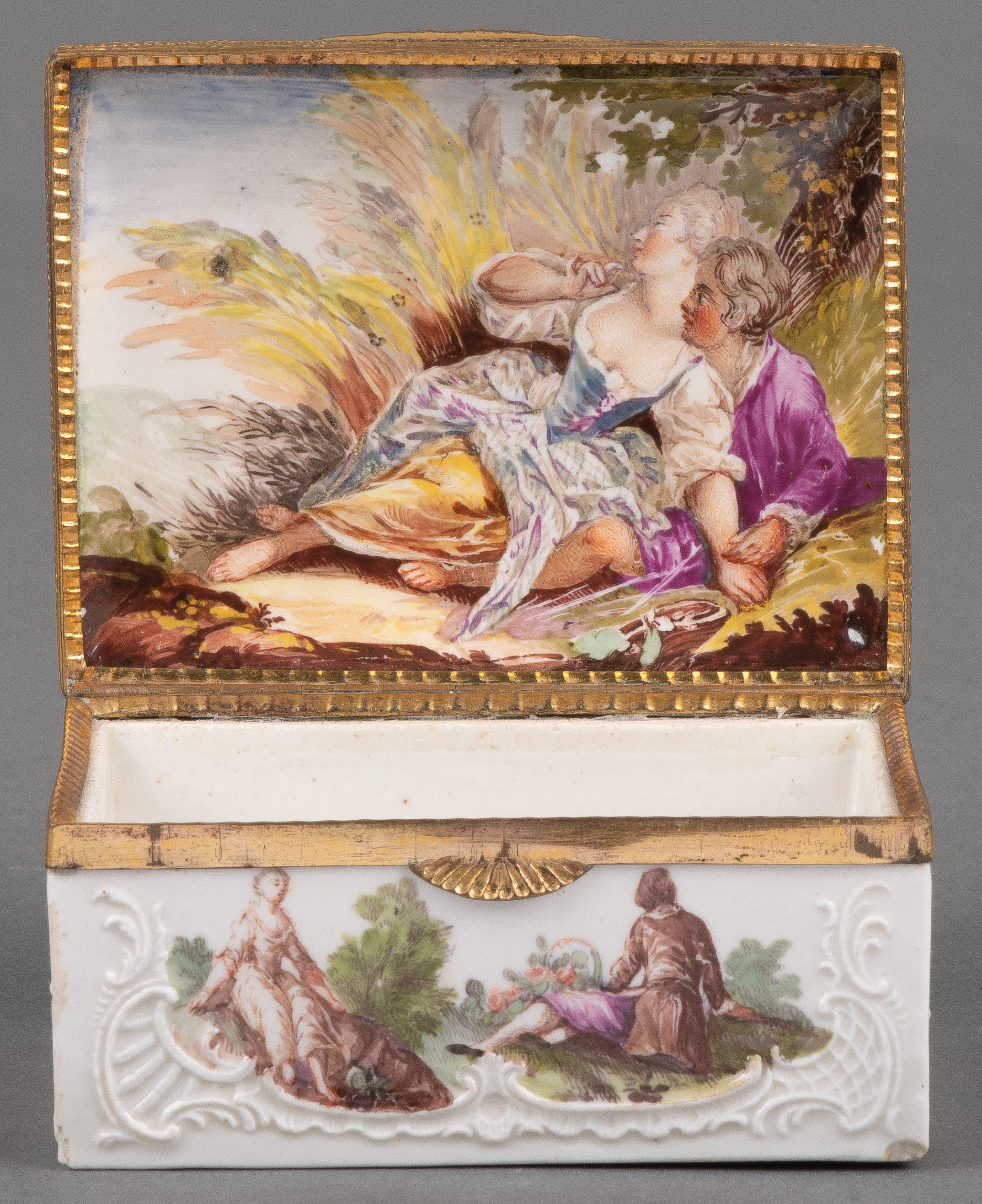 Frankenthal 1770 Mit nach oben zu öffnendem Deckel, verbunden durch vergoldete Montur. Außenflächen mit Rocaille- und Gitterwerkdekor, teilweise gold gesäumt. Reserven bunt bemalt mit galanten Szenen. Innendeckel mit einem im Gras liegenden Paar. Porzellan, ohne Marke. Vgl. B. Beaucamp-Markowsky, S. 363, Nr. 296. (min. an einer Ecke best.) H=4,1 cm, B=7,8 cm, T=6,2 cm € 3.600,-Bitte melden sie sich an, um ein elektronisches Vorgebot abzugeben