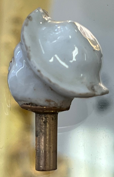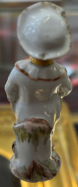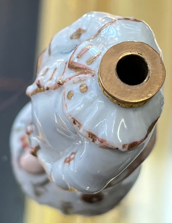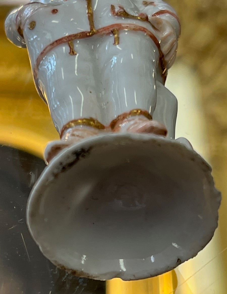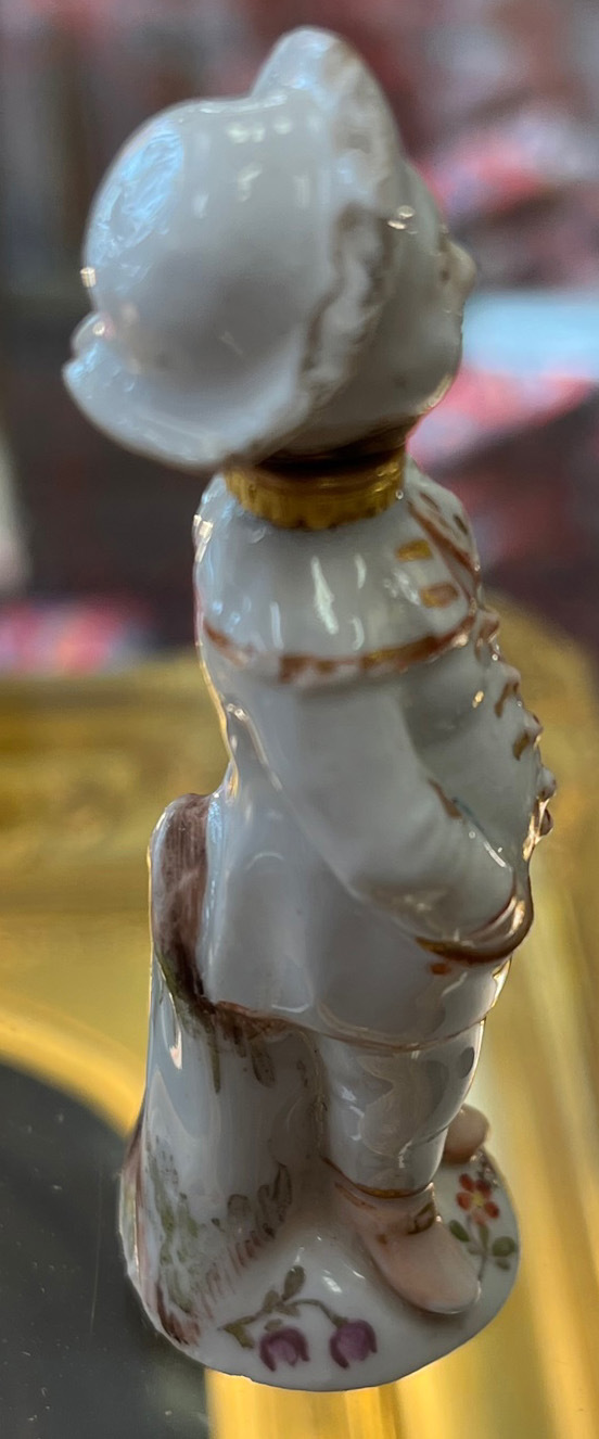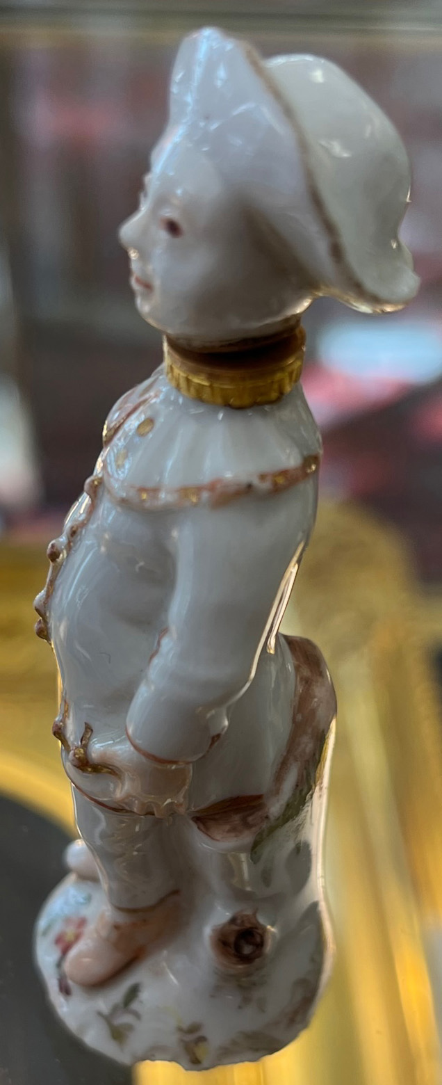 Ansbach 1765 In Form eines stehenden Pierrots mit abnehmbarem Kopf, als Stöpsel gearbeitet. Runder gewölbter Sockel, bunt bemalt mit Streublumen. Porzellan, gold gesäumt, ohne Marke. (mehrfach best.) H=8,1 cm € 800,-Bitte melden sie sich an, um ein elektronisches Vorgebot abzugeben