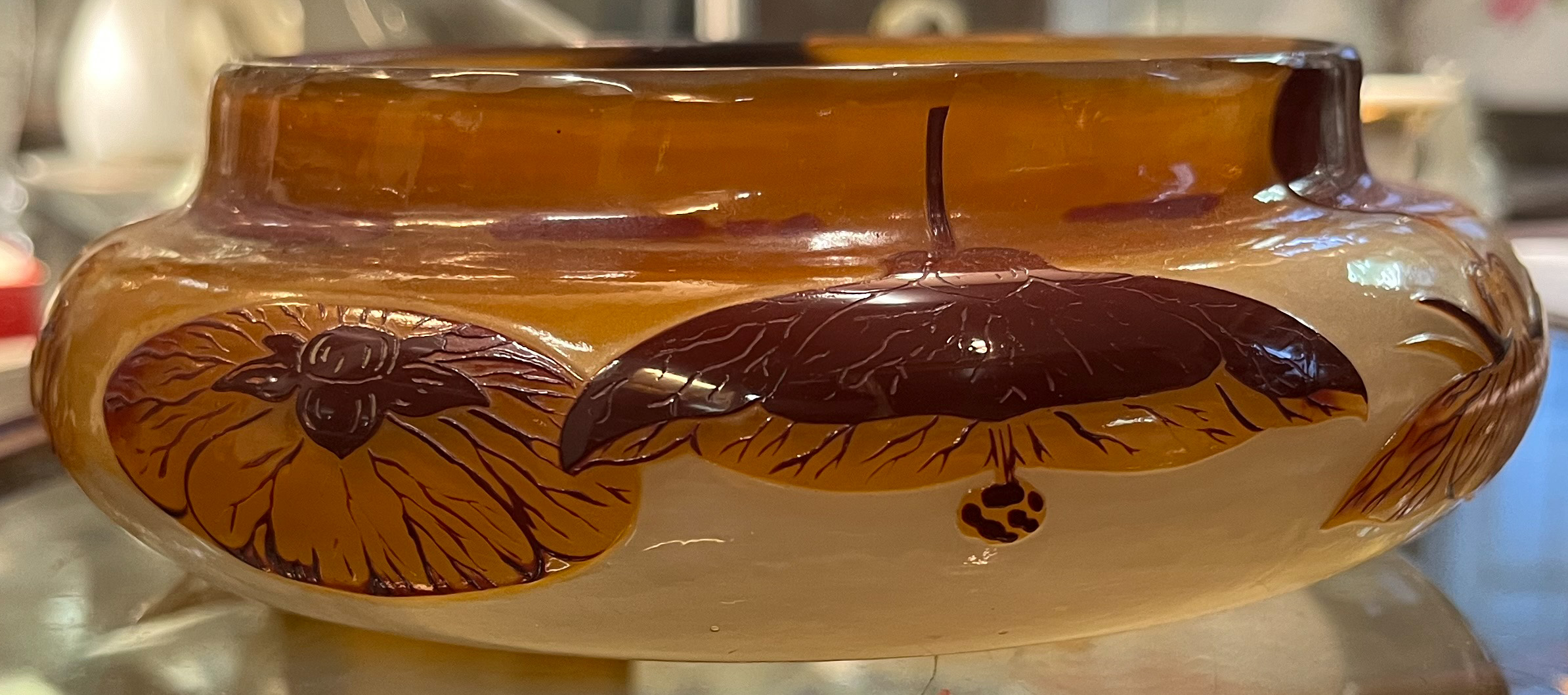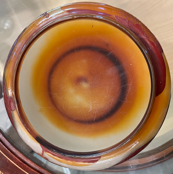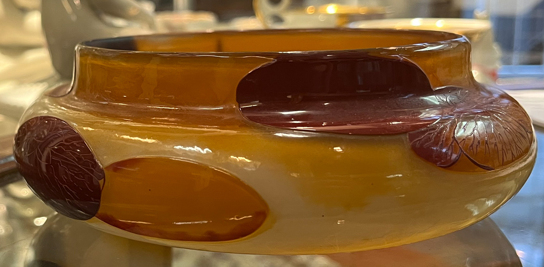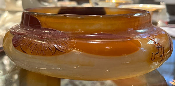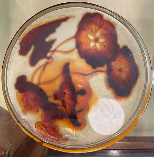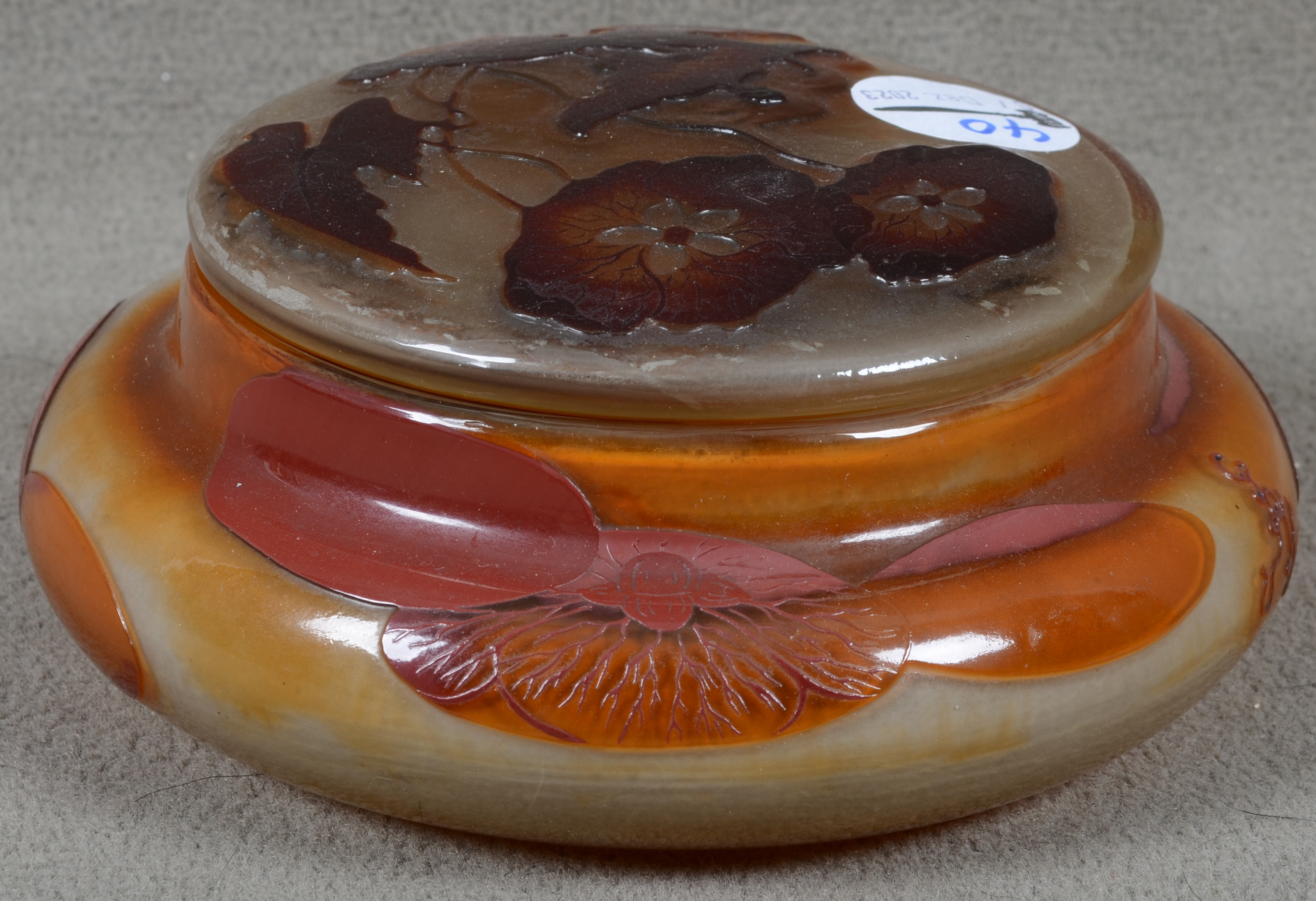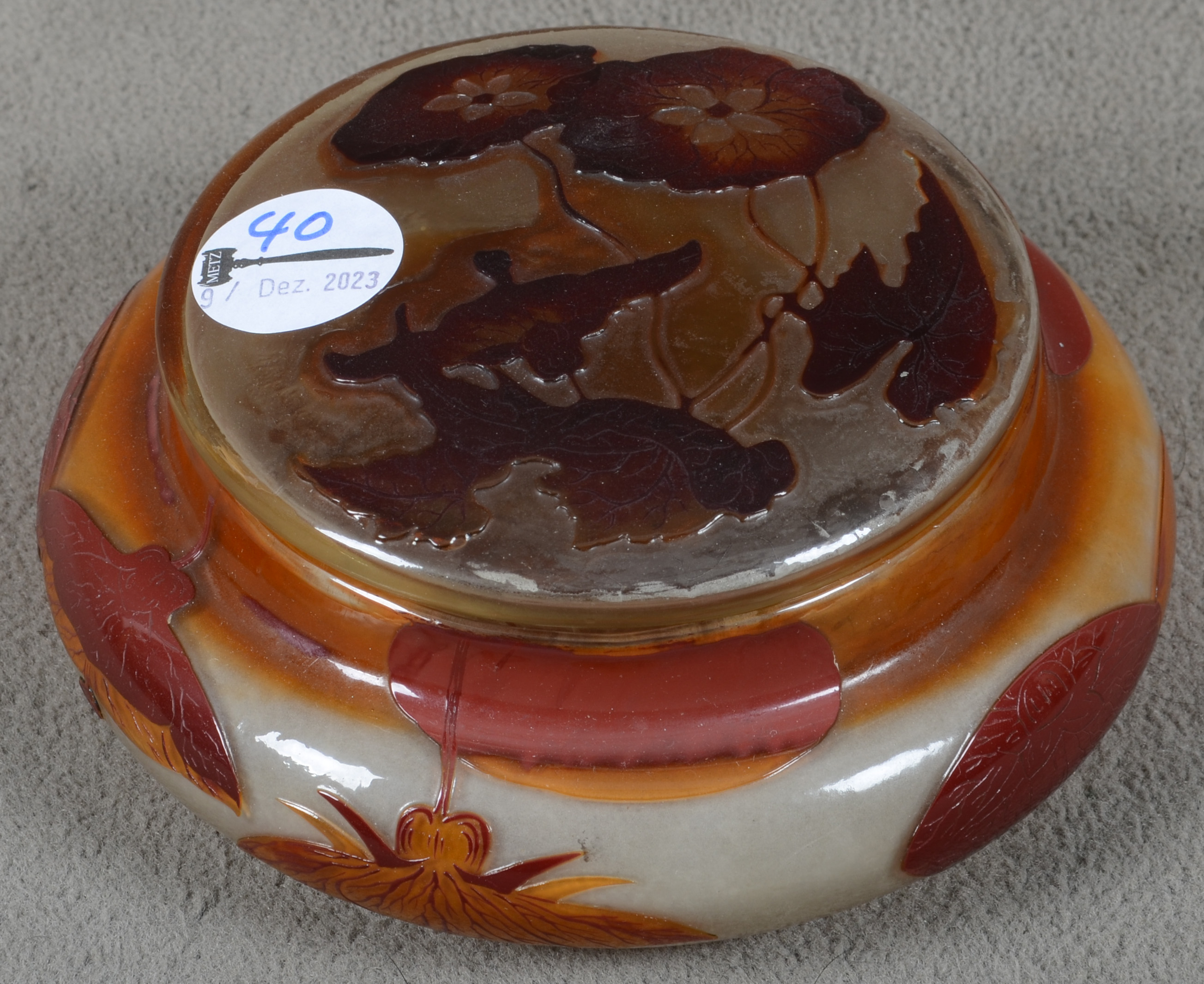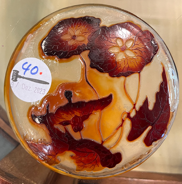 - Katalog-Nr: 40Jugendstil-Deckeldose. Nancy, Émile Gallé um 1900. Farbloses Glas, farbig überfangen, floral geschnitten, teilw. geätzt und feuerpoliert; auf der Wandung sign., H=6,7 cm, D=17 cm.Orientierungswert: € 2.000,-NO RESERVEo.L.Bitte melden sie sich an, um ein elektronisches Vorgebot abzugeben