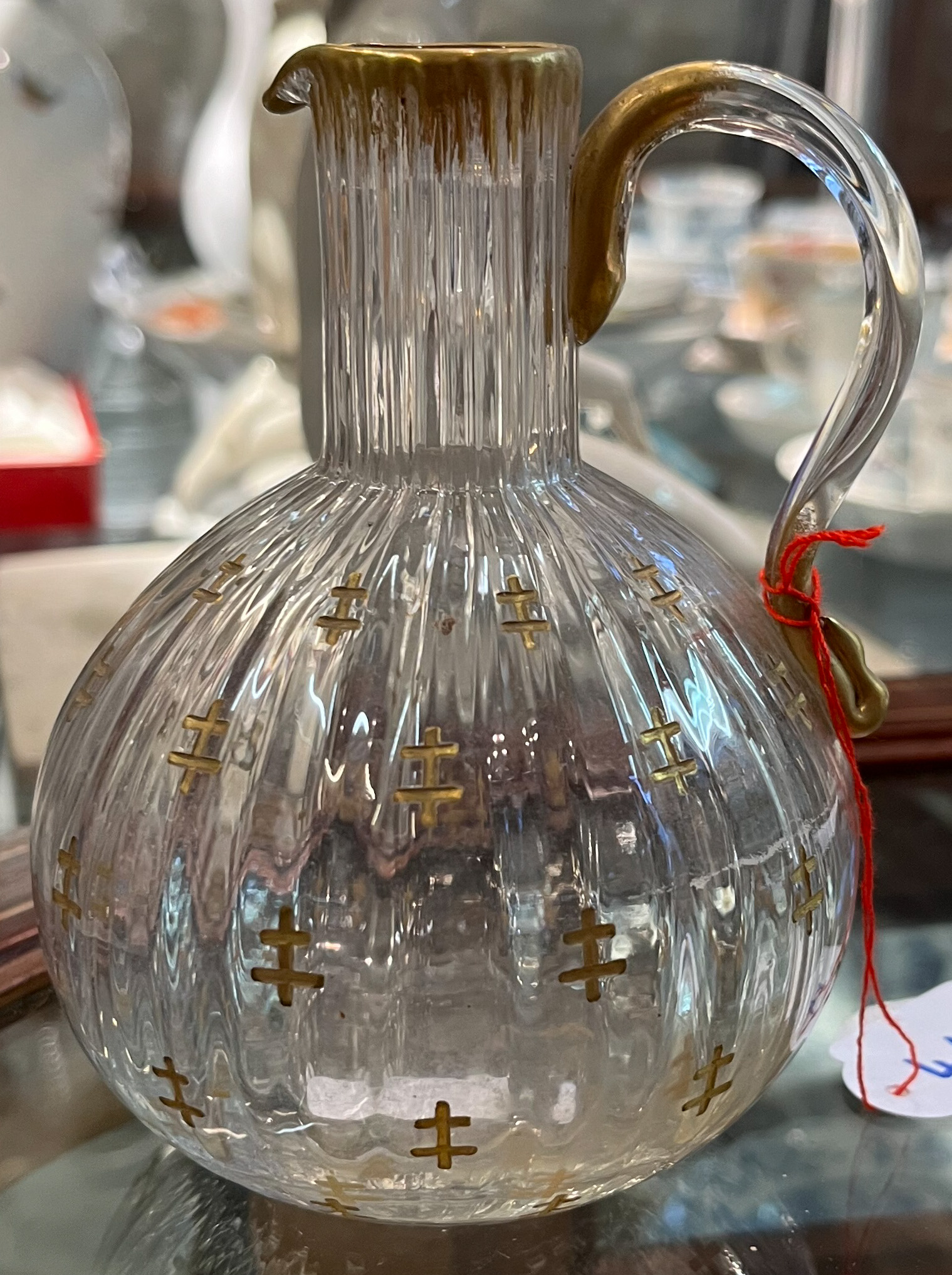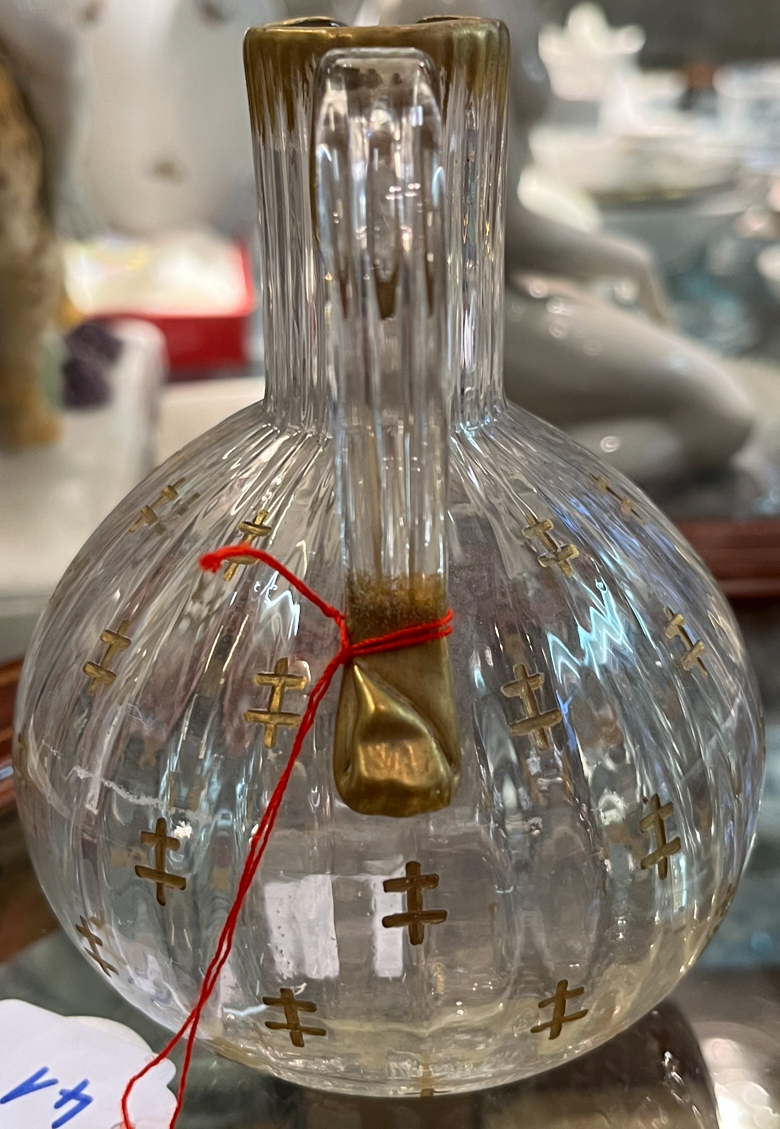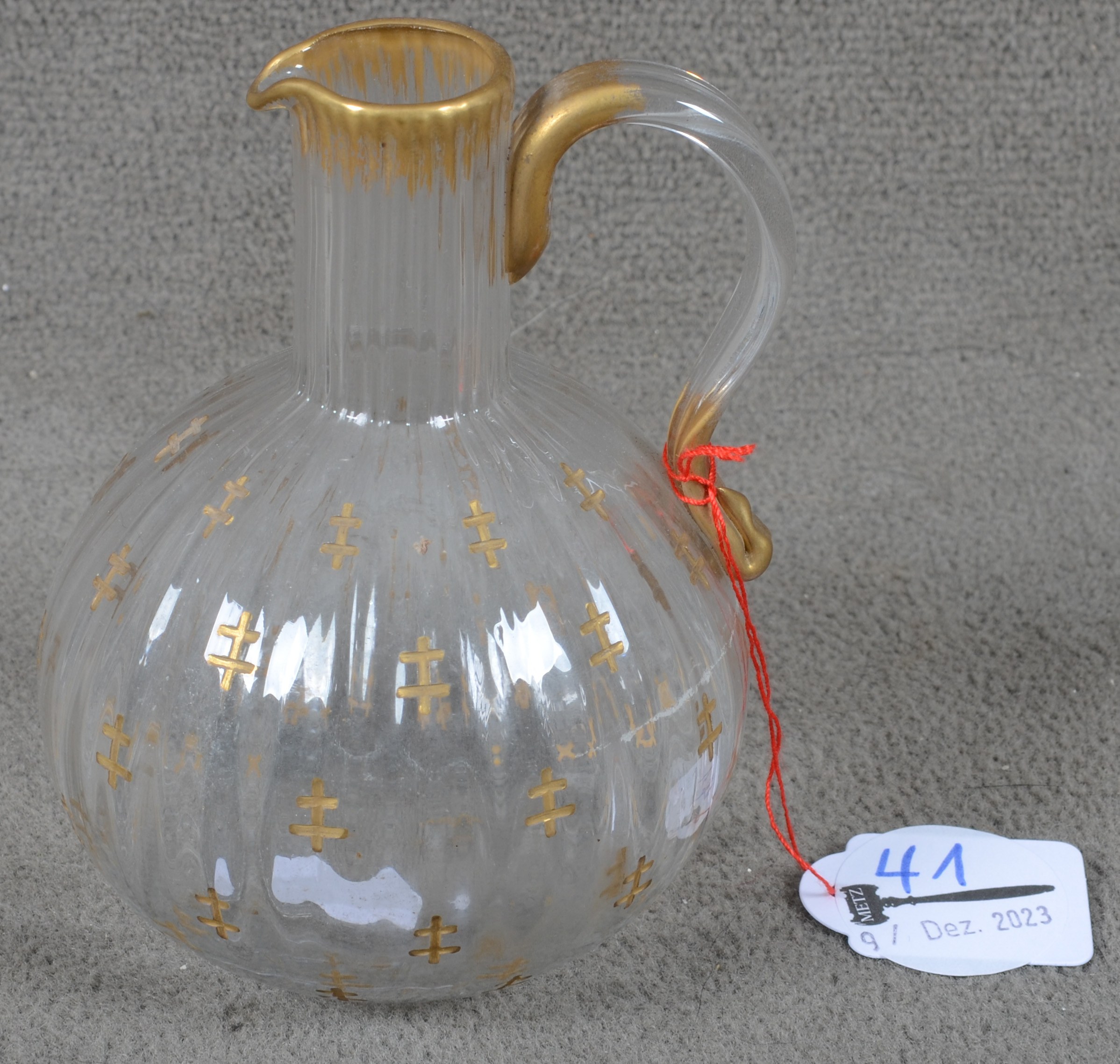 - Katalog-Nr: 41Jugendstil-Henkelkrug. Nancy, Daum Frères & Cie, Verreries um 1900. Farbloses Glas mit Kaltgoldbemalung; am Boden sign., H=12,2 cm.Orientierungswert: € 1.000,-NO RESERVEo.L.Bitte melden sie sich an, um ein elektronisches Vorgebot abzugeben