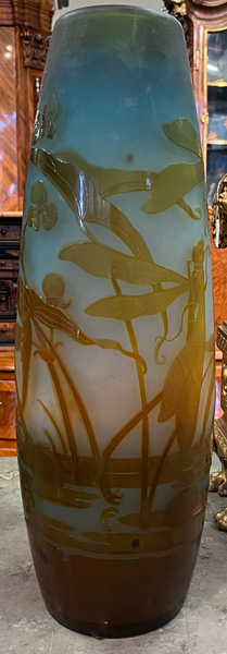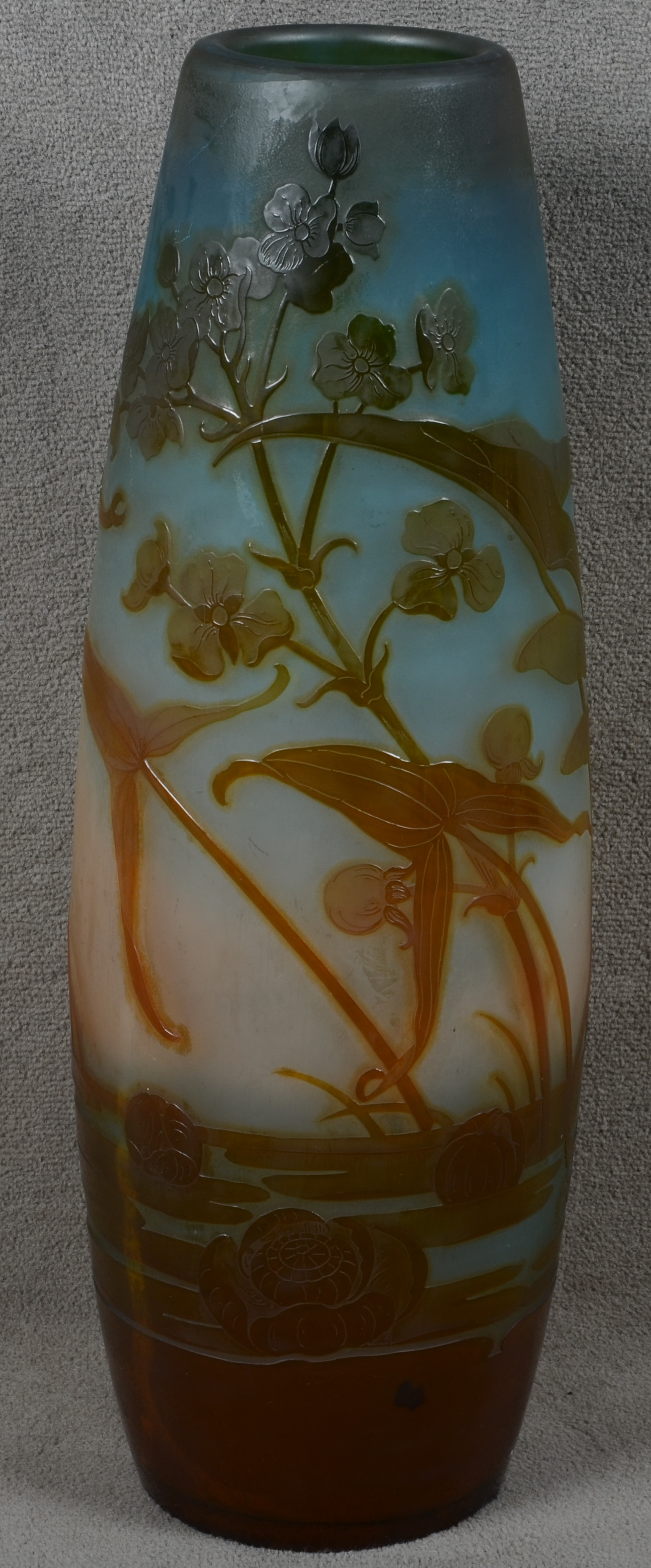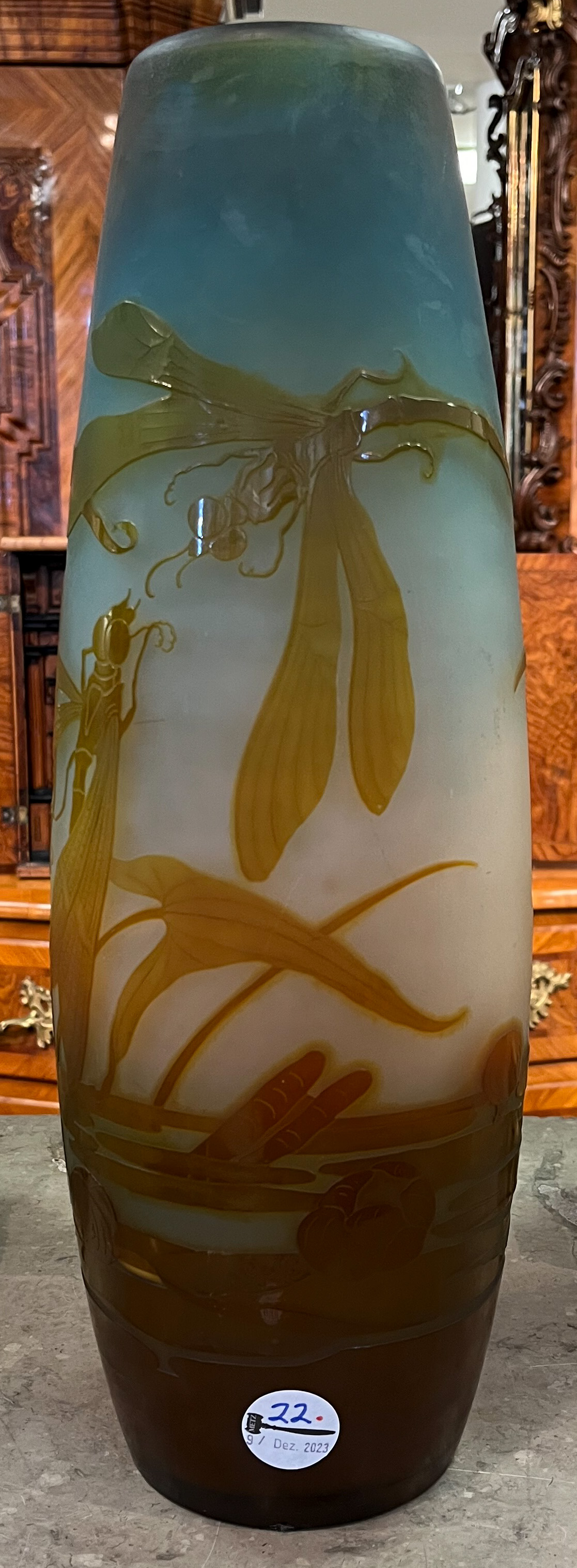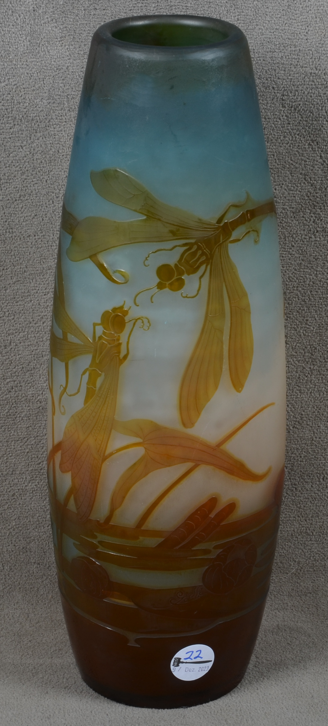 Jugendstil-Vase. Nancy, Émile Gallé um 1900. Farbloses Glas, farbig überfangen, geschnitten mit Uferlandschaft und Libellen, teilw. geätzt und poliert; auf der Wandung sign., H=46,5 cm.