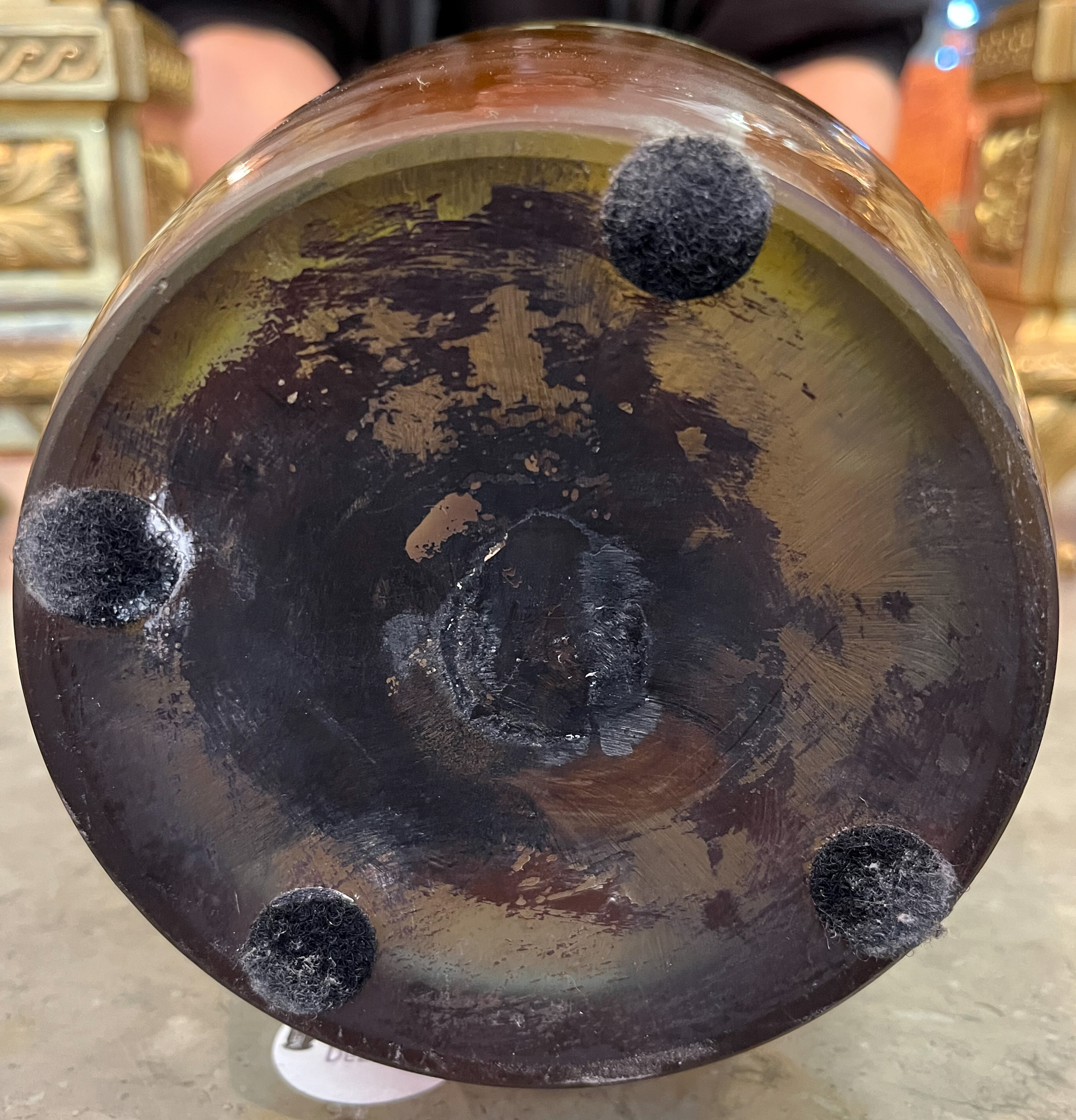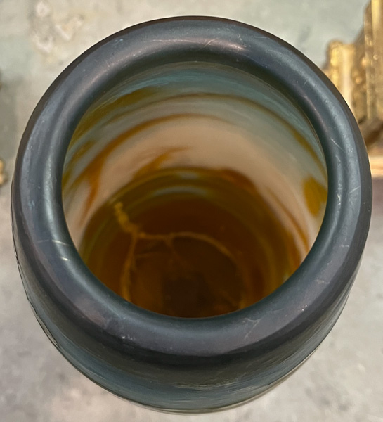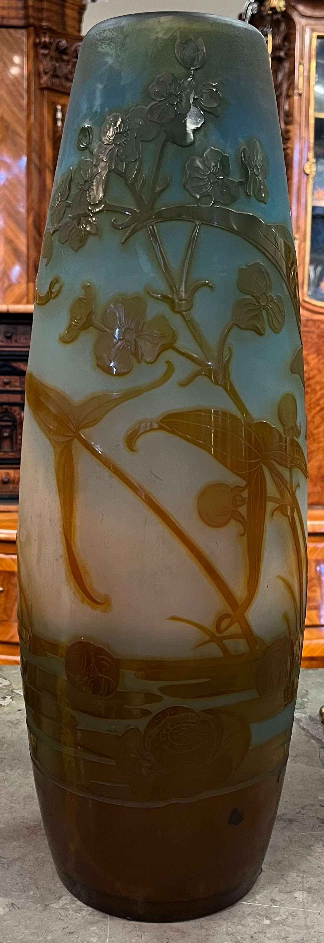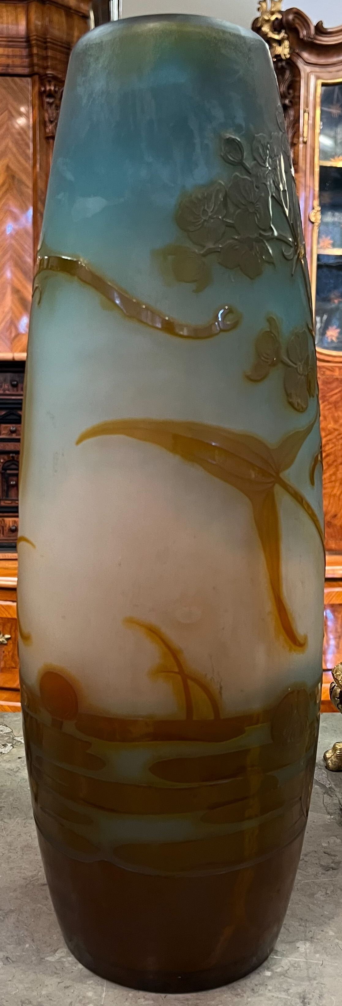 Jugendstil-Vase. Nancy, Émile Gallé um 1900. Farbloses Glas, farbig überfangen, geschnitten mit Uferlandschaft und Libellen, teilw. geätzt und poliert; auf der Wandung sign., H=46,5 cm.