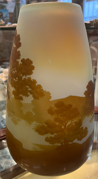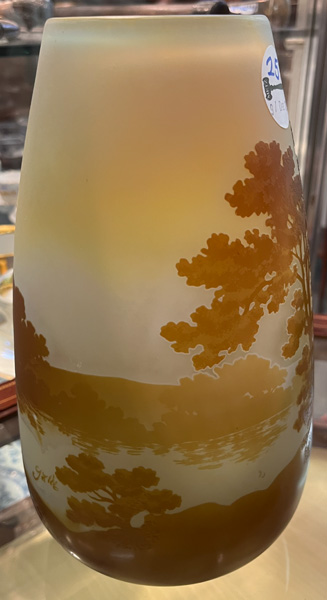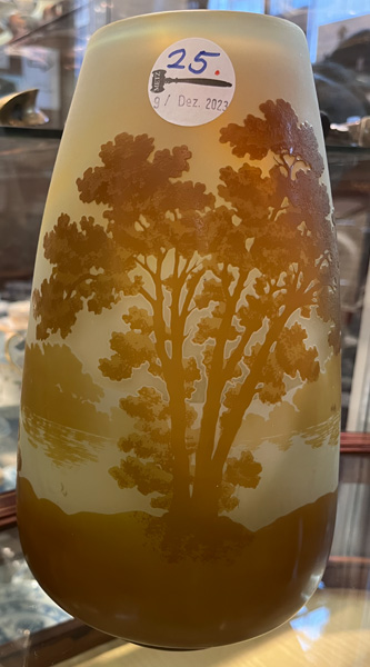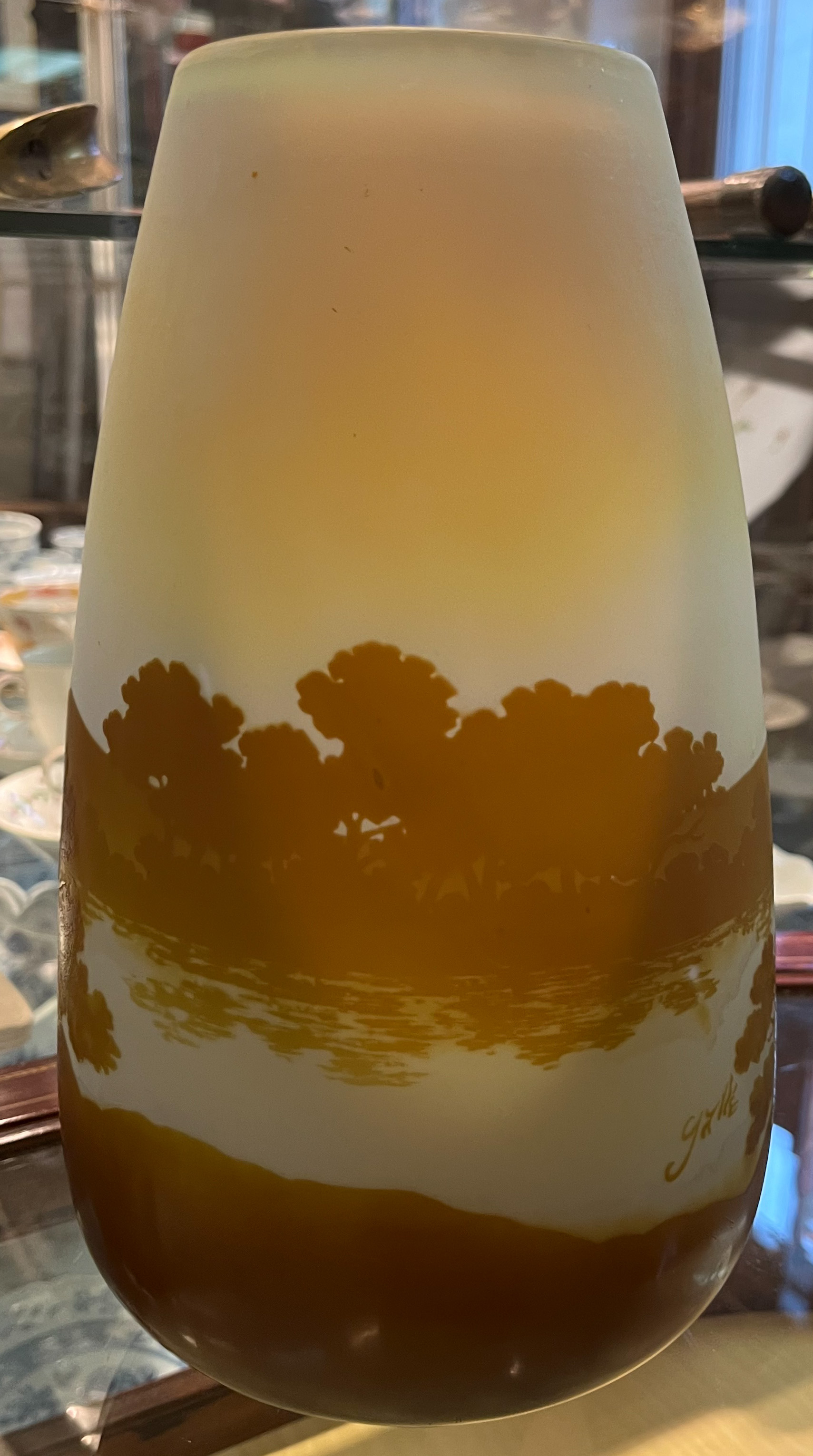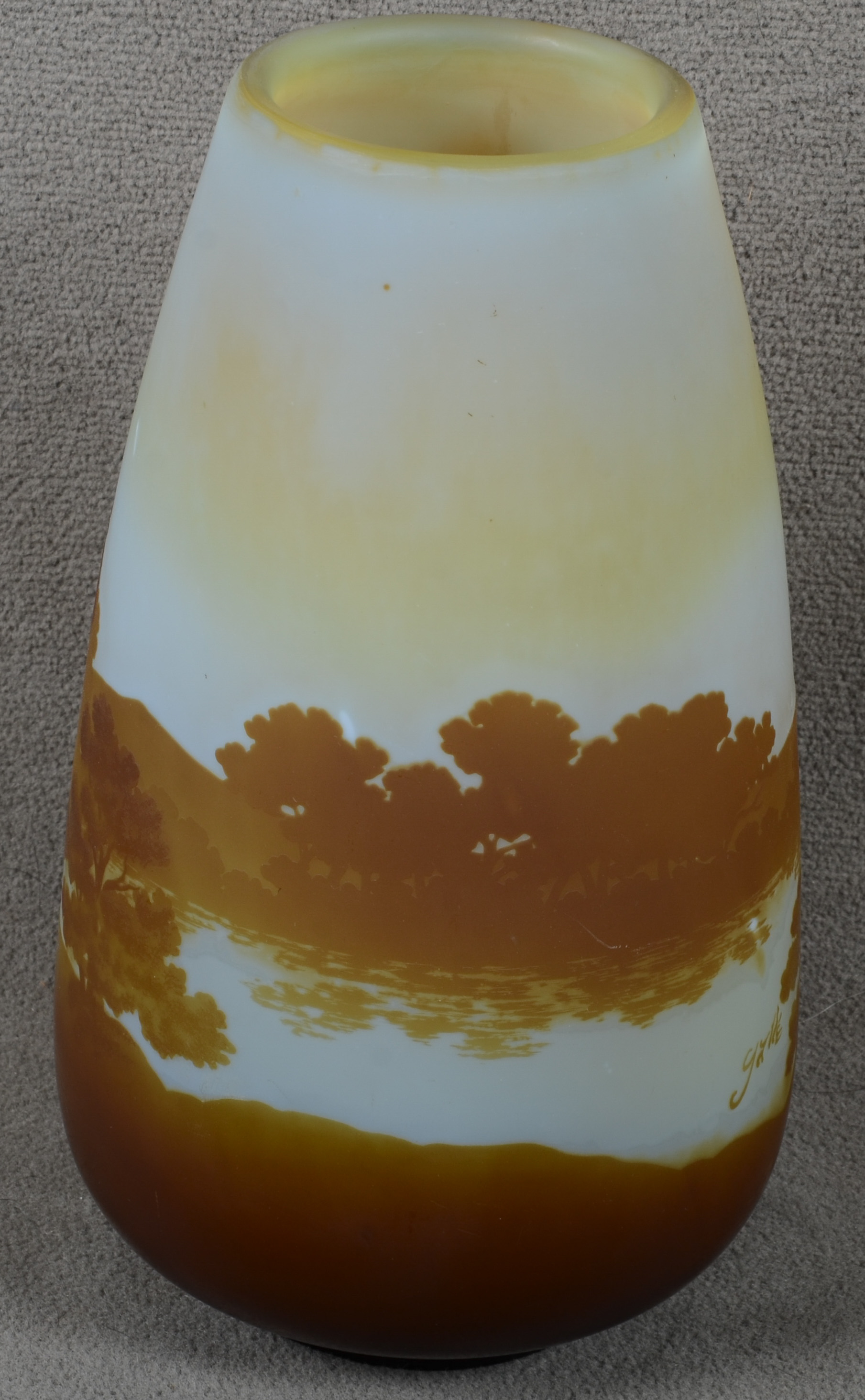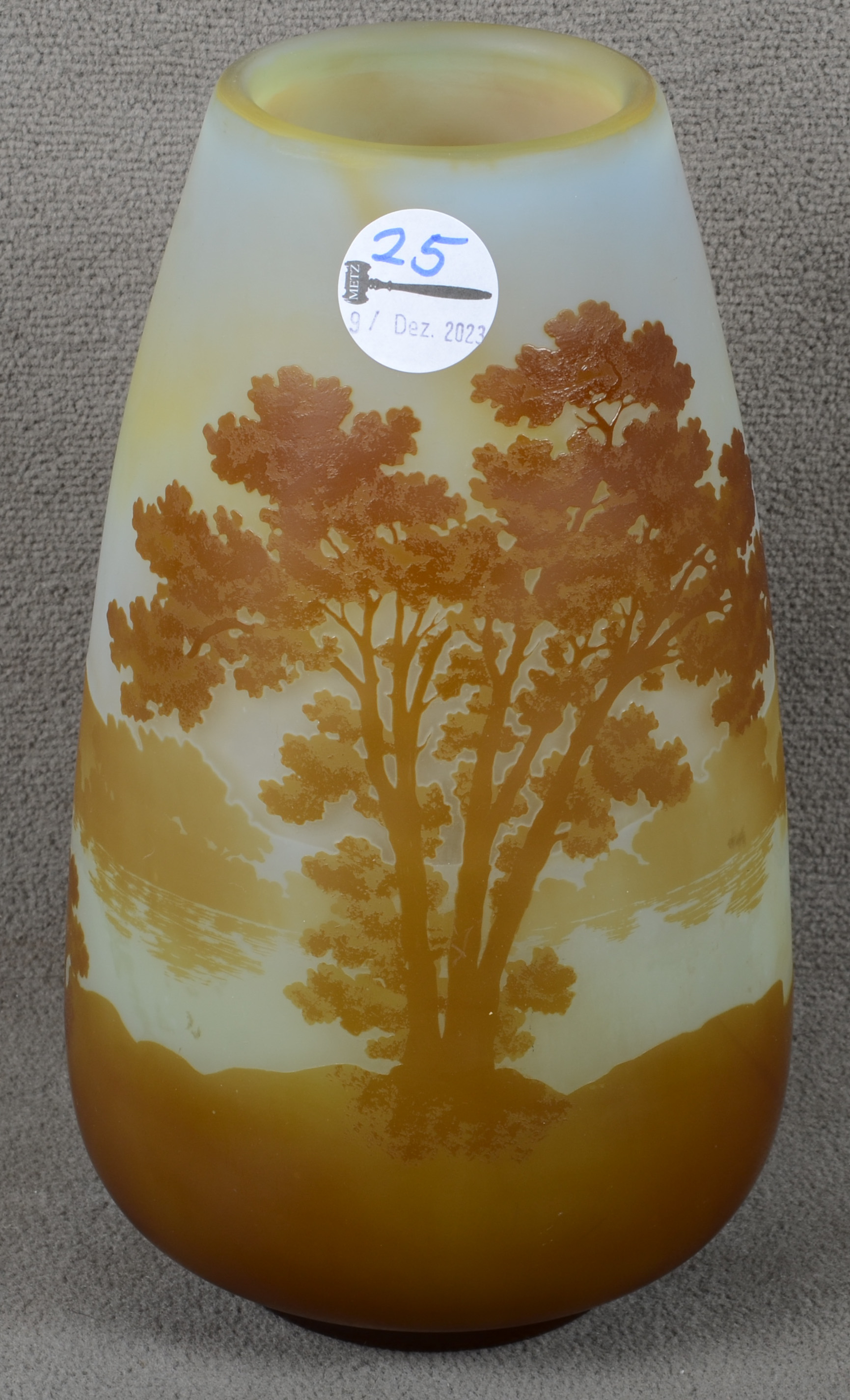 - Katalog-Nr: 25Jugendstil-Vase. Nancy, Émile Gallé um 1900. Farbloses Glas, farbig überfangen, geschnitten mit Uferlandschaft, teilw. poliert; auf der Wandung sign., H=27,8 cm.Orientierungswert: € 3.000,-NO RESERVEo.L.Bitte melden sie sich an, um ein elektronisches Vorgebot abzugeben