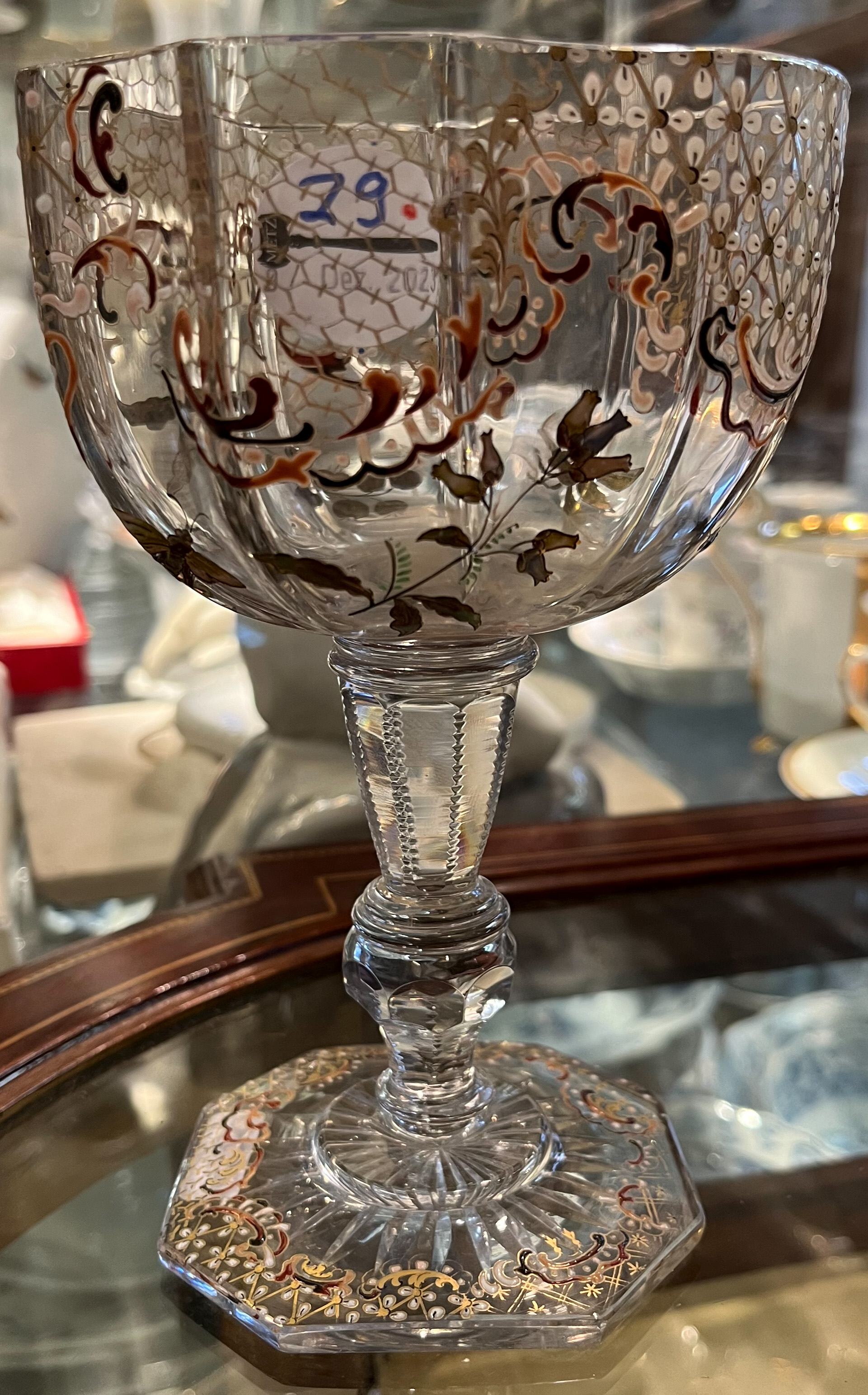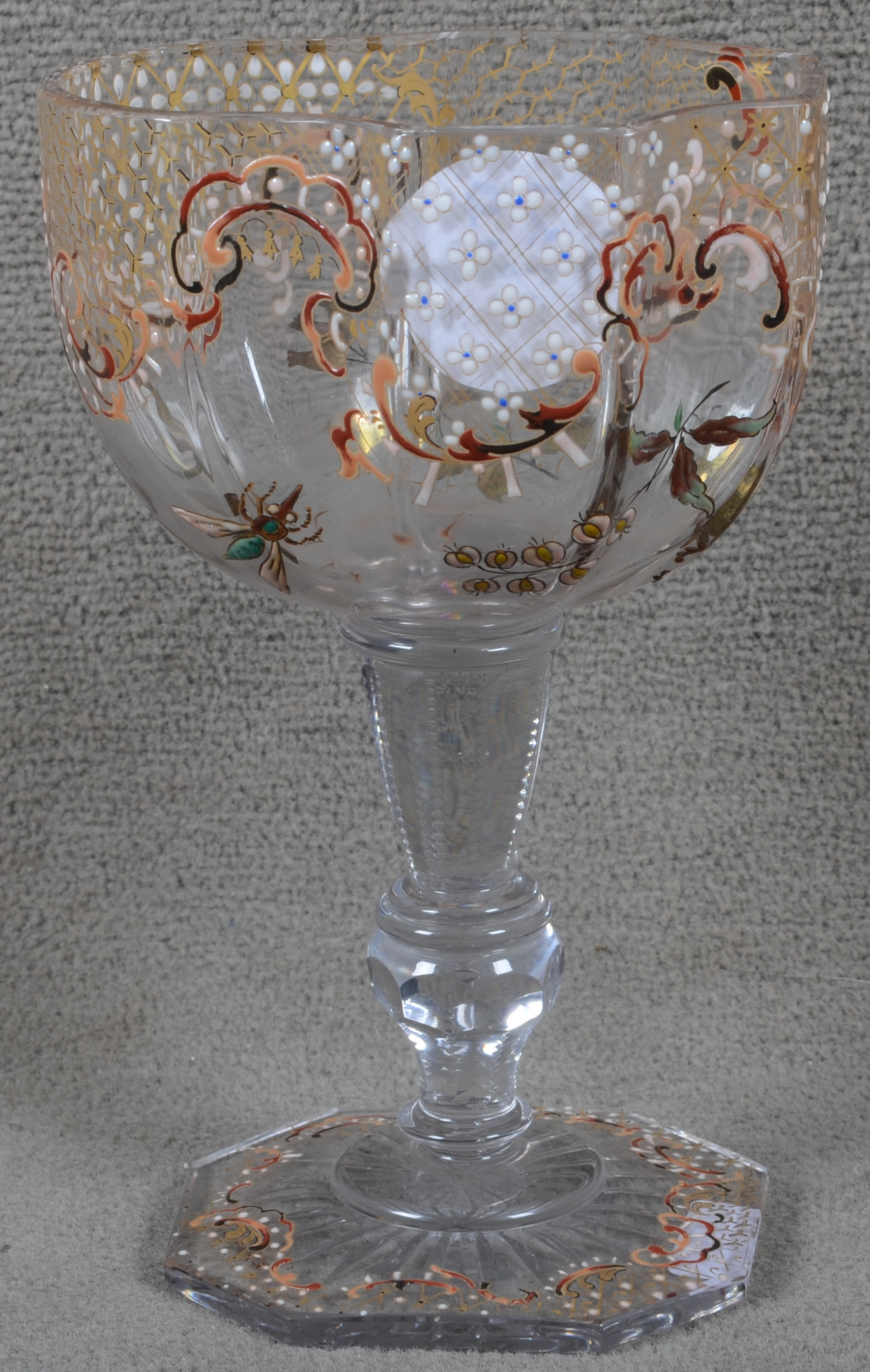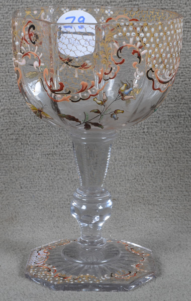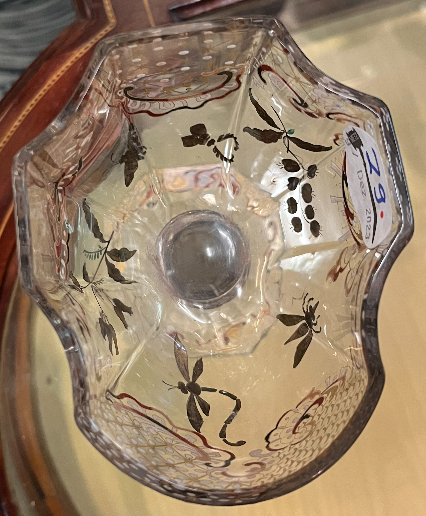 - Katalog-Nr: 29Jugendstil-Pokal. Nancy, Émile Gallé um 1900. Farbloses Glas, farbig emailliert mit Floraldekor und Insekten, breite Goldbordüre; am Boden Ätzsignatur, H=17,2 cm.Orientierungswert: € 1.000,-NO RESERVEo.L.Bitte melden sie sich an, um ein elektronisches Vorgebot abzugeben