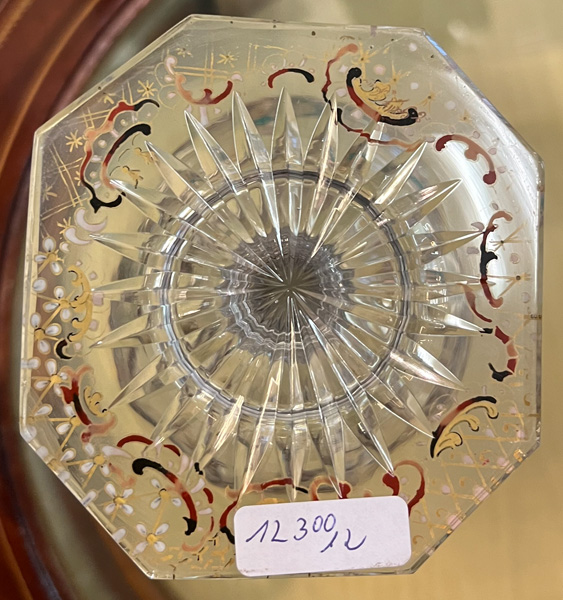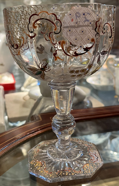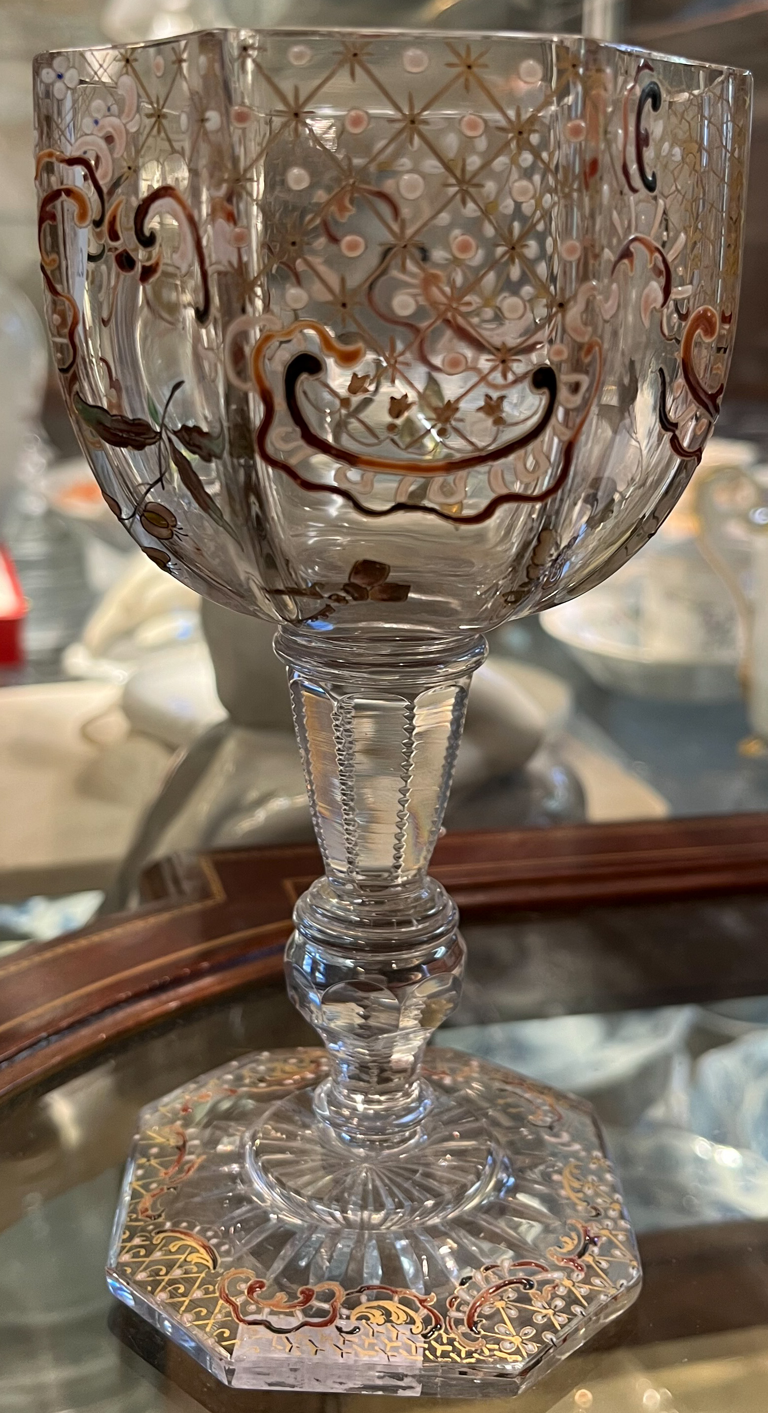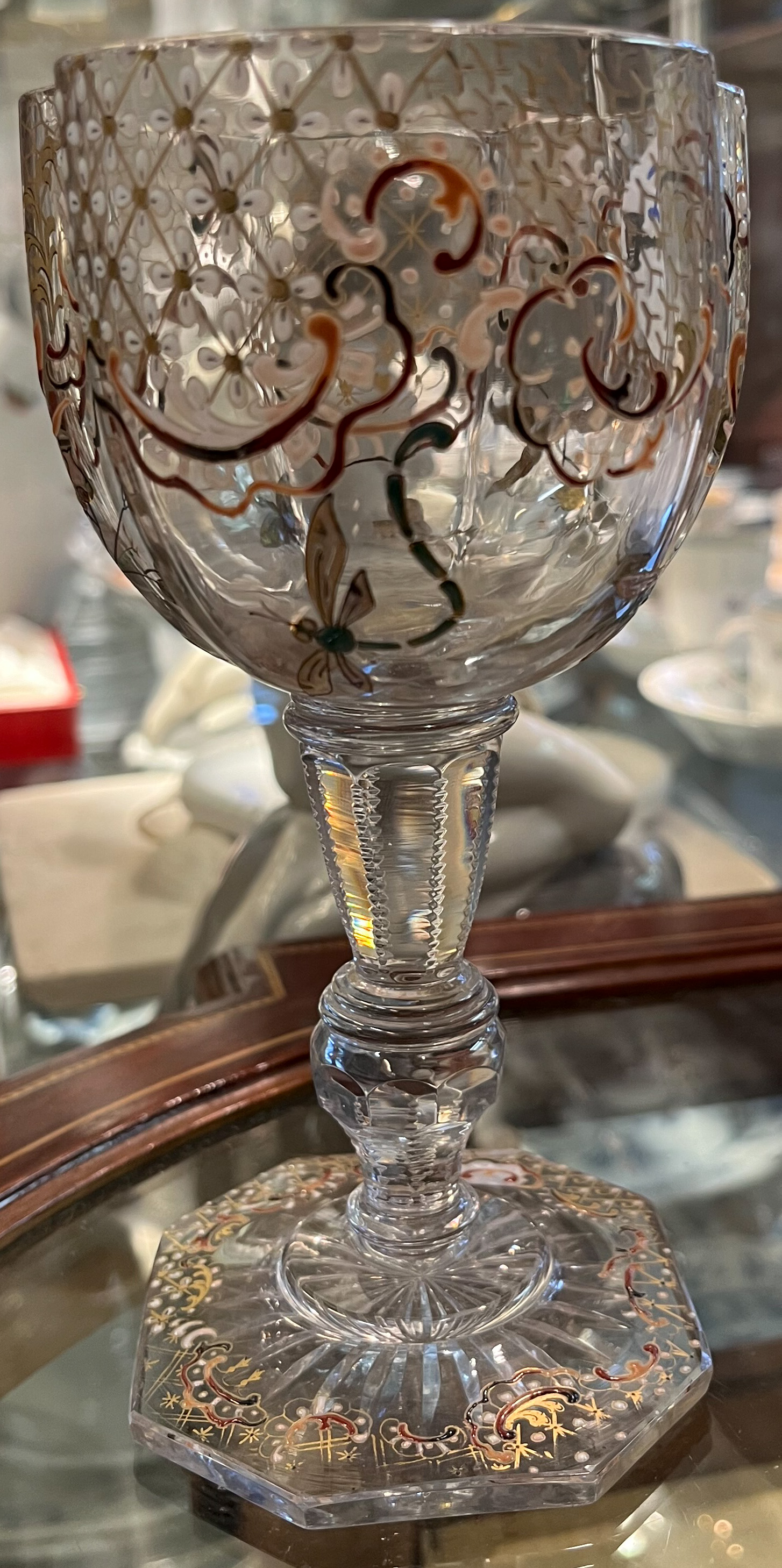 - Katalog-Nr: 29Jugendstil-Pokal. Nancy, Émile Gallé um 1900. Farbloses Glas, farbig emailliert mit Floraldekor und Insekten, breite Goldbordüre; am Boden Ätzsignatur, H=17,2 cm.Orientierungswert: € 1.000,-NO RESERVEo.L.Bitte melden sie sich an, um ein elektronisches Vorgebot abzugeben