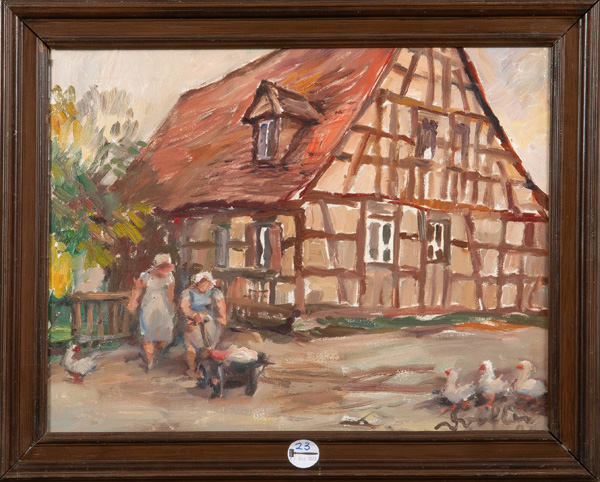 - Katalog-Nr: 23Ludwig Doerfler (1905-1992). Fachwerkgebäude mit Personenstaffage. Öl/Lw., re./u./sign./dat. (19)86, verso Klebeetikett, bez. „Der alte russische Hof Schorndorf“, gerahmt, 41 x 50 cm.o.L.Bitte melden sie sich an, um ein elektronisches Vorgebot abzugeben