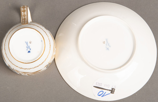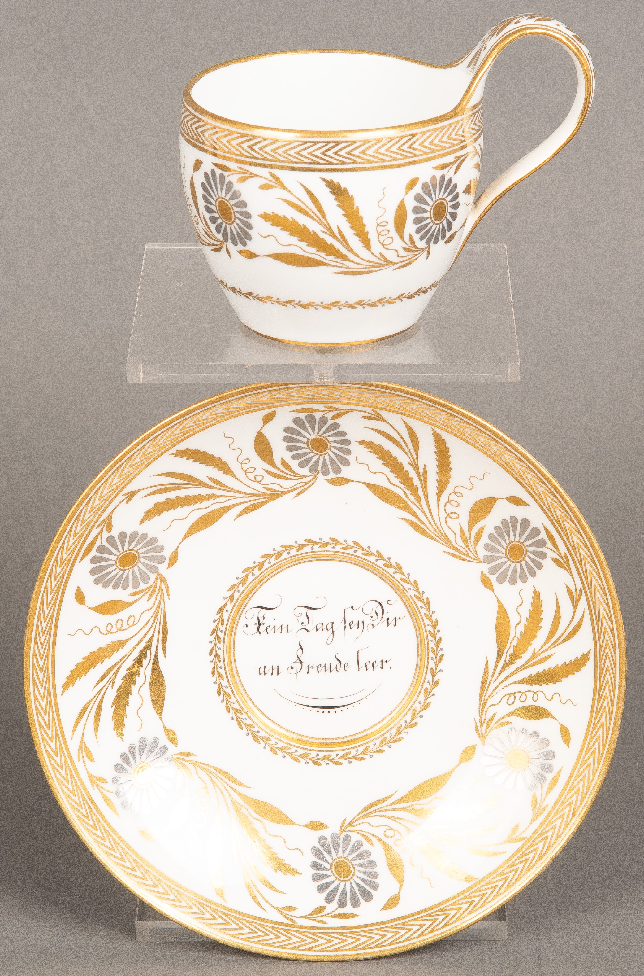 Freundschaftstasse mit Unterschale. Meissen-Marcolini 1774-1814. Porzellan, gold floral bemalt mit Silberlüster. Untertasse beschriftet: „Kein Tag sey Dir an Freude leer".