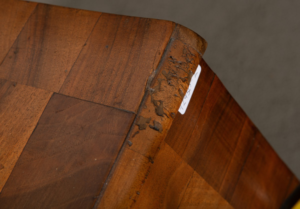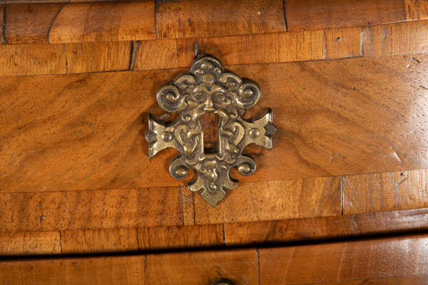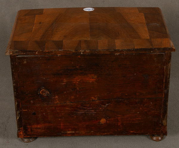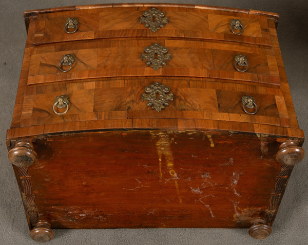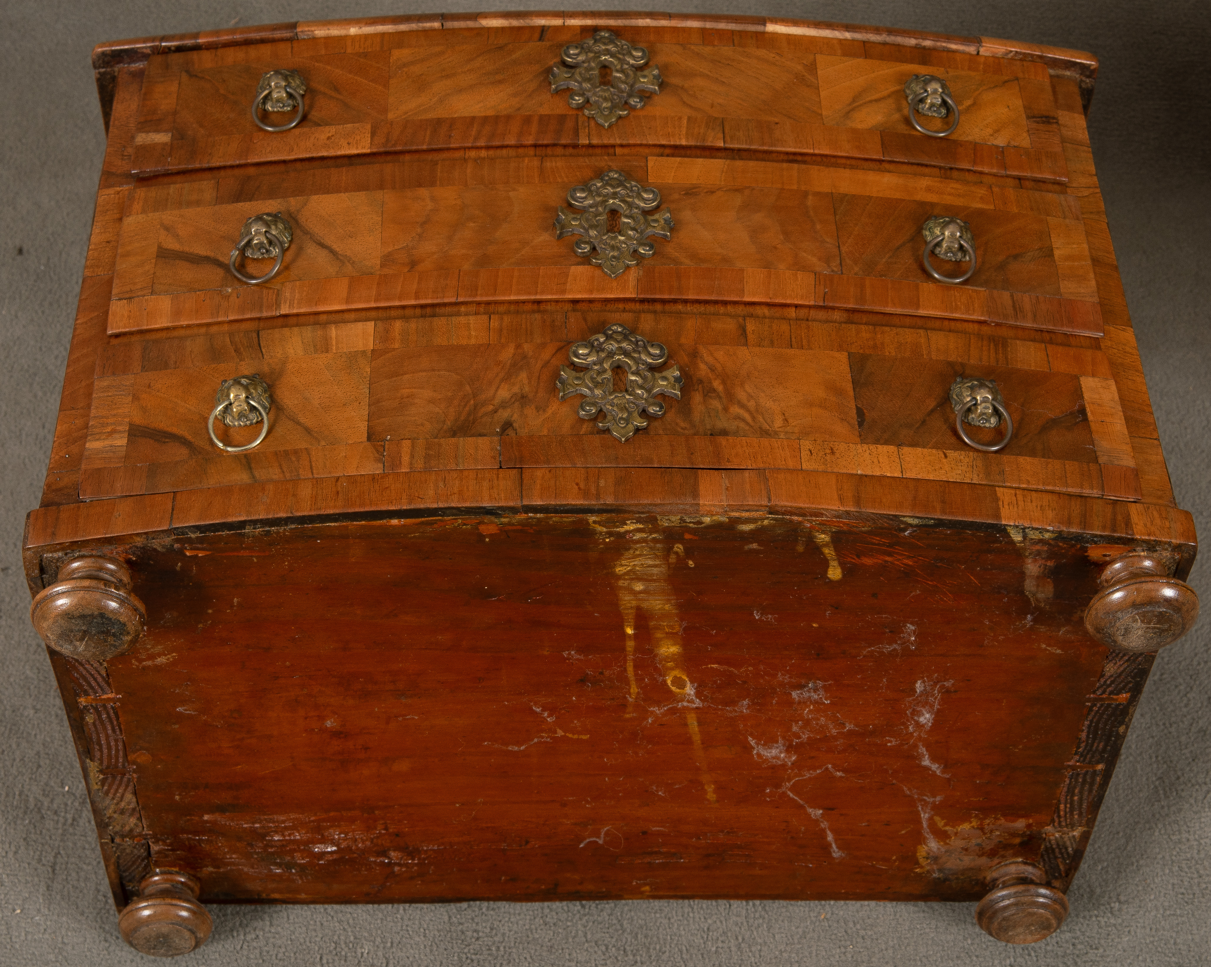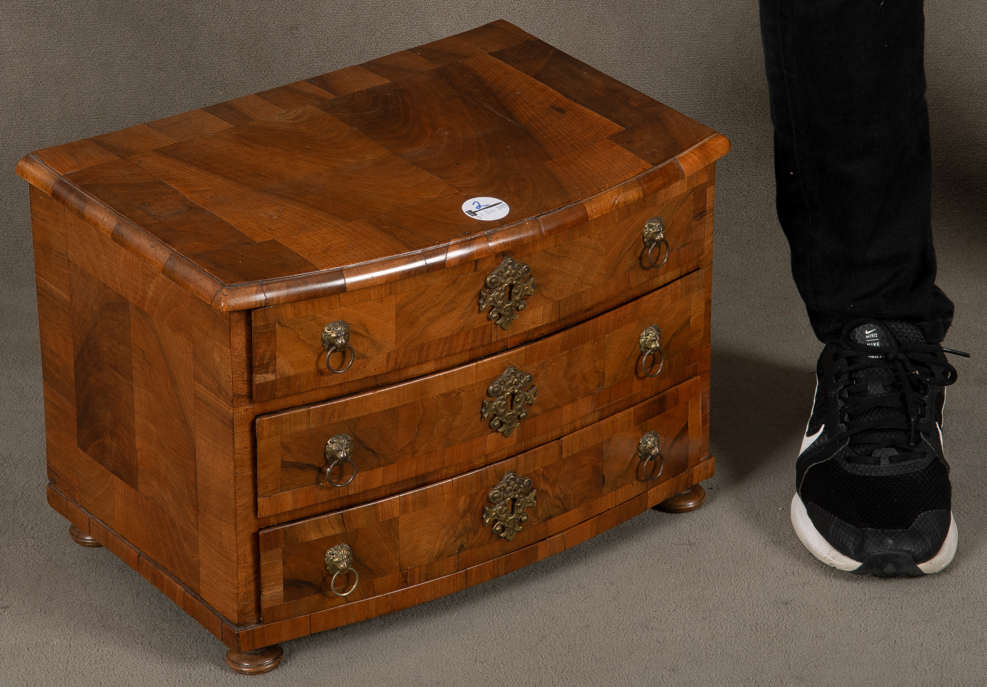 - Katalog-Nr: 2Barock-Modellkommode. Deutsch 18. Jh. Weichholzkorpus, furniert mit Nussbaum, teilw. massiv. Gebauchter Korpus, dreischübige Front, auf Ballenfüßen, mit Originalbeschlägen, H=29,5 cm, B=41,5 cm, T=28 cm.Orientierungswert: € 1.500,-NO RESERVEo.L.Bitte melden sie sich an, um ein elektronisches Vorgebot abzugeben