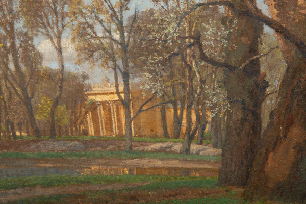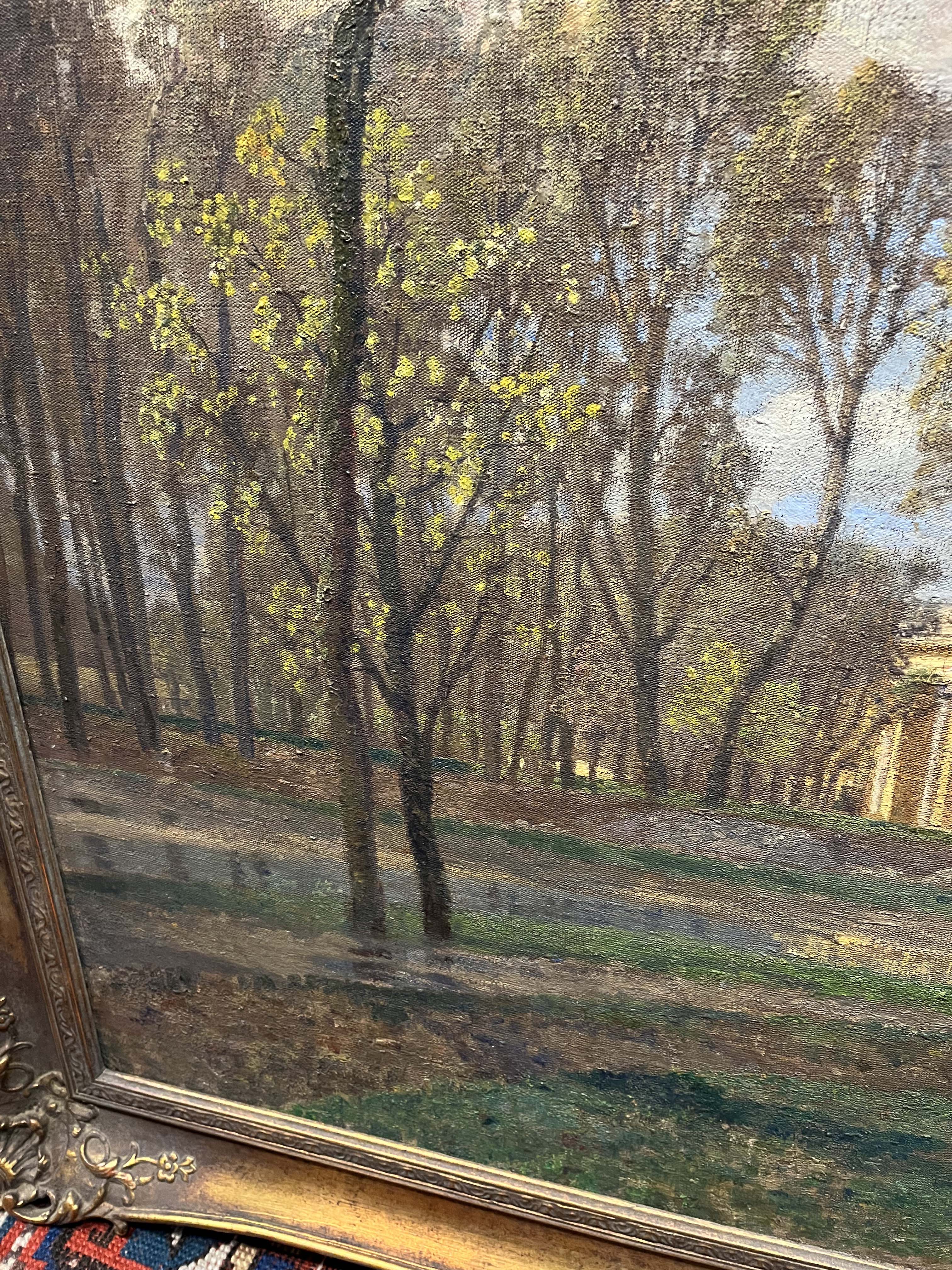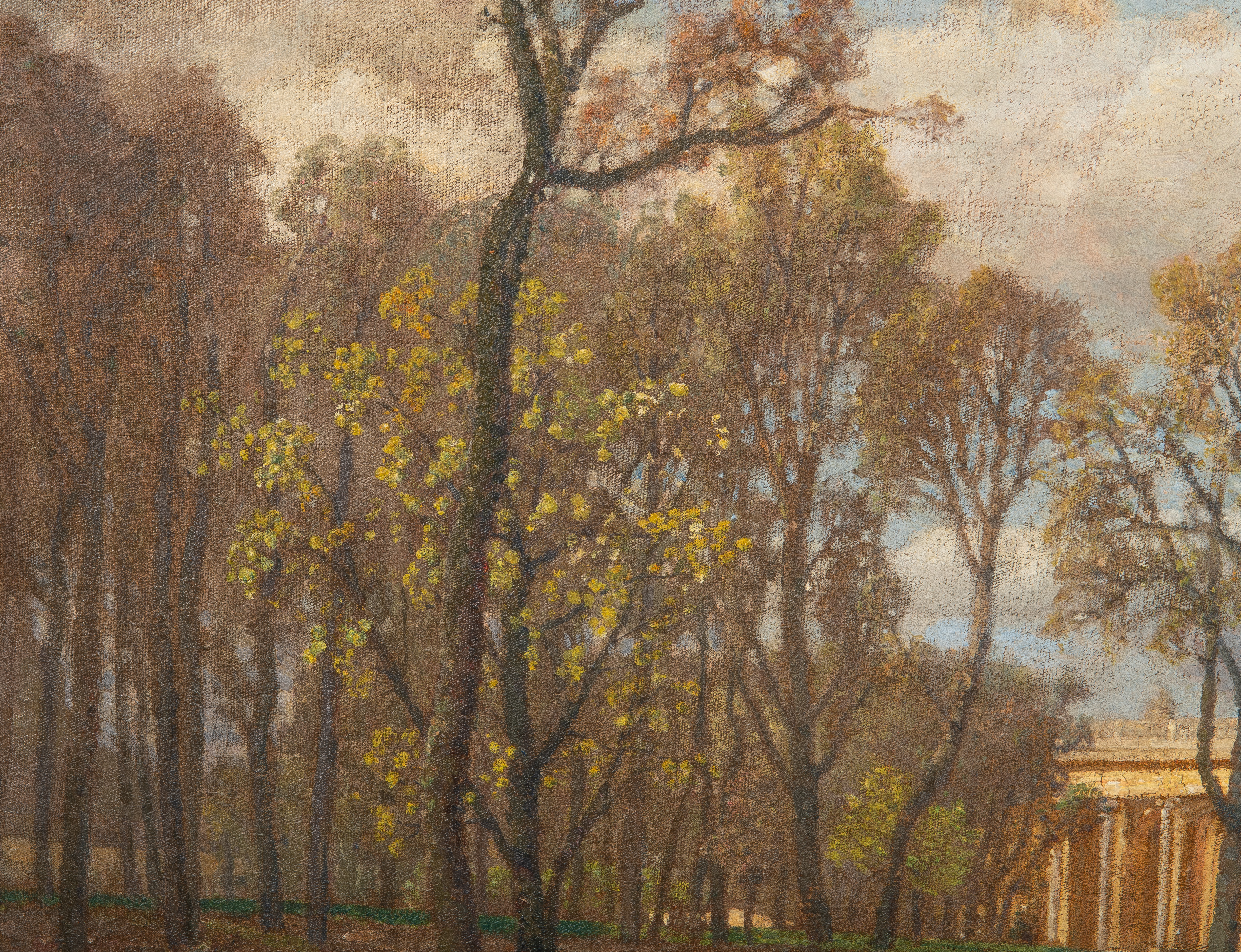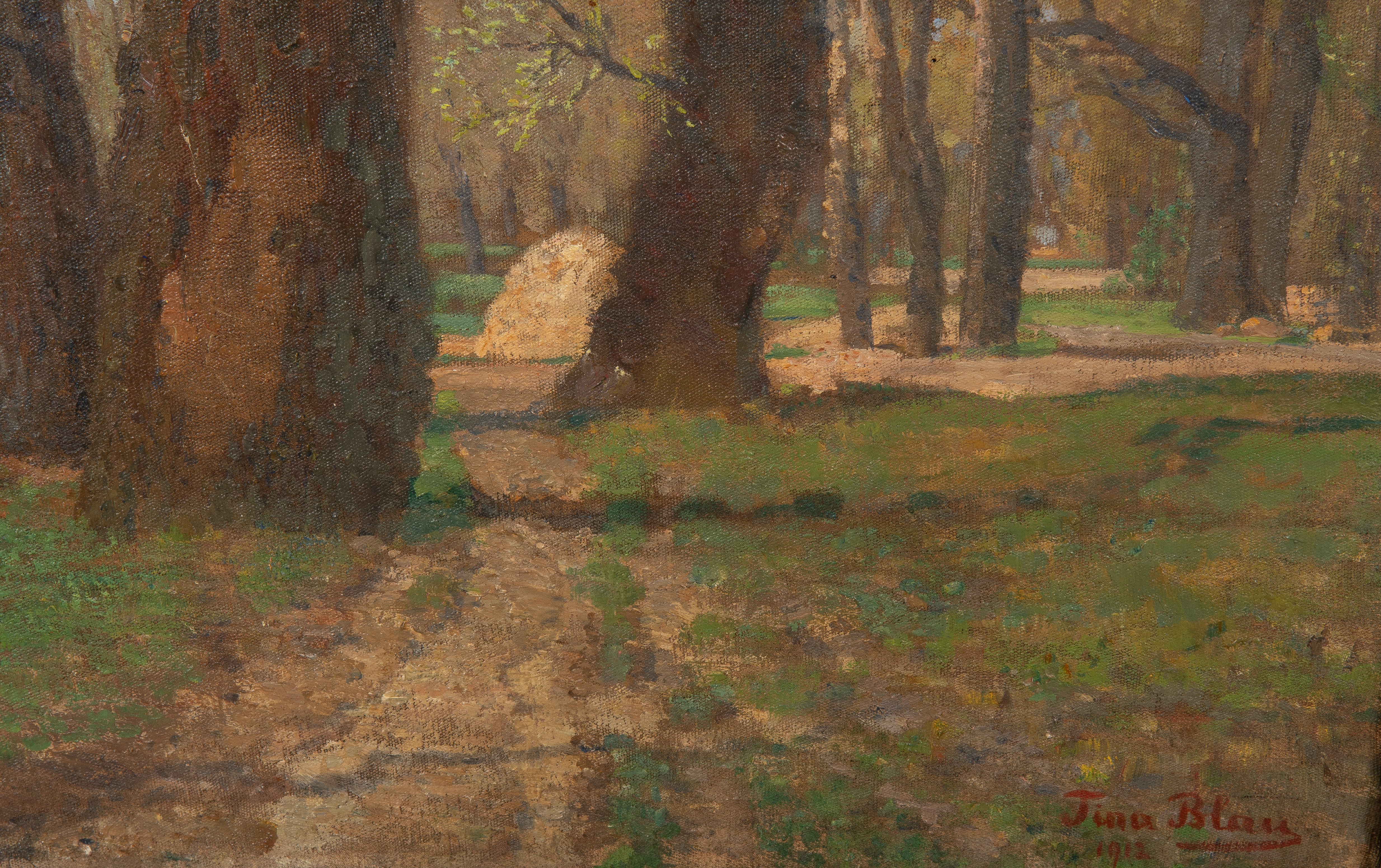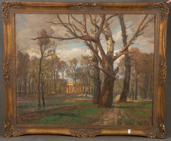 Tina Blau-Lang (1845-1916). Ansicht vom Wiener Prater mit Blick auf den von Carl von Hasenauer entworfenen Pavillon. Öl/Lw., re./u./sign./dat. 1912, gerahmt, 95 x 115 cm. **