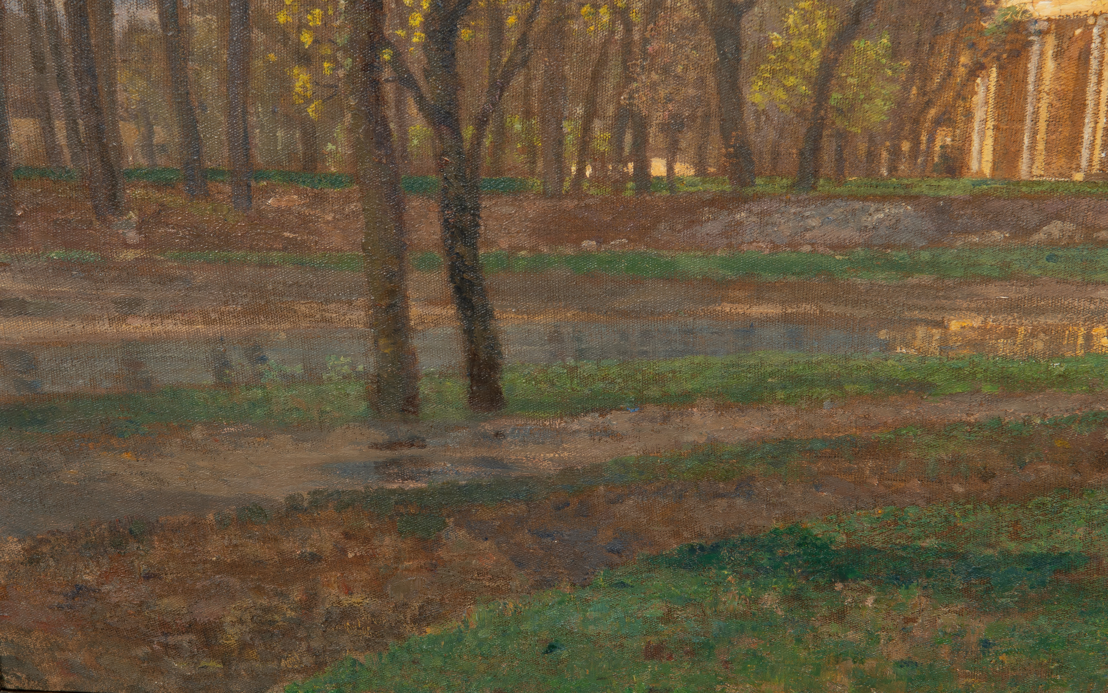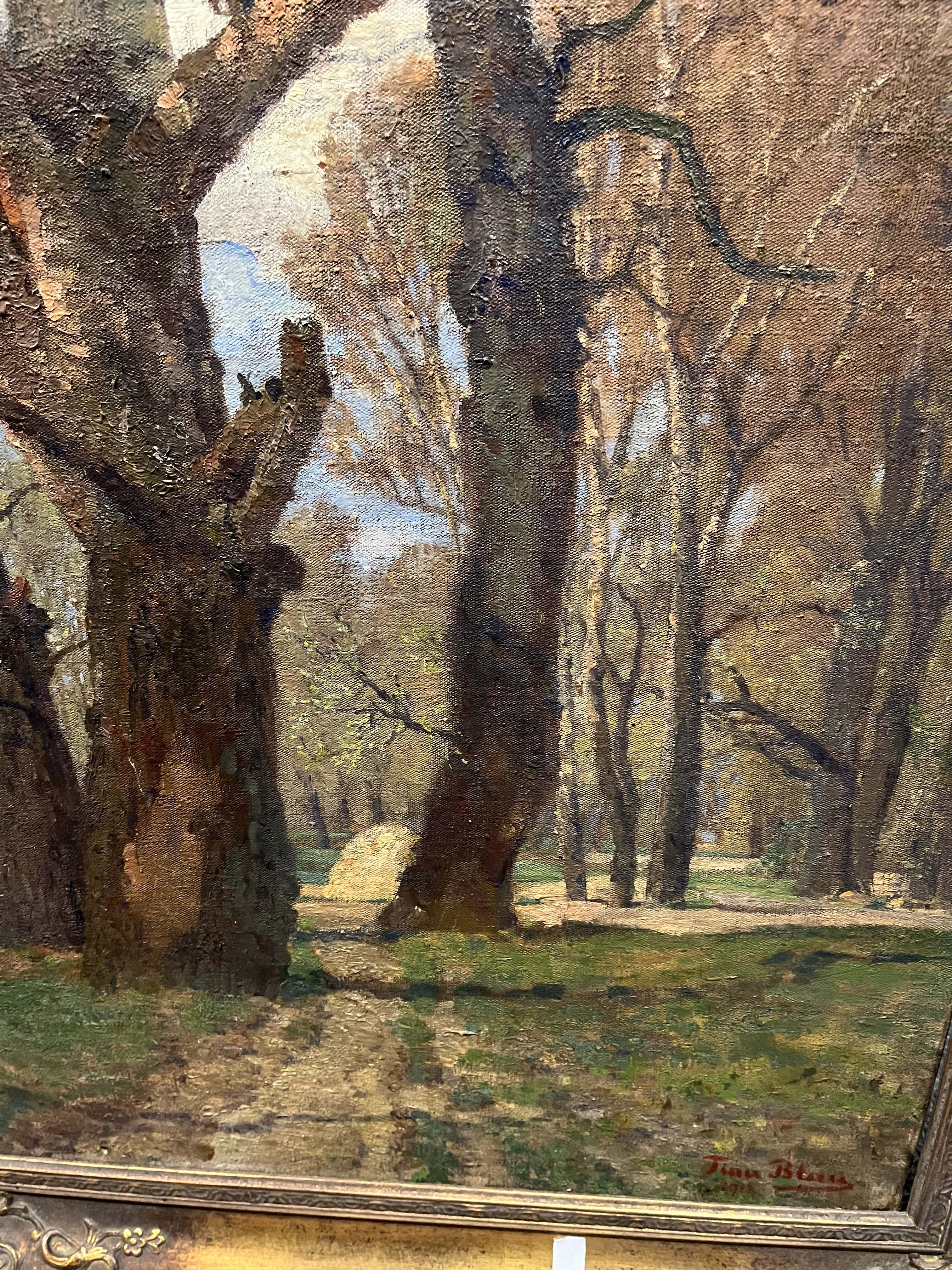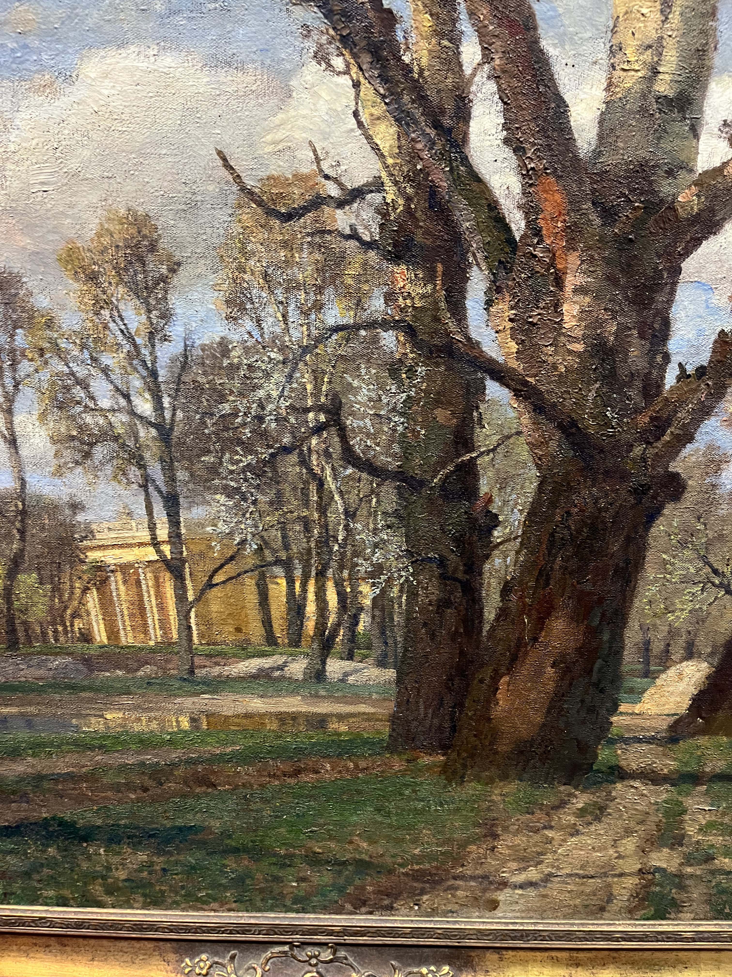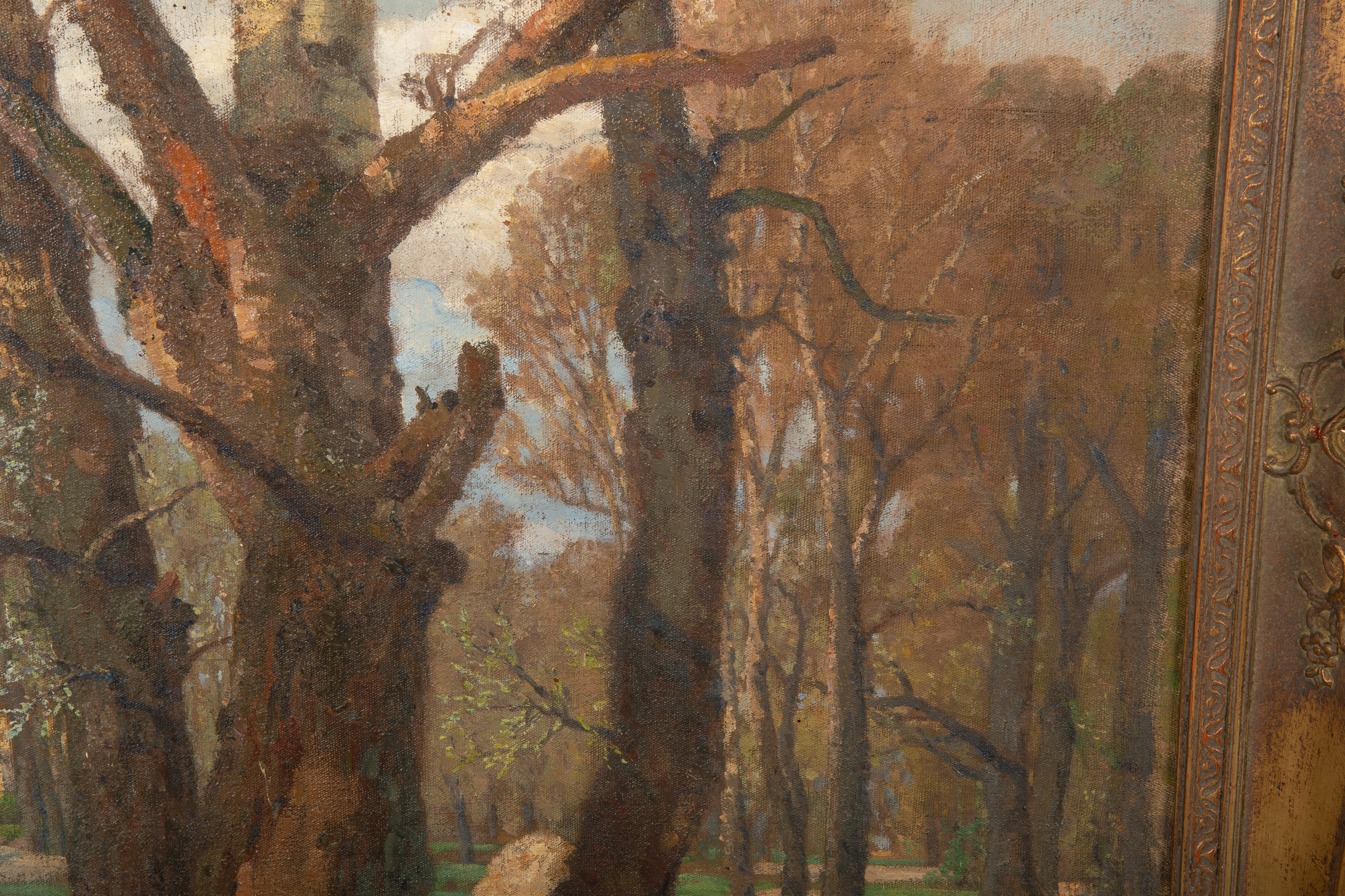 Tina Blau-Lang (1845-1916). Ansicht vom Wiener Prater mit Blick auf den von Carl von Hasenauer entworfenen Pavillon. Öl/Lw., re./u./sign./dat. 1912, gerahmt, 95 x 115 cm. **