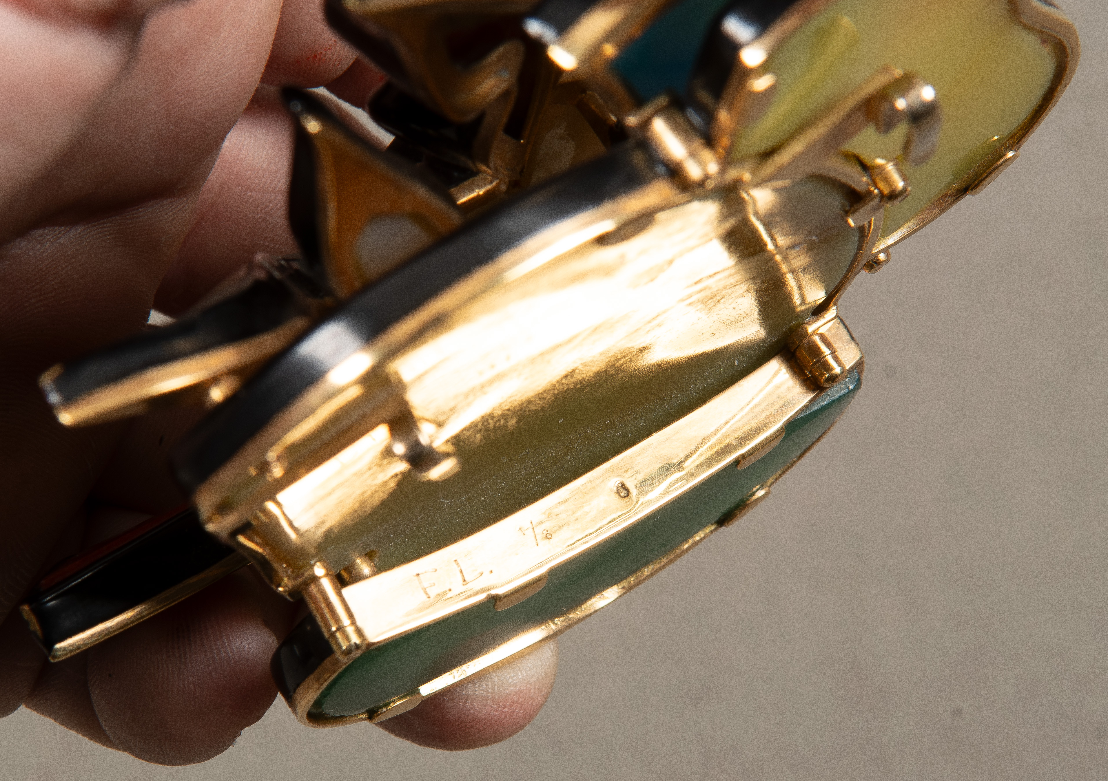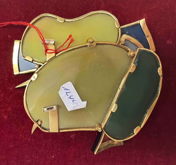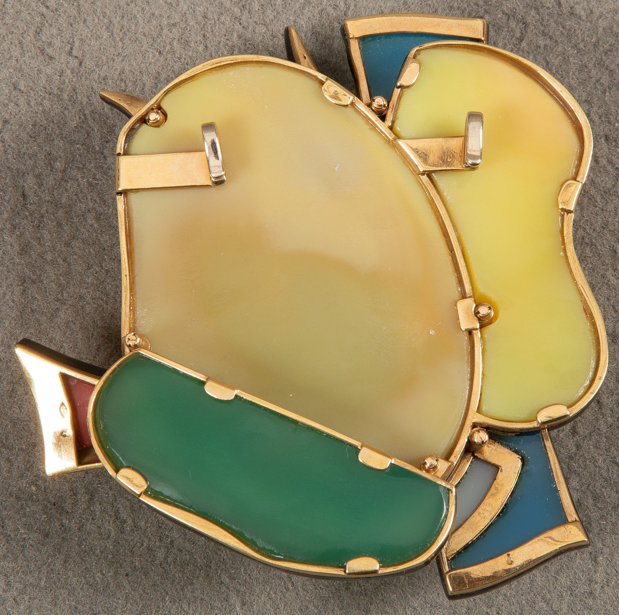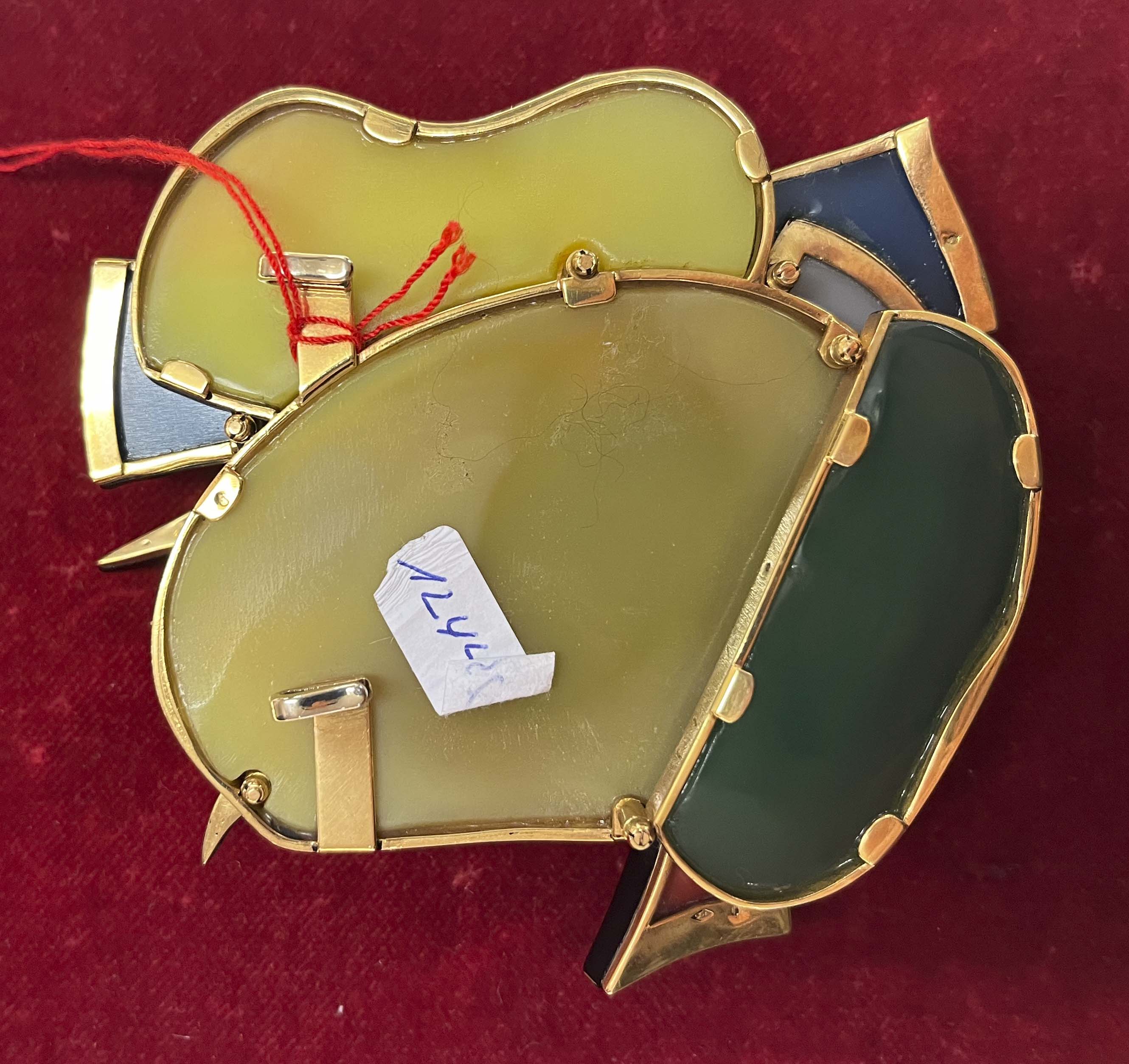 Gürtelschließe von Fernand Léger (1881-1955). Verschiedenfarbige Achate und Koralle in Gelbgoldfassung, verso monogr./bez. „F.L. 1/8“, H=9 cm, B=9,5 cm, T=3,6 cm. (kleine Absplitterungen)