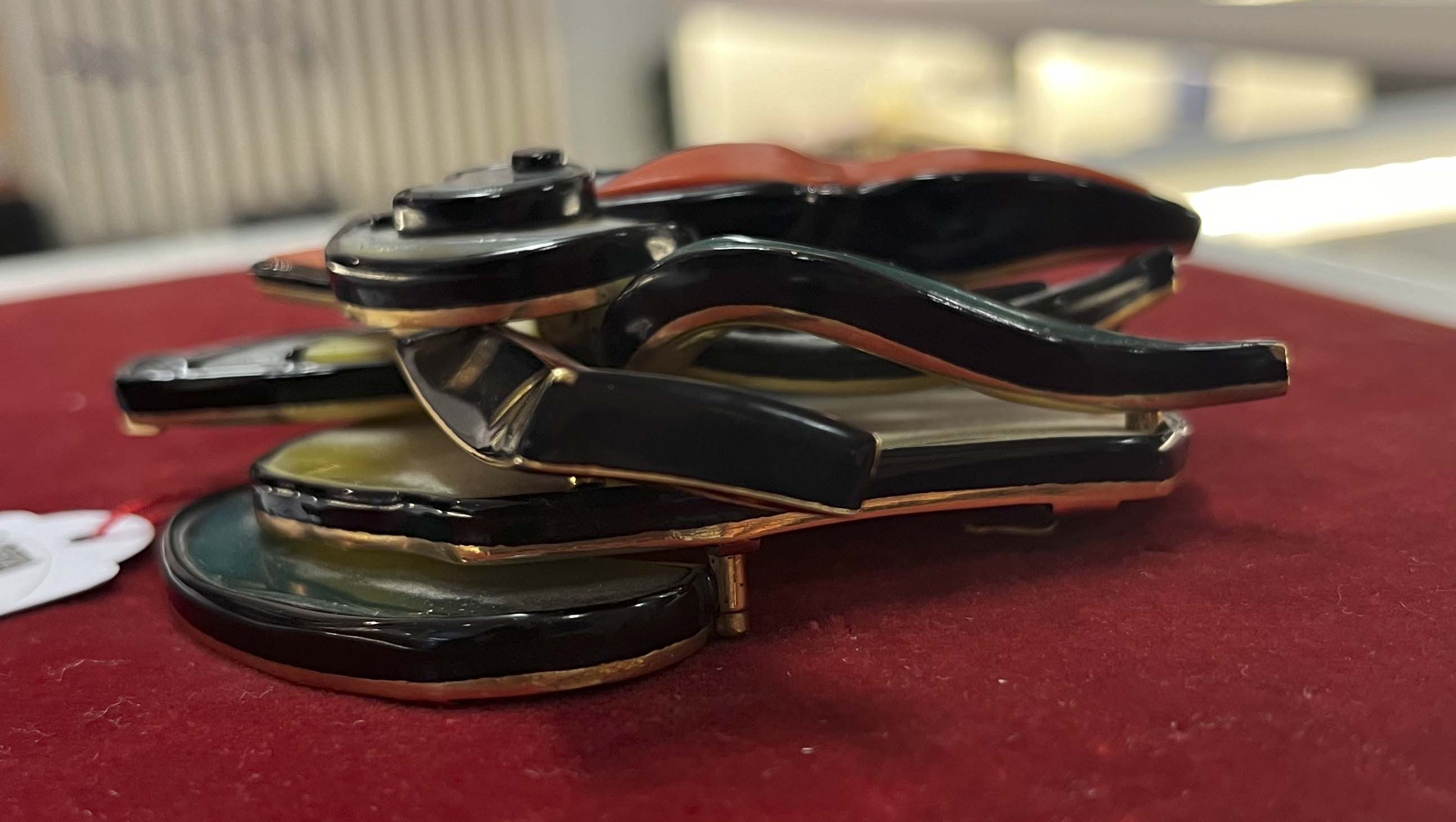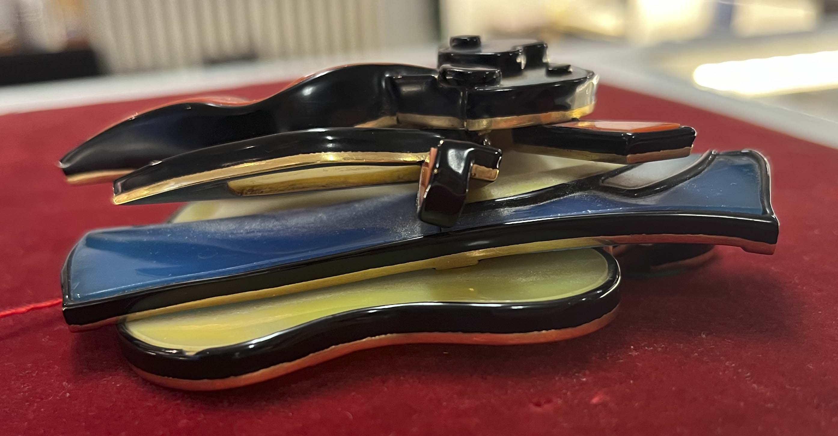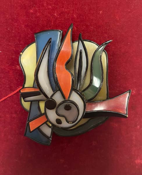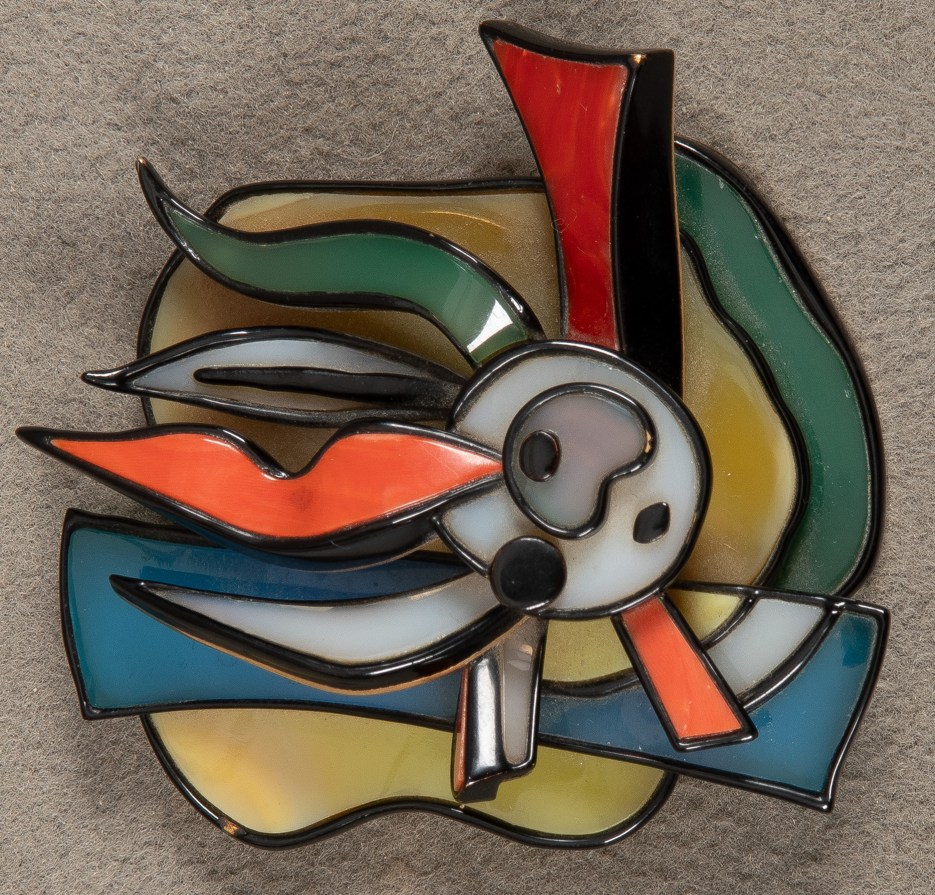 Gürtelschließe von Fernand Léger (1881-1955). Verschiedenfarbige Achate und Koralle in Gelbgoldfassung, verso monogr./bez. „F.L. 1/8“, H=9 cm, B=9,5 cm, T=3,6 cm. (kleine Absplitterungen)