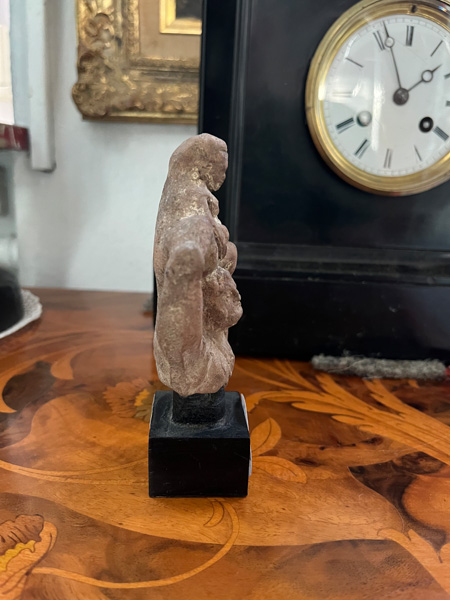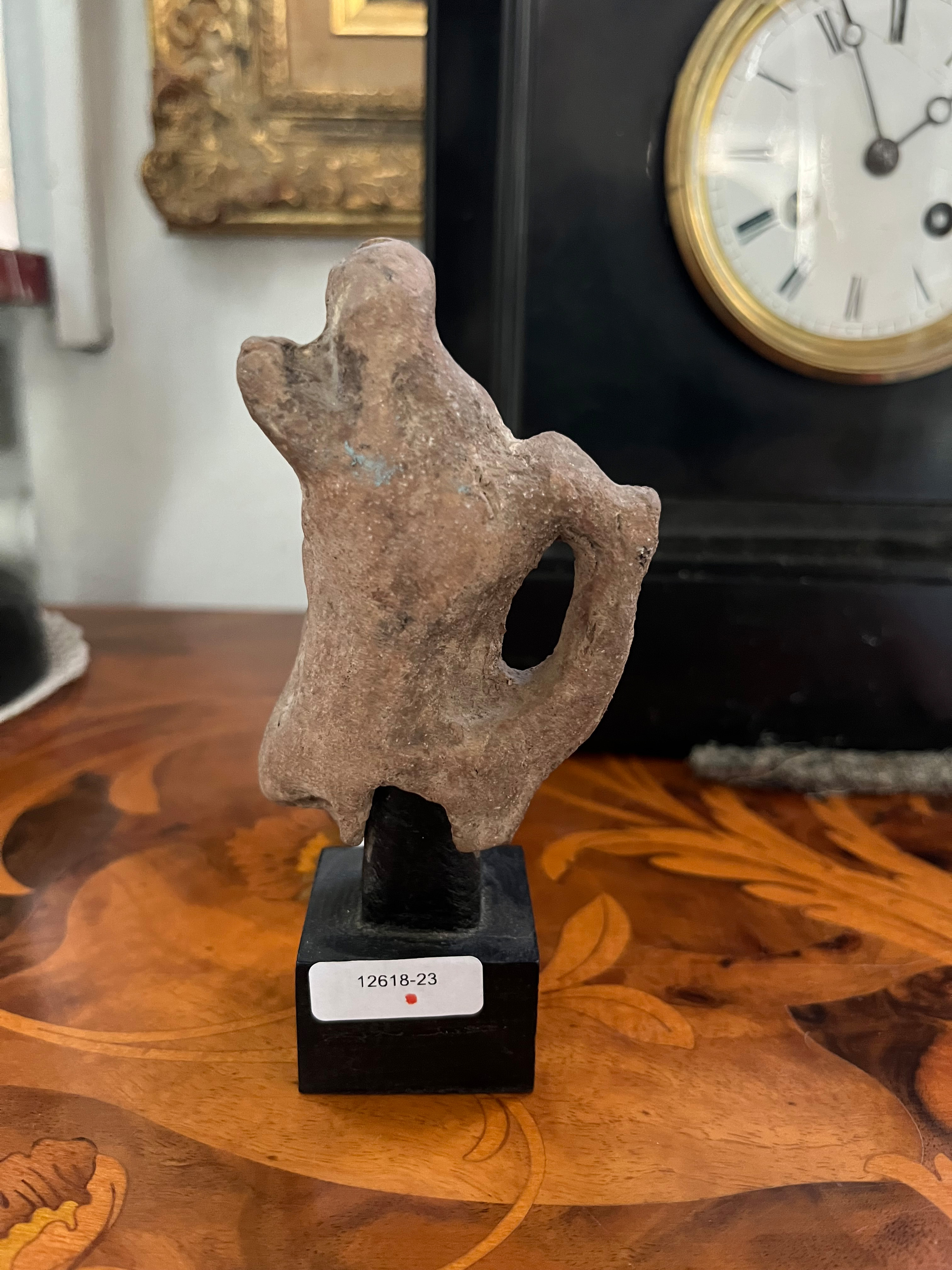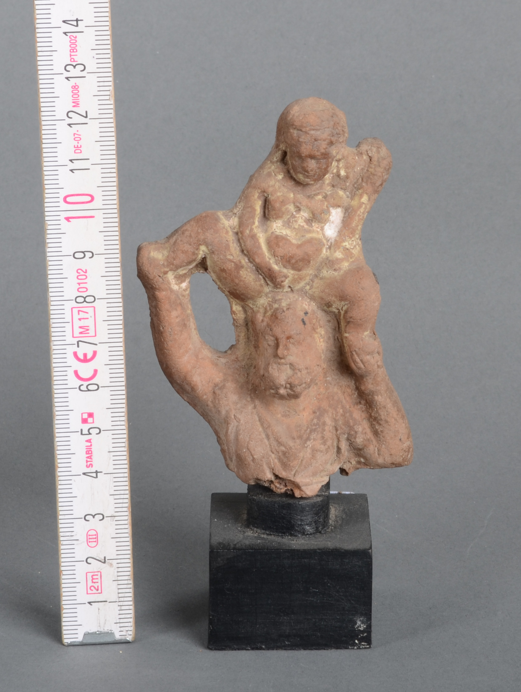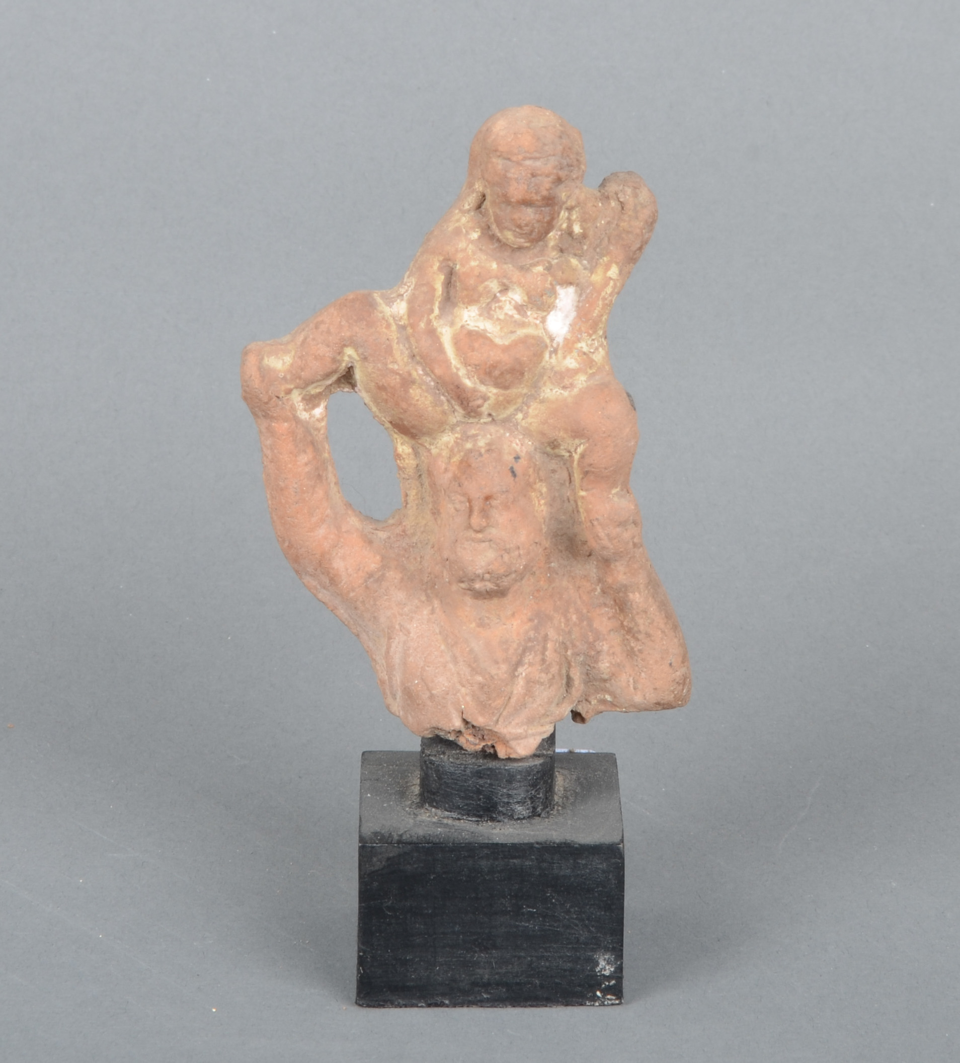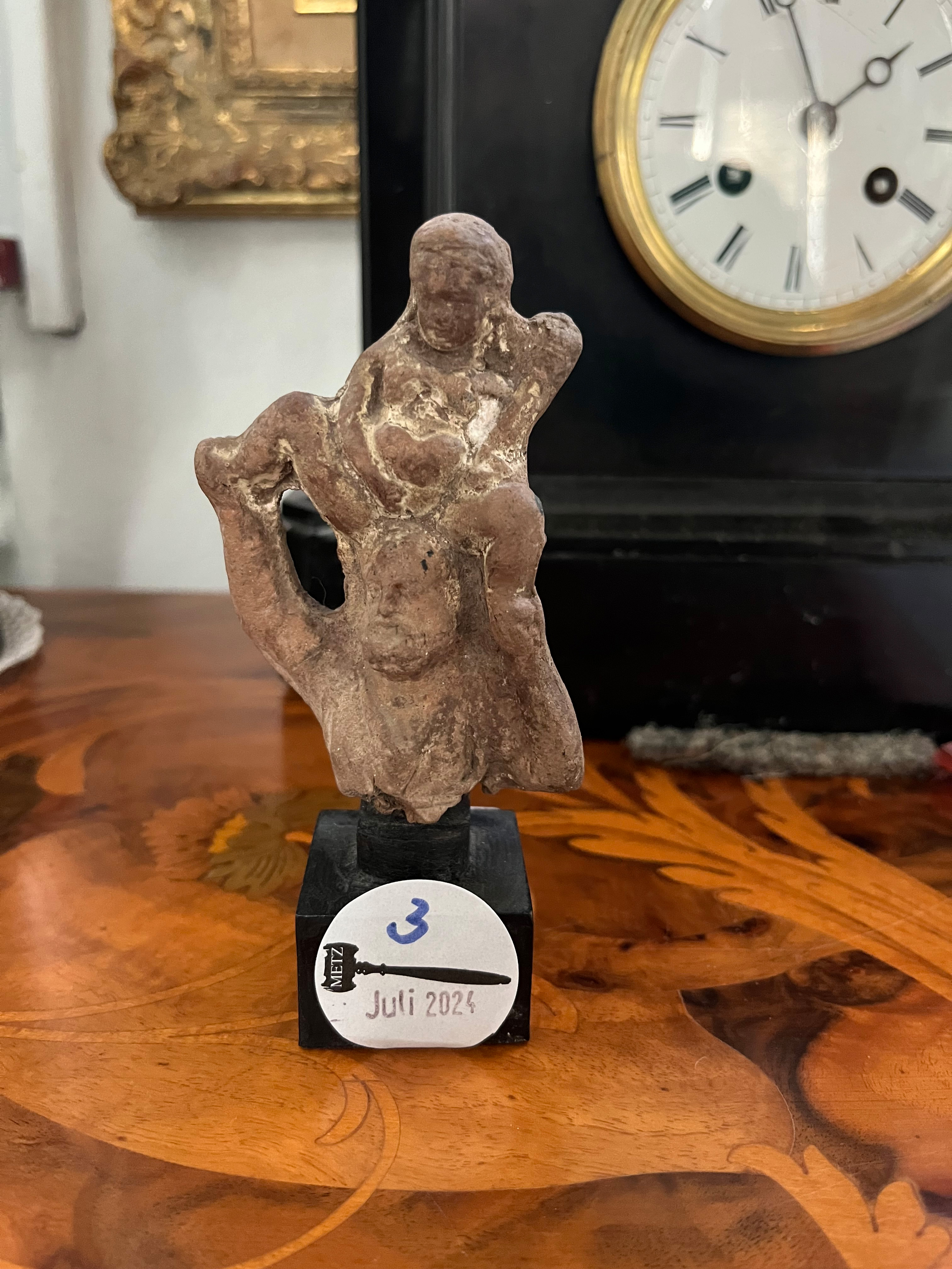 - Katalog-Nr: 3Hellenistisches Figurenfragment des Silenos mit dem jungen Dionysos. Wohl Tanagra 3./2. Jh. v. Chr. Keramik, H=9 cm (ohne Sockel). Provenienz: Seit den 1970er Jahren in Heidelberger Privatbesitz. (Altersspuren)o.L.Bitte melden sie sich an, um ein elektronisches Vorgebot abzugeben