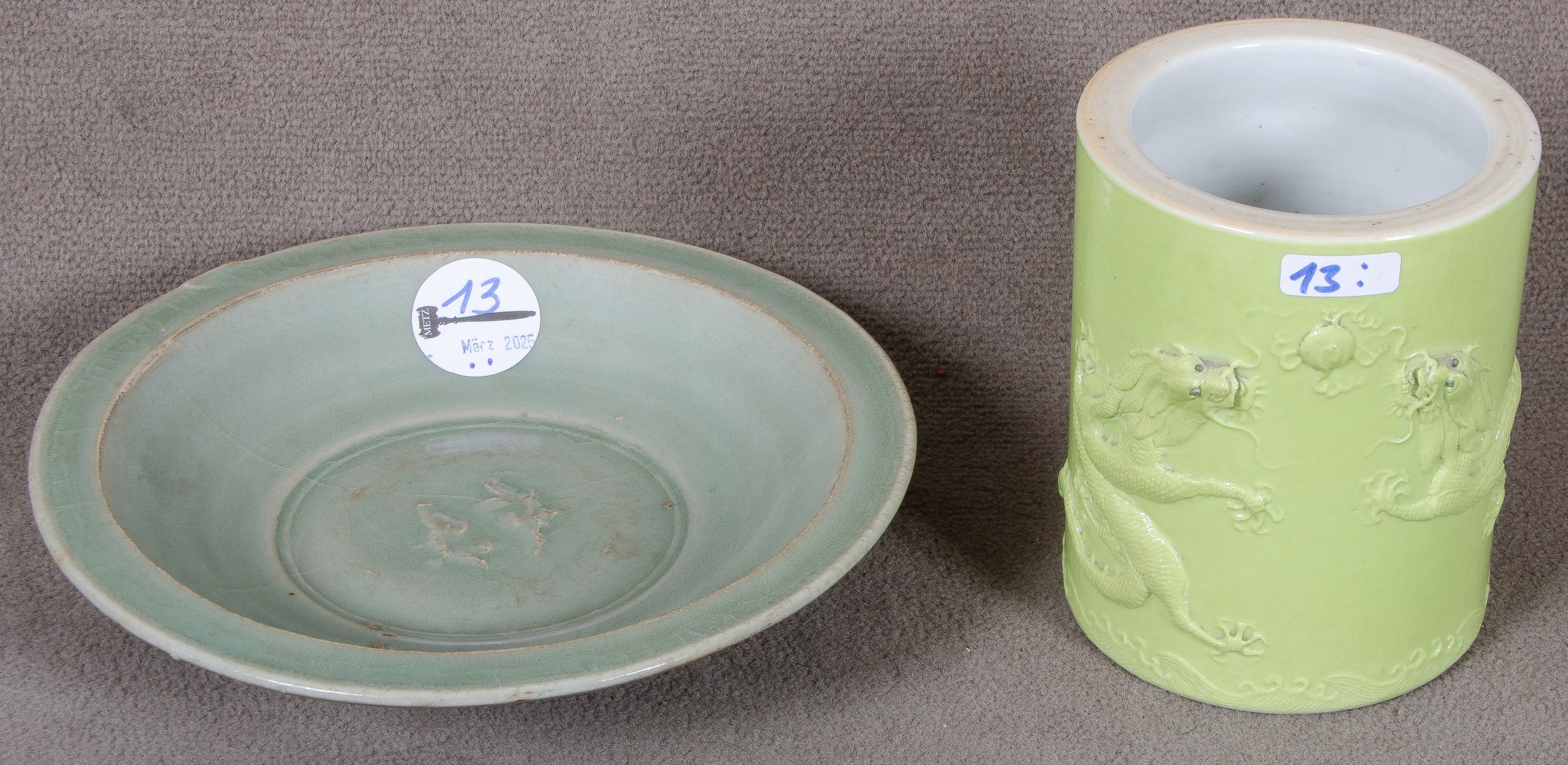 - Katalog-Nr: 13Pinselbecher. China 18. Jh. Porzellan, hellgrün glasiert und reliefiert mit Drachendekor; am Boden gemarkt (H=12,7 cm), Provenienz: Auktionshaus Hauswedell & Nolte, Hamburg 29.4.1972, S. 12, Nr. 107; dazu Steinzeug-Schale, H=4,5 cm, D=20 cm. (Schale mit Glasursprüngen)o.L.Bitte melden sie sich an, um ein elektronisches Vorgebot abzugeben