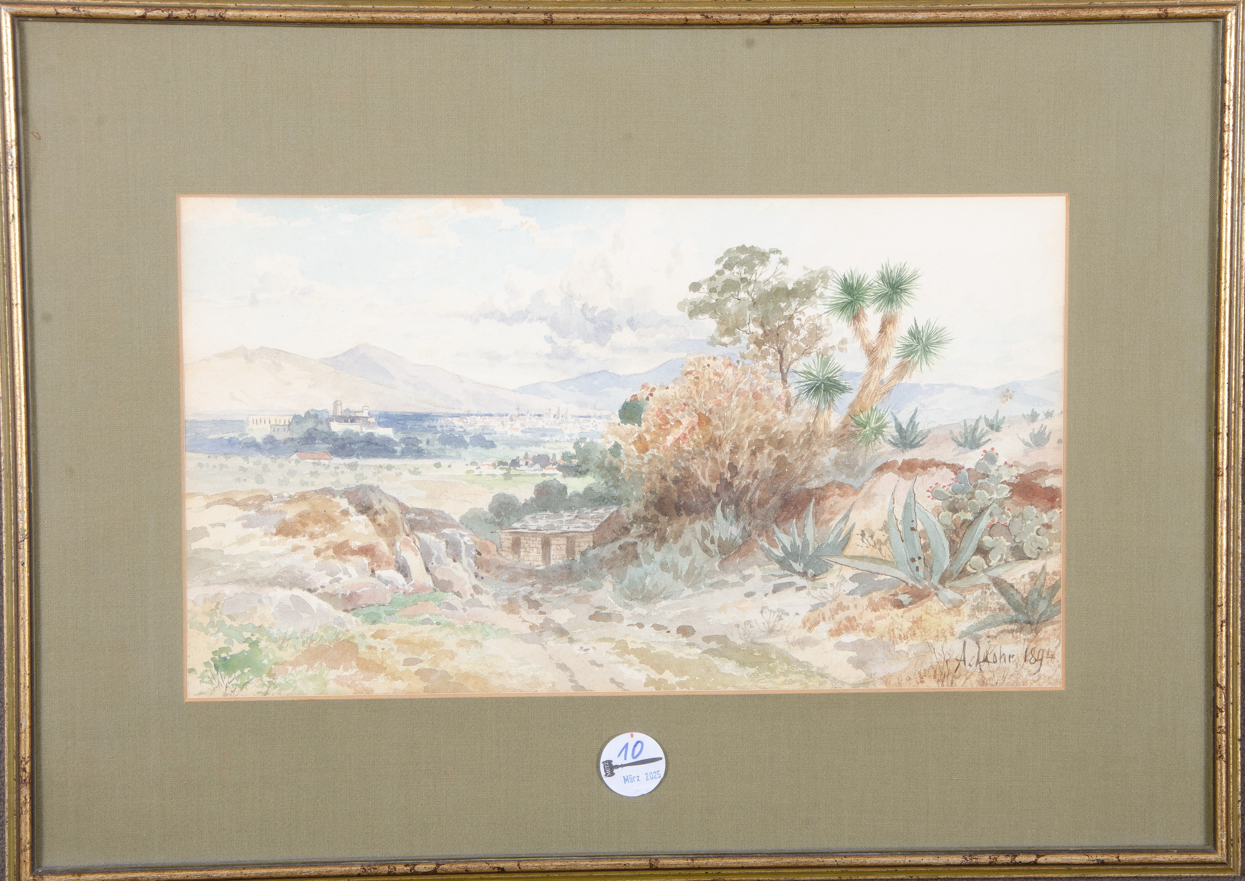 - Katalog-Nr: 10August Lohr (1842-1920). Mexikanische Landschaft mit Stadtvedute im Hintergrund. Aquarell/Papier, re./u./sign./dat. 1894, mit Passepartout hi./Gl. gerahmt, 23,5 x 41 cm.o.L.Bitte melden sie sich an, um ein elektronisches Vorgebot abzugeben