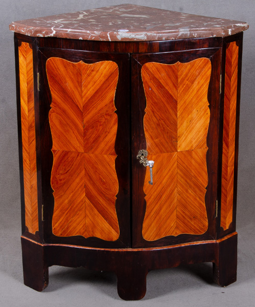 - Katalog-Nr: 24Eckschrank. Frankreich 18. Jh. Mit exotischen Hölzern furniert, Marmorplatte; ausgesägte Füße und Zarge, zweitürig, gewellte Front, abgeschrägte Seiten, H=85 cm, ST=51,5 cm. (Schlüssel vorhanden)o.L.Bitte melden sie sich an, um ein elektronisches Vorgebot abzugeben