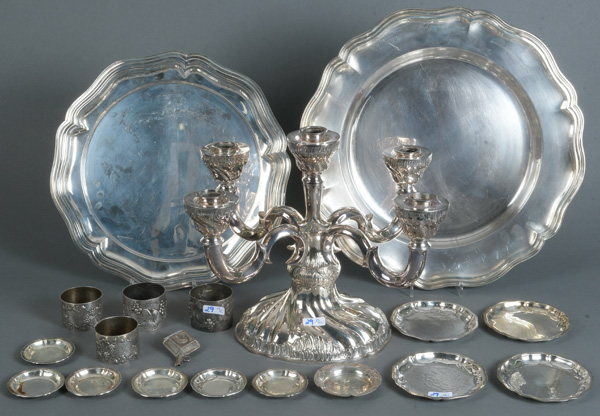 - Katalog-Nr: 2919-tlgs. Konvolut 800er / 835er Silber, ca. 3.040 g; verso gepunzt. Deutsch um 1900. Bestehend aus: Zwei runde Platten (D=30 / 36,5 cm), eine fünfflammige Girandole (H=26 cm, D=34 cm), vier Serviettenringe, vier Untersetzer (D=10,5 cm), sechs Untersetzer (D=6 cm), ein Schälchen (D=7,5 cm) und eine Kinderrassel.o.L.Bitte melden sie sich an, um ein elektronisches Vorgebot abzugeben